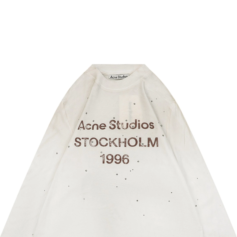 The Acne Studios 1996 Rhinestone Logo Shirt – White blends minimalist Scandinavian style with a vintage streetwear edge. Cut from soft cotton in a relaxed silhouette, it features a cracked “Acne Studios STOCKHOLM 1996” chest print with embedded rhinestone detailing. The distressed finish and scattered pinholes add texture and character, creating a worn-in, nostalgic vibe that elevates casual layering.