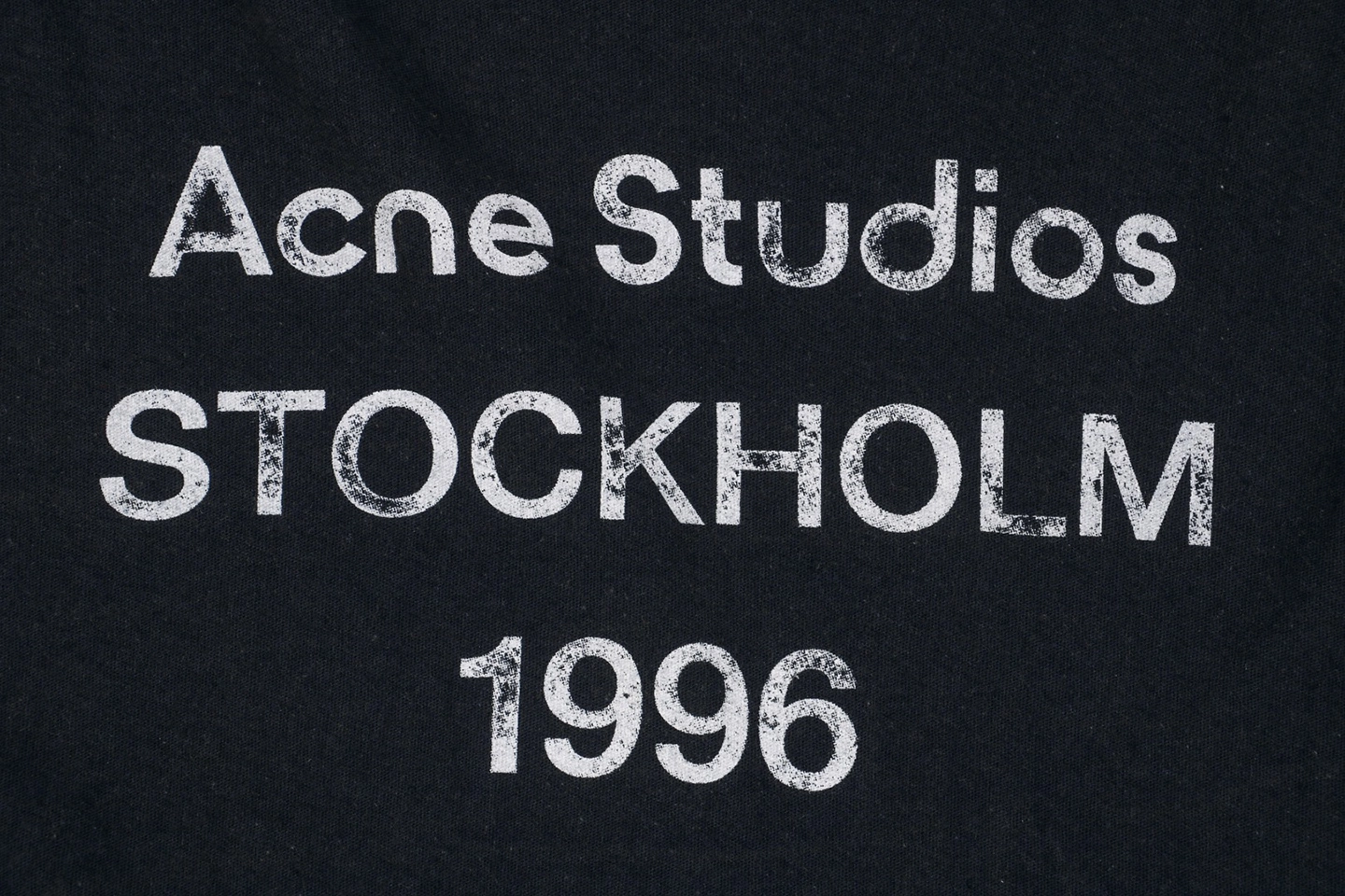 Acne Studios 1996 Stockholm Distressed Letter Print T-shirt exemplifies Scandinavian minimalism with a vintage twist. The front showcases a distressed-style “Acne Studios STOCKHOLM 1996” print, paying homage to the brand’s founding heritage. Crafted from premium cotton, this tee provides a soft yet structured feel, ideal for casual wear with an edge. The clean black canvas and weathered typography evoke a timeless, lived-in aesthetic.