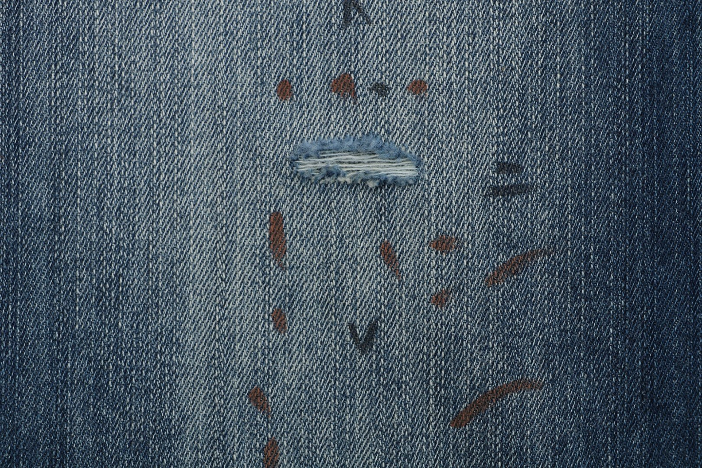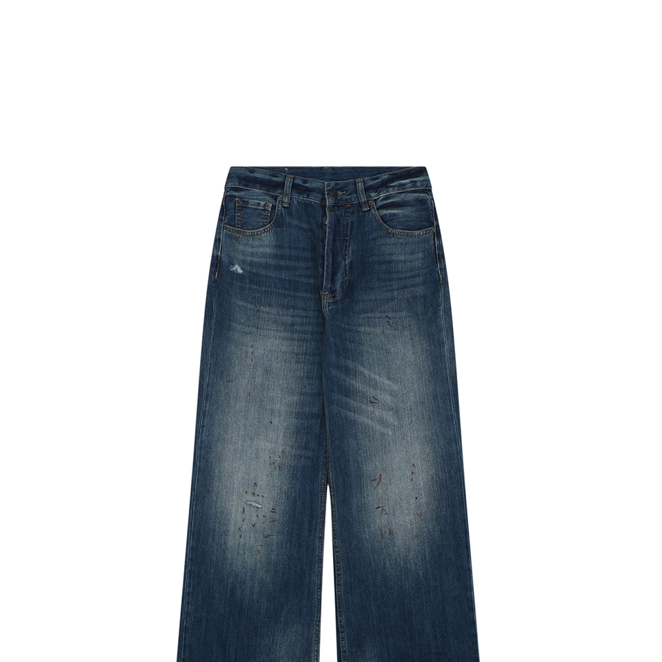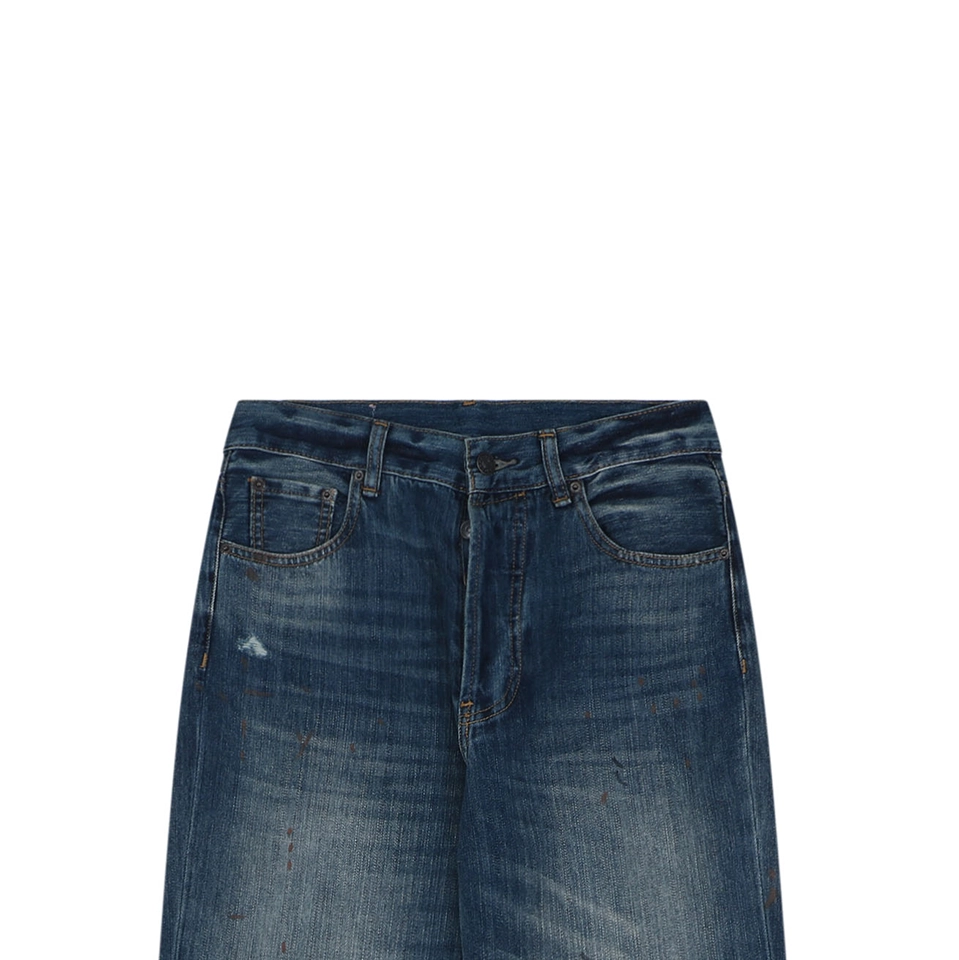 Crafted from high-density cotton, the fabric undergoes a multi-stage wash process to achieve a naturally faded look, enhanced with subtle paint splatter and distressed detailing. Each pair carries a slightly unique finish, adding character and depth.