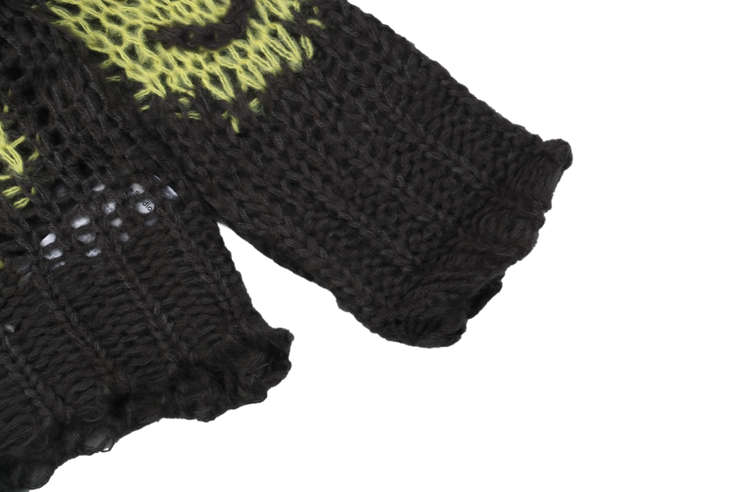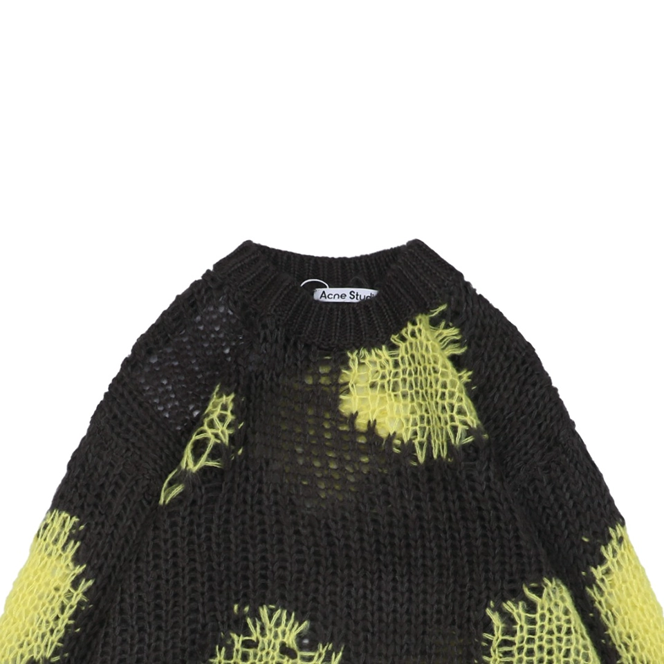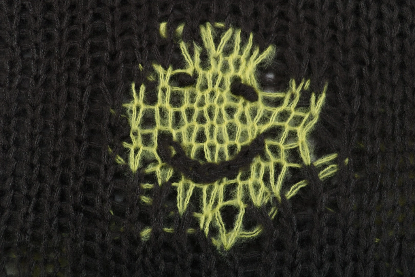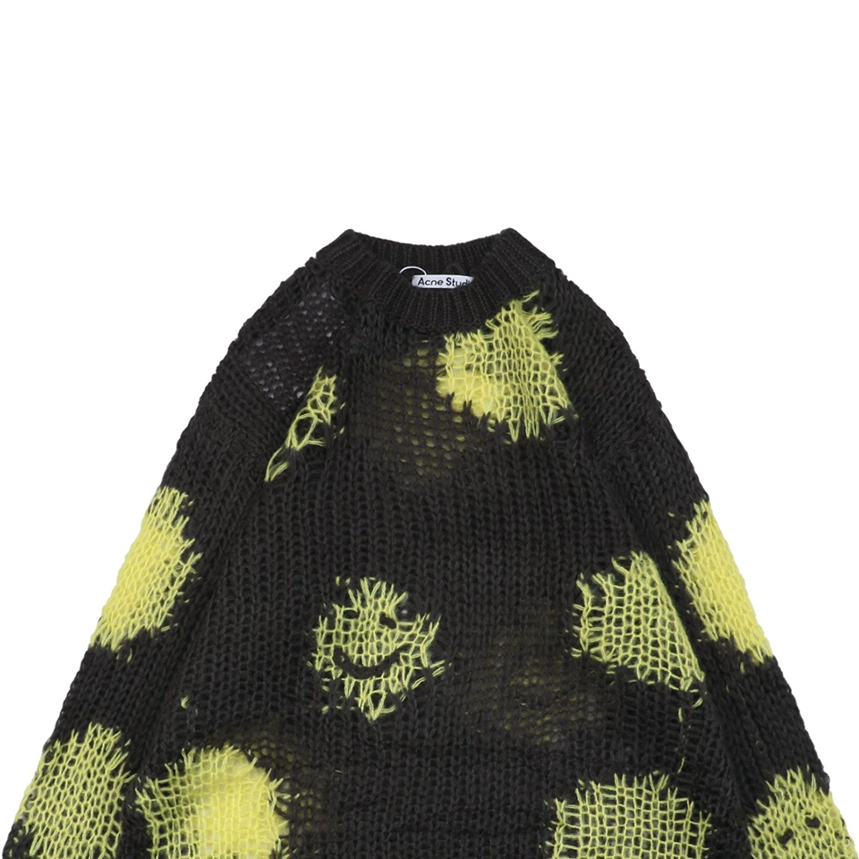 The Acne Studios Distressed Smiley Face Open-Knit Sweater embodies grunge-inspired expression with a playful twist. Featuring a bold, open-knit construction in black, the sweater is punctuated by distressed yellow smiley face motifs across the body and sleeves. Crafted for layering, its loosely woven structure offers an airy texture and a rebellious aesthetic. The raw hemline and oversized silhouette underscore its deconstructed charm.