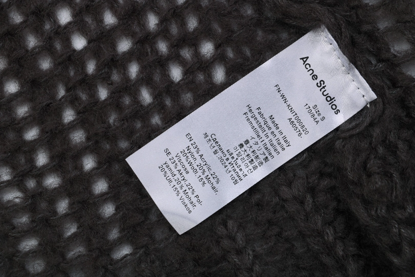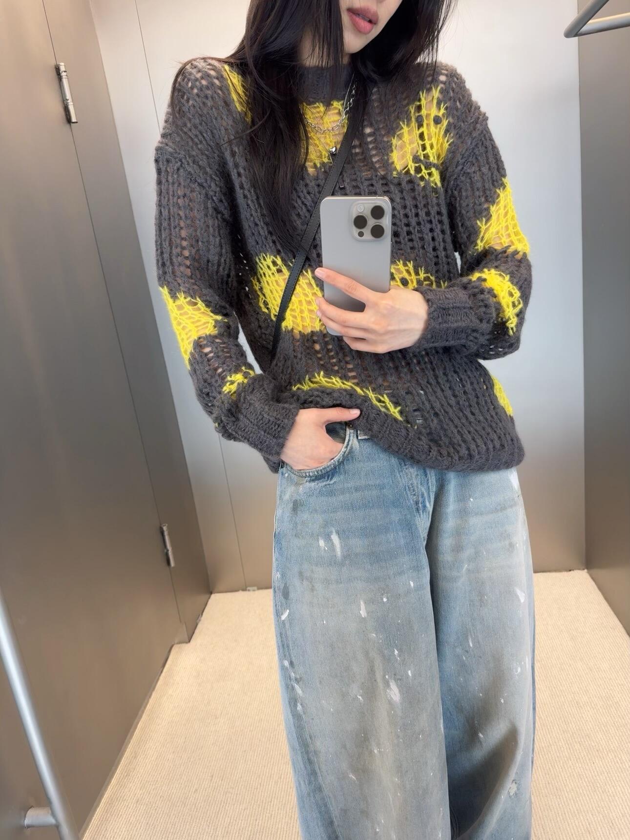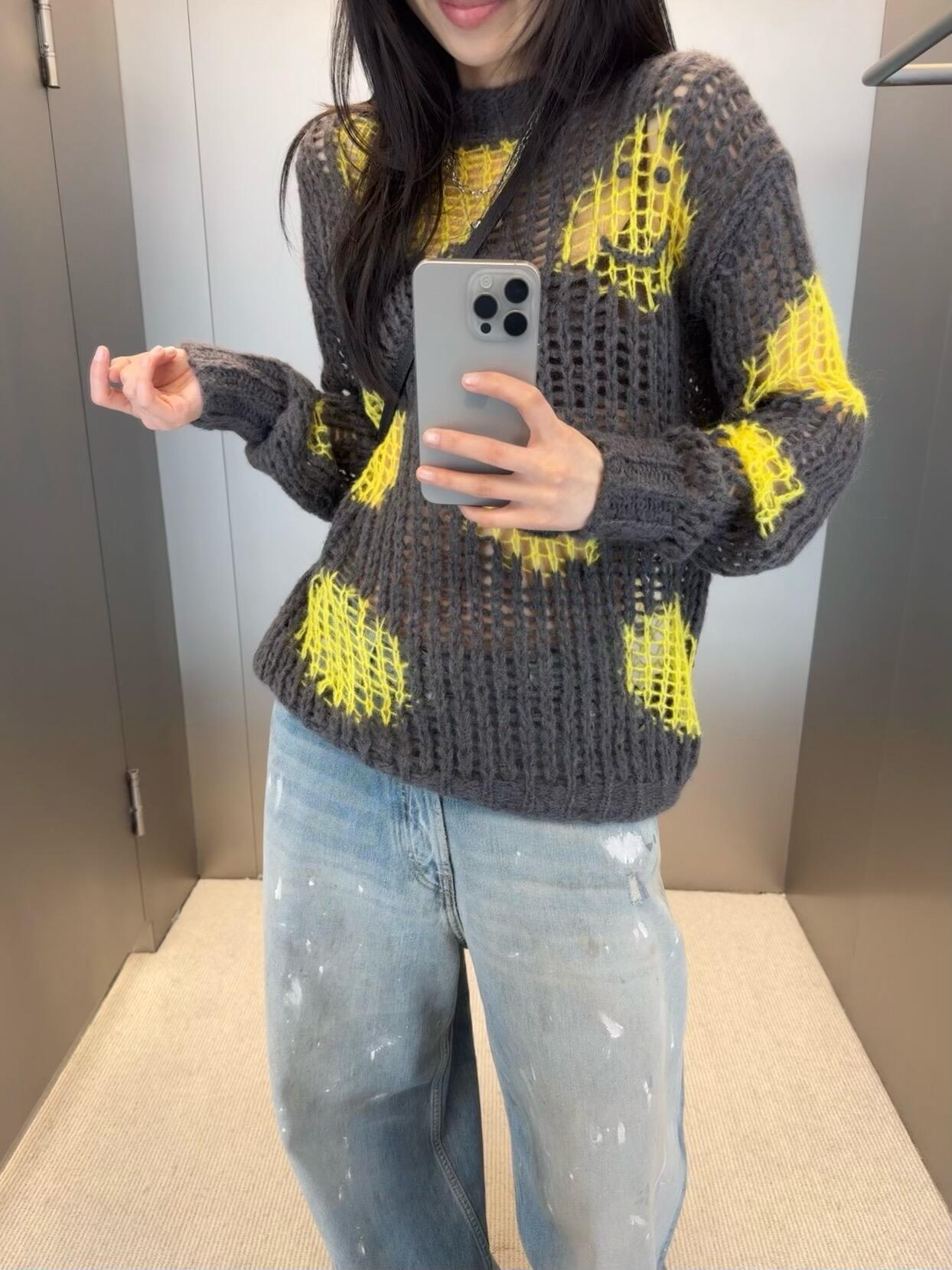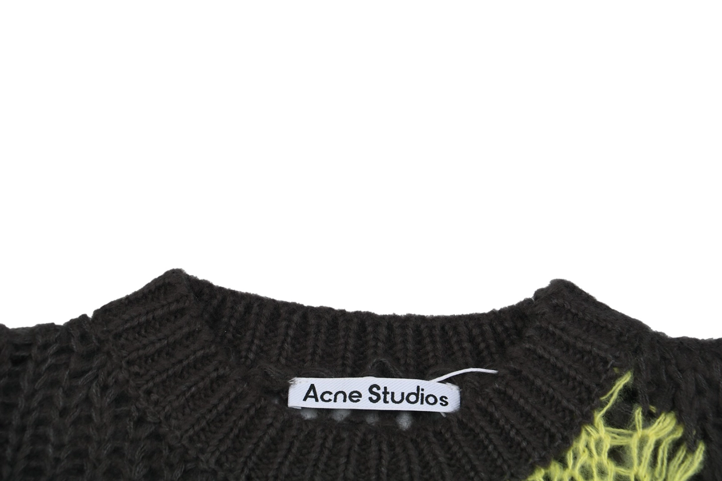 The Acne Studios Distressed Smiley Face Open-Knit Sweater embodies grunge-inspired expression with a playful twist. Featuring a bold, open-knit construction in black, the sweater is punctuated by distressed yellow smiley face motifs across the body and sleeves. Crafted for layering, its loosely woven structure offers an airy texture and a rebellious aesthetic. The raw hemline and oversized silhouette underscore its deconstructed charm.