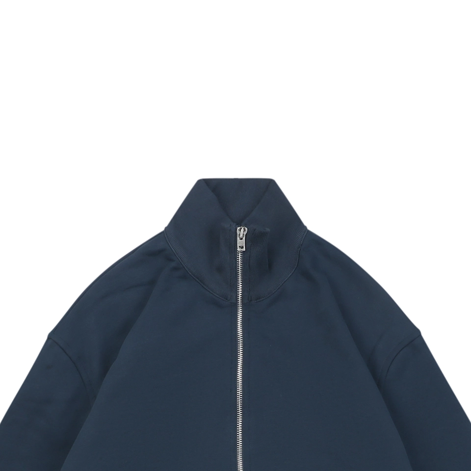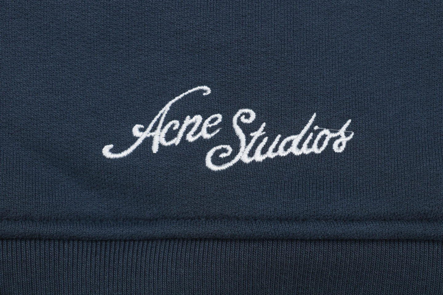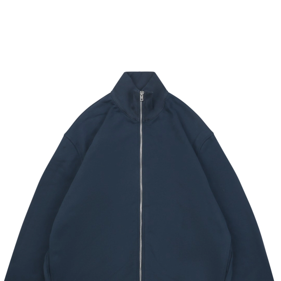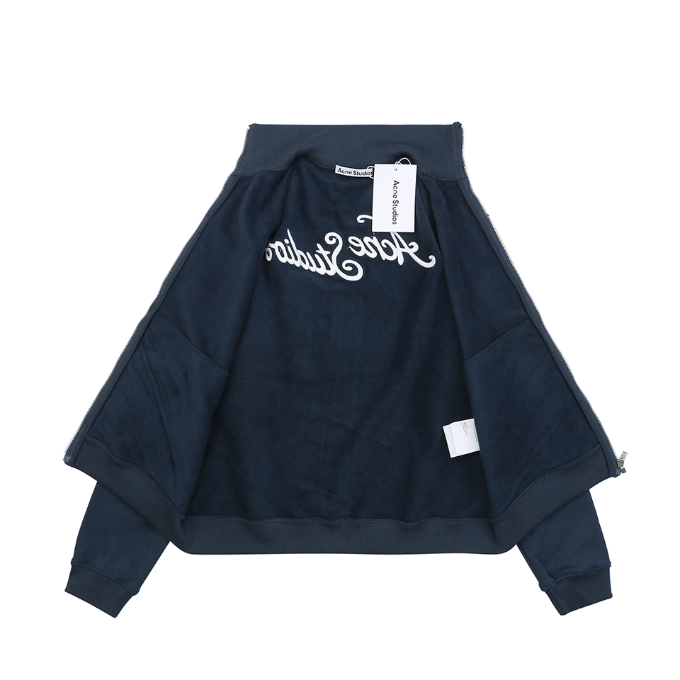 The Acne Studios Navy Embroidered Logo Track Jacket combines minimalist Scandinavian design with bold brand detailing. Crafted from heavyweight cotton, the jacket features a clean zip-up front, structured high collar, and ribbed cuffs and hem. The highlight lies in the oversized embroidered Acne Studios logo at the back in a glossy white finish, delivering standout visual contrast. Subtle front branding and smooth lines make this a versatile piece ideal for modern streetwear styling.