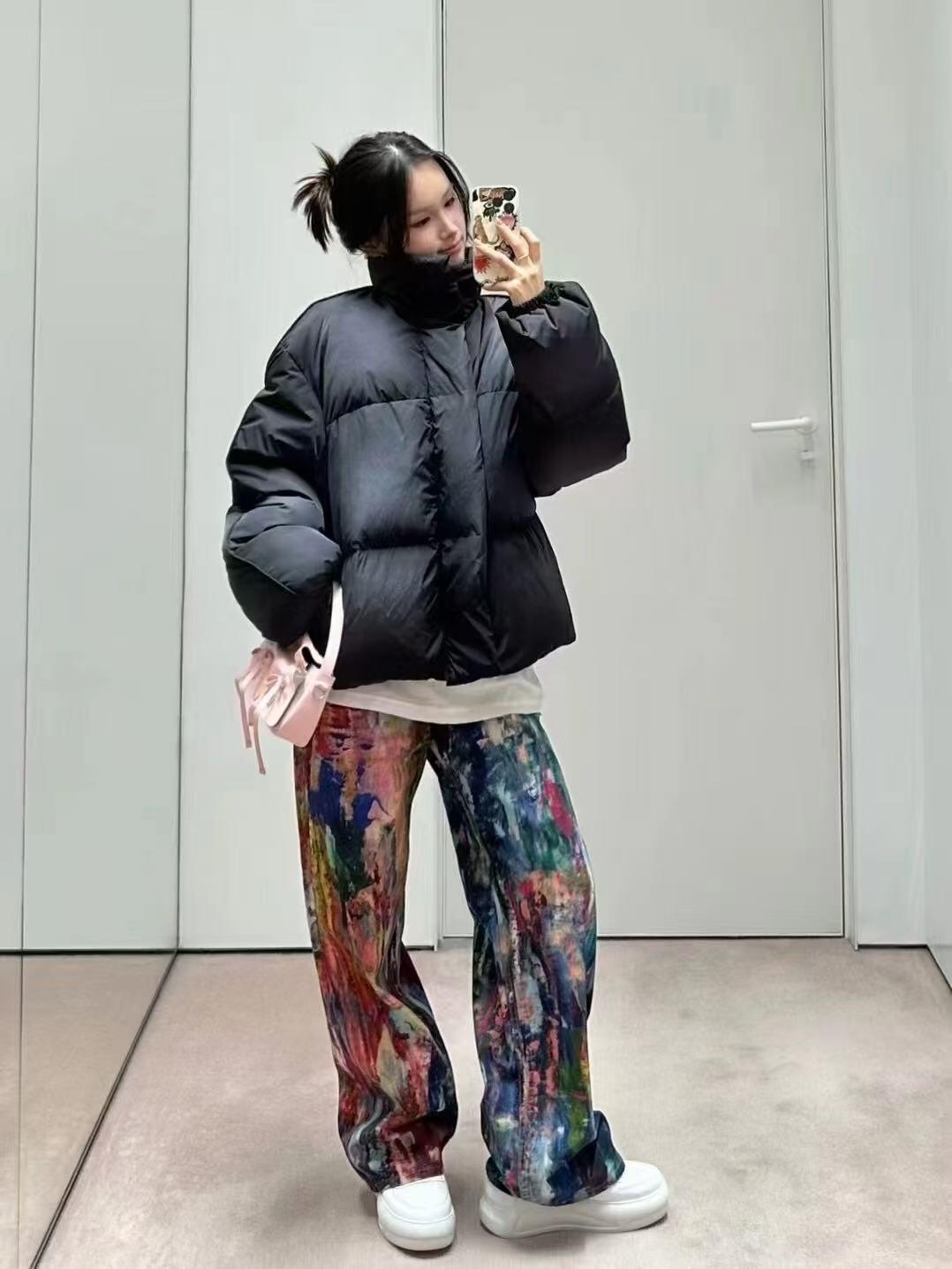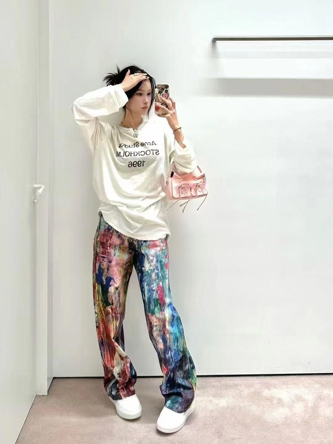 Acne Studios Oil-Paint Effect Denim Pants turn classic denim into wearable art. Crafted from premium cotton denim, these pants are fully covered in a vivid, all-over multicolor print that mimics expressive oil brushstrokes. The wide-leg cut offers a relaxed silhouette, making them perfect for both casual and elevated streetwear styles. Each pair features a slightly different pattern layout, ensuring every piece is unique. Finished with Acne Studios’ leather brand patch and a traditional five-pocket design, these pants are a bold statement for those who dress to stand out.