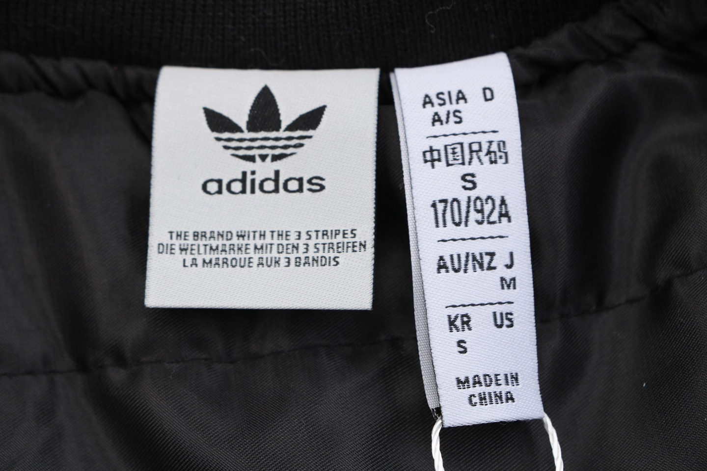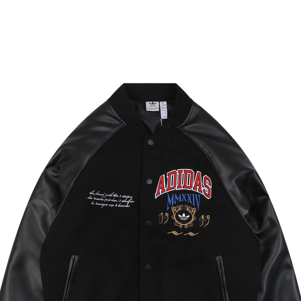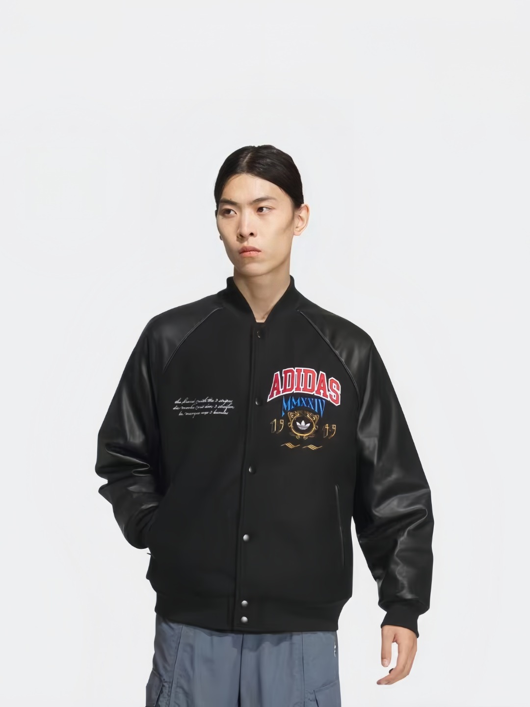 The Adidas Originals Embroidered Crest Leather Sleeve Varsity Jacket blends classic collegiate aesthetics with premium craftsmanship. Inspired by traditional American varsity silhouettes, this piece delivers a bold yet refined statement through material contrast and intricate detailing.