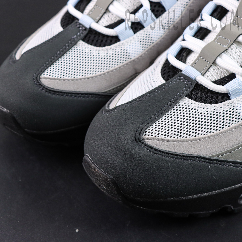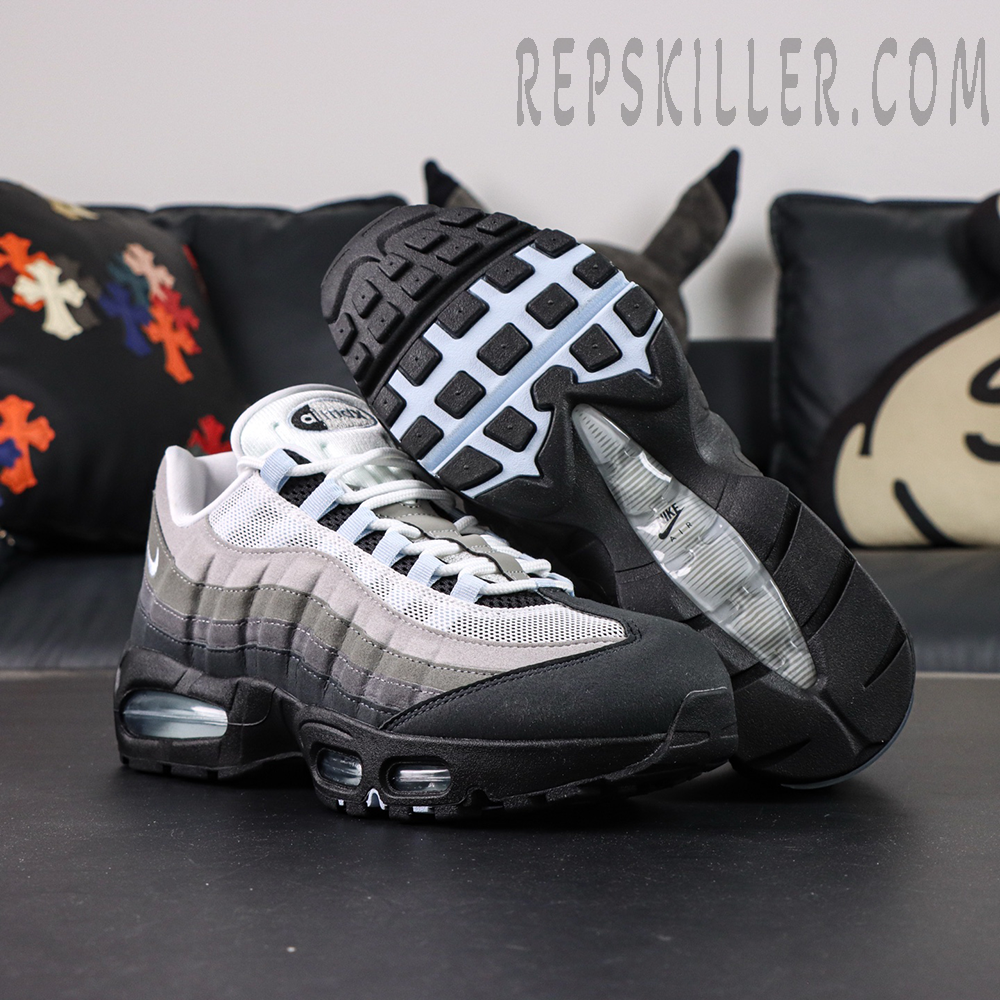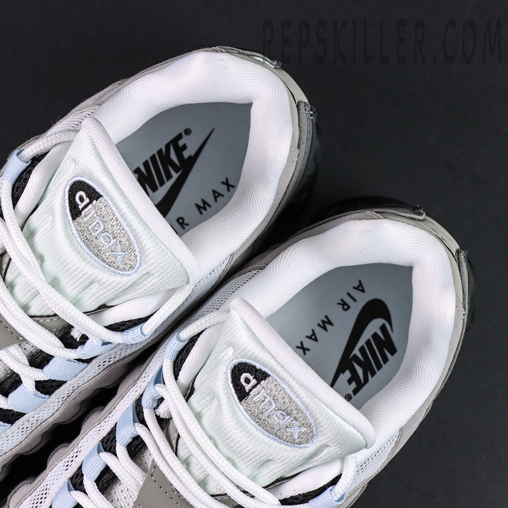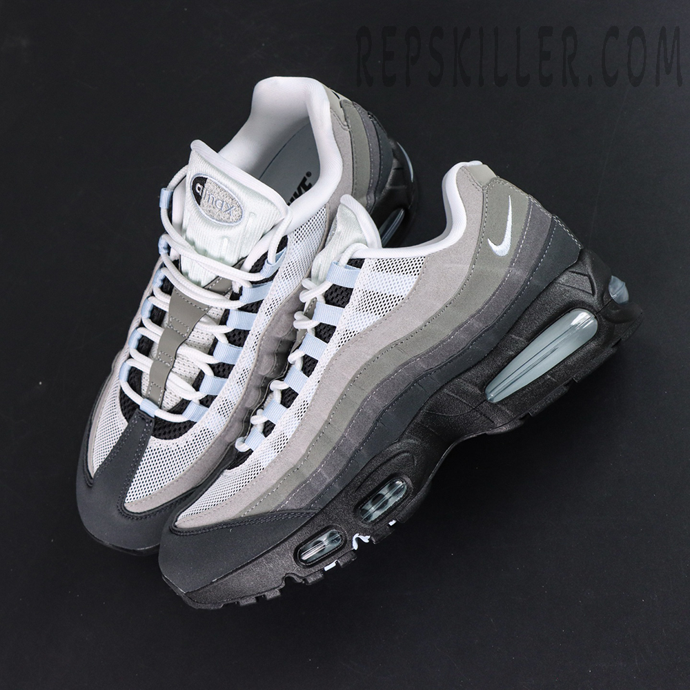 The upper features the Air Max 95’s signature anatomy-inspired wave panels, constructed from synthetic suede in graduated shades of grey that create depth and texture across the sidewalls. Breathable white and grey mesh on the vamp enhances airflow, while subtle Blue Tint accents highlight the webbing lace loops, tongue branding, heel logo, and visible Air units for a clean, contemporary contrast.