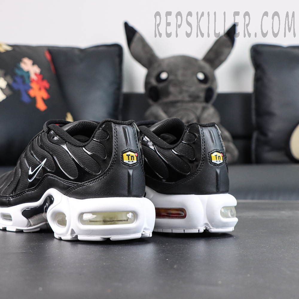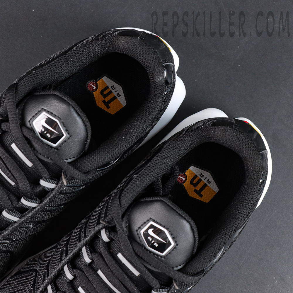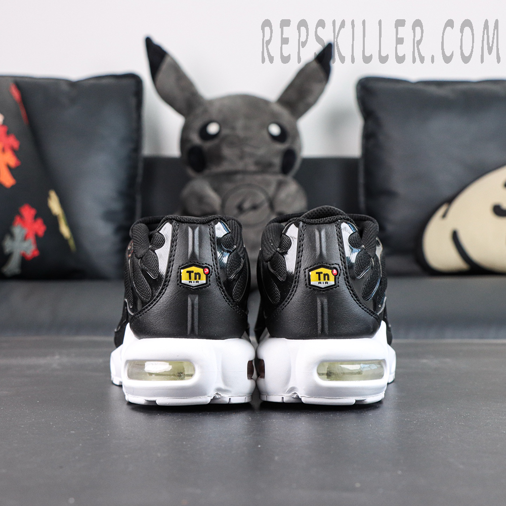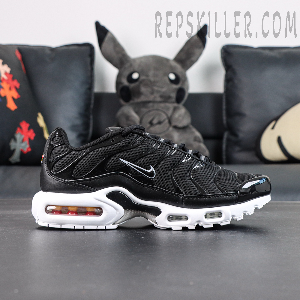 The upper features a breathable black mesh base, reinforced with signature wavy TPU cage overlays that define the Air Max Plus identity. Glossy black accents wrap the toe and mudguard for added durability, while crisp white detailing on the midsole and mini Swoosh provides sharp visual contrast. The streamlined profile makes this pair especially popular among buyers looking for high quality Air Max Plus reps that stay true to the original shape and proportions.