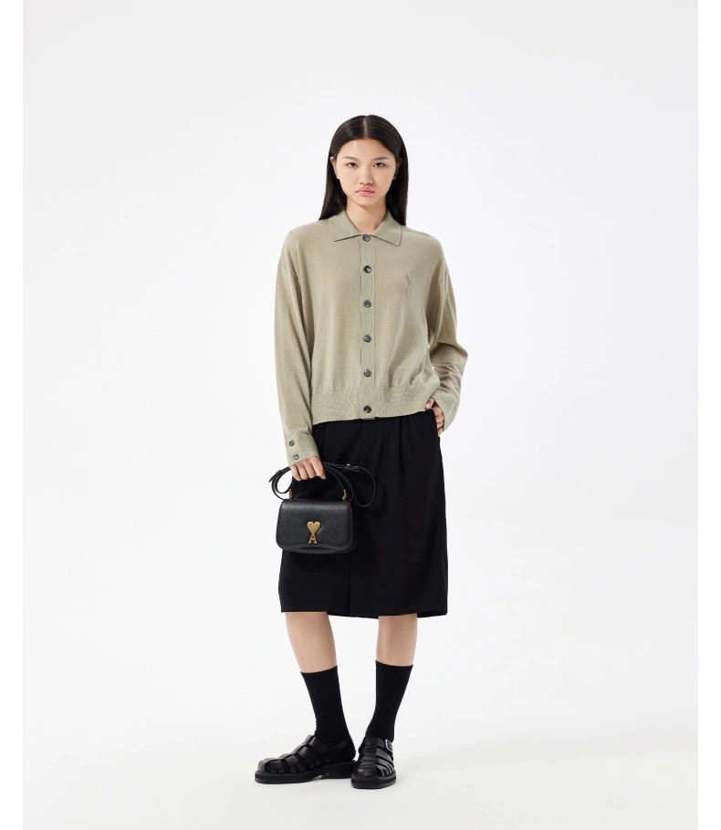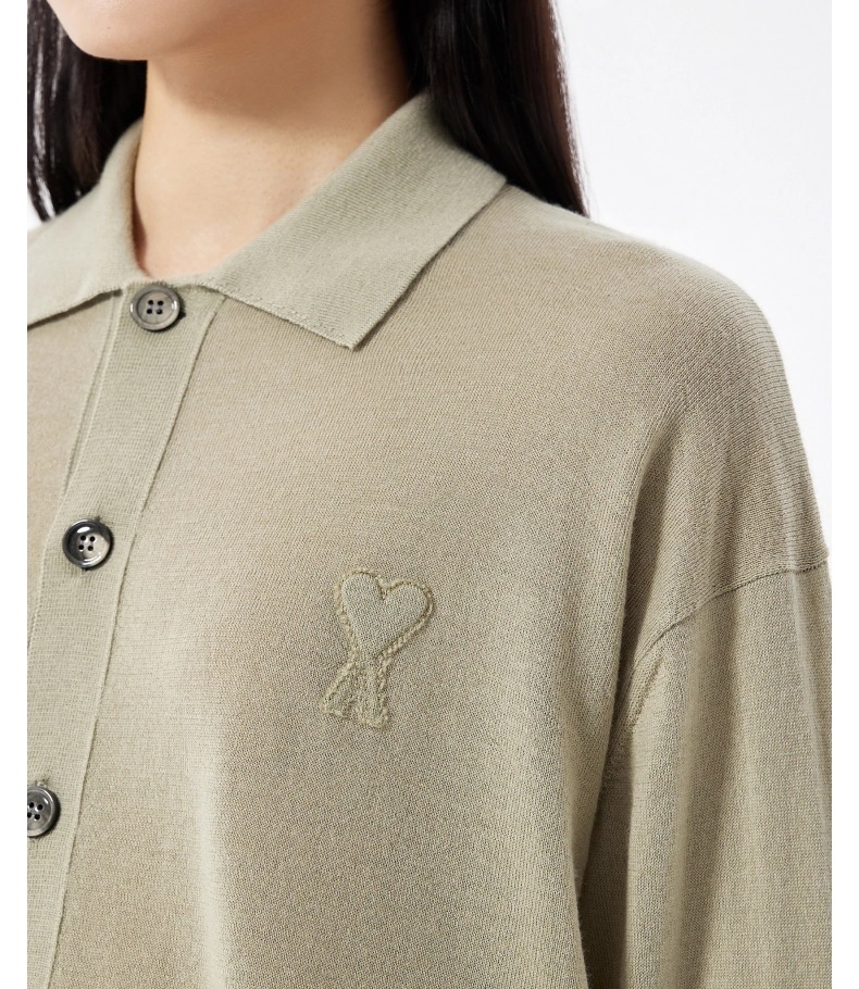 Ami Embossed Heart Embroidery Basic Polo Sweater Green made of 100% pure cotton wool material. This material is very popular in autumn and winter because of its elegant touch and excellent heating properties. The embroidery process of the chest of the sweater gives the fabric a unique visual effect through fine cutting, bordering, splice and folding techniques. The fine decorative flower sewing lines display a textured and relief effect on the surface, enhancing the decorative and artistic sense of the garment. At the same time, these elements also enrich the layered and three-dimensional feel of the fabric, further enhancing the overall texture of the garment.