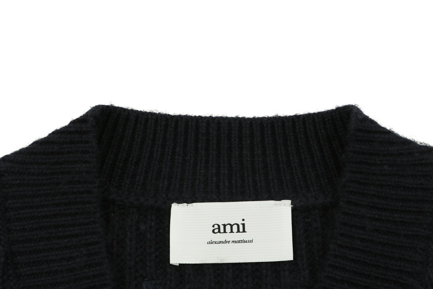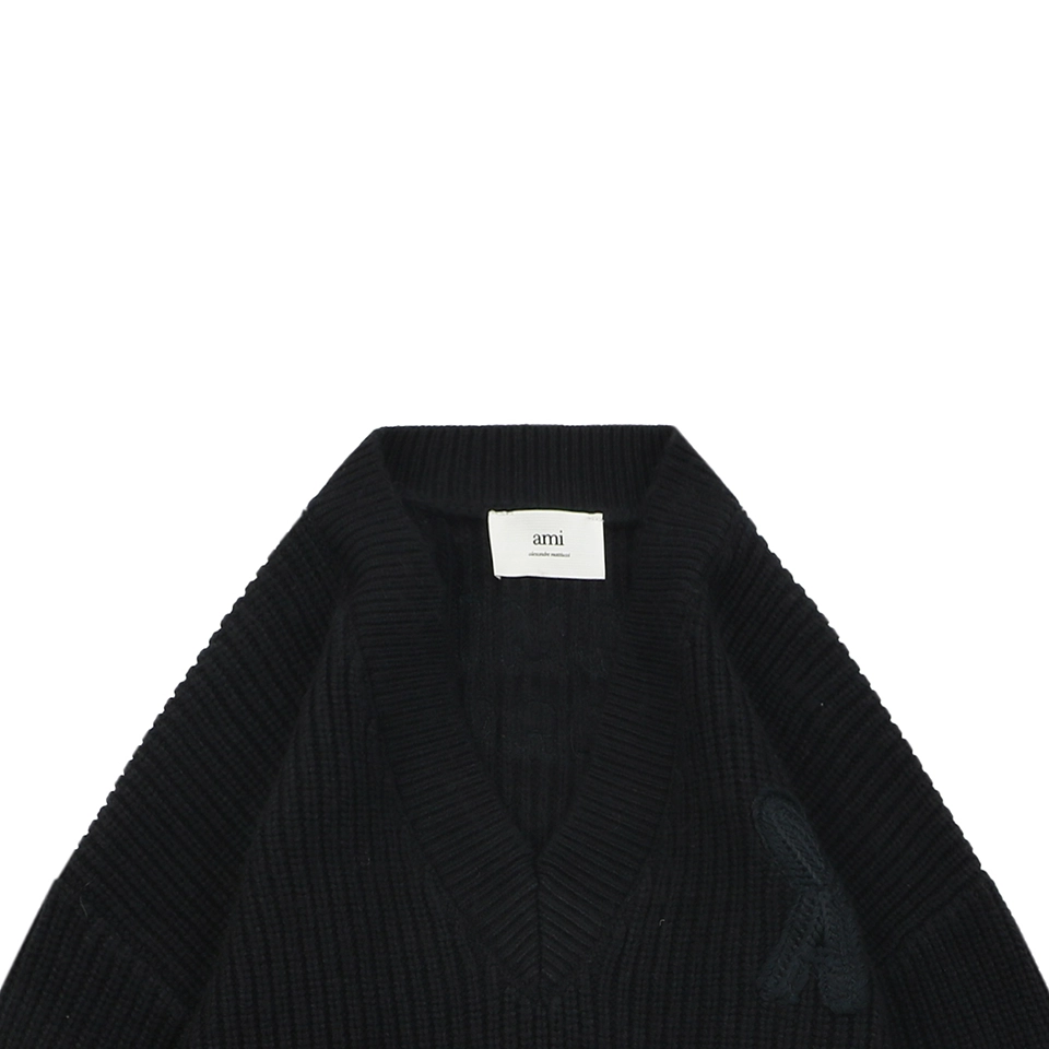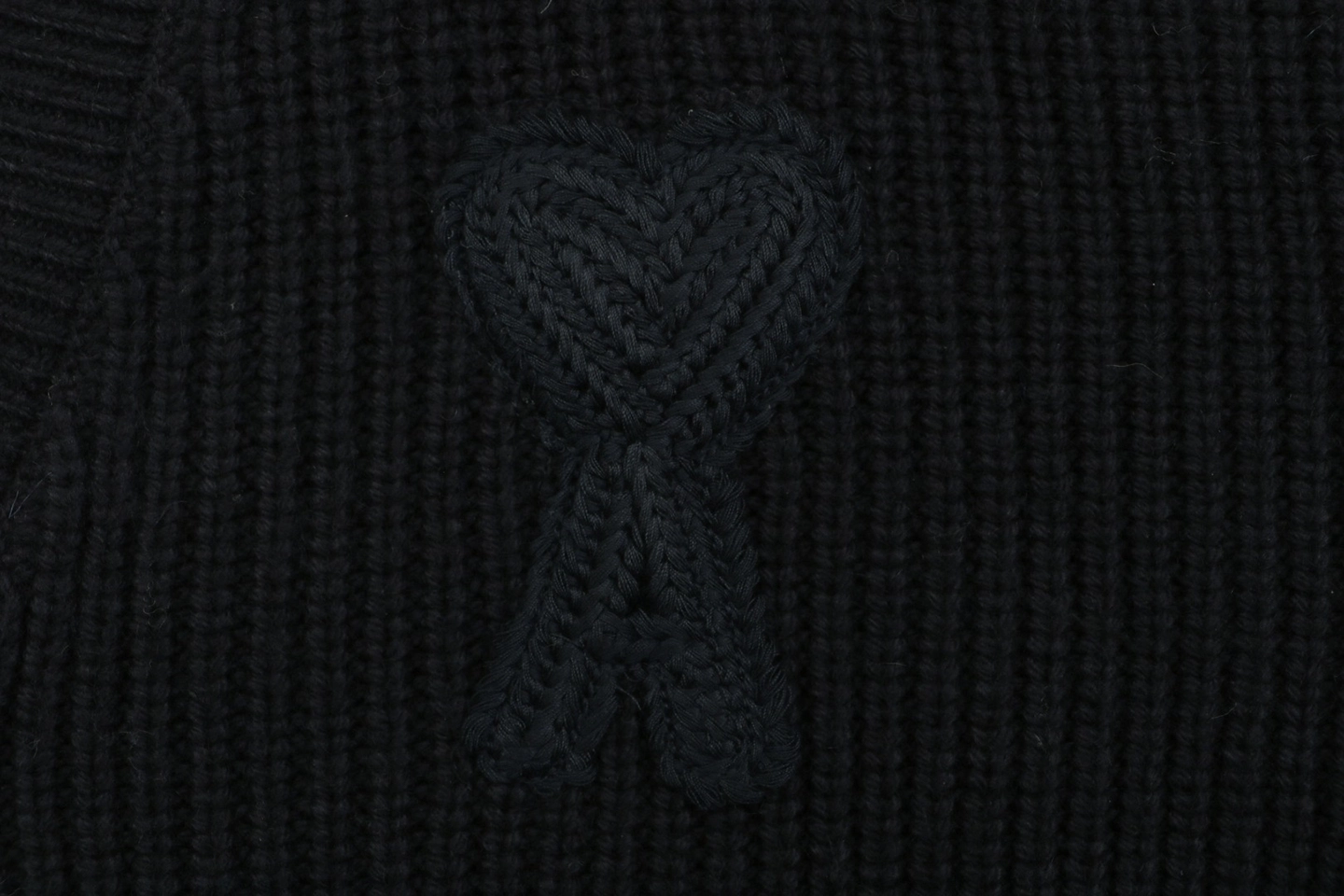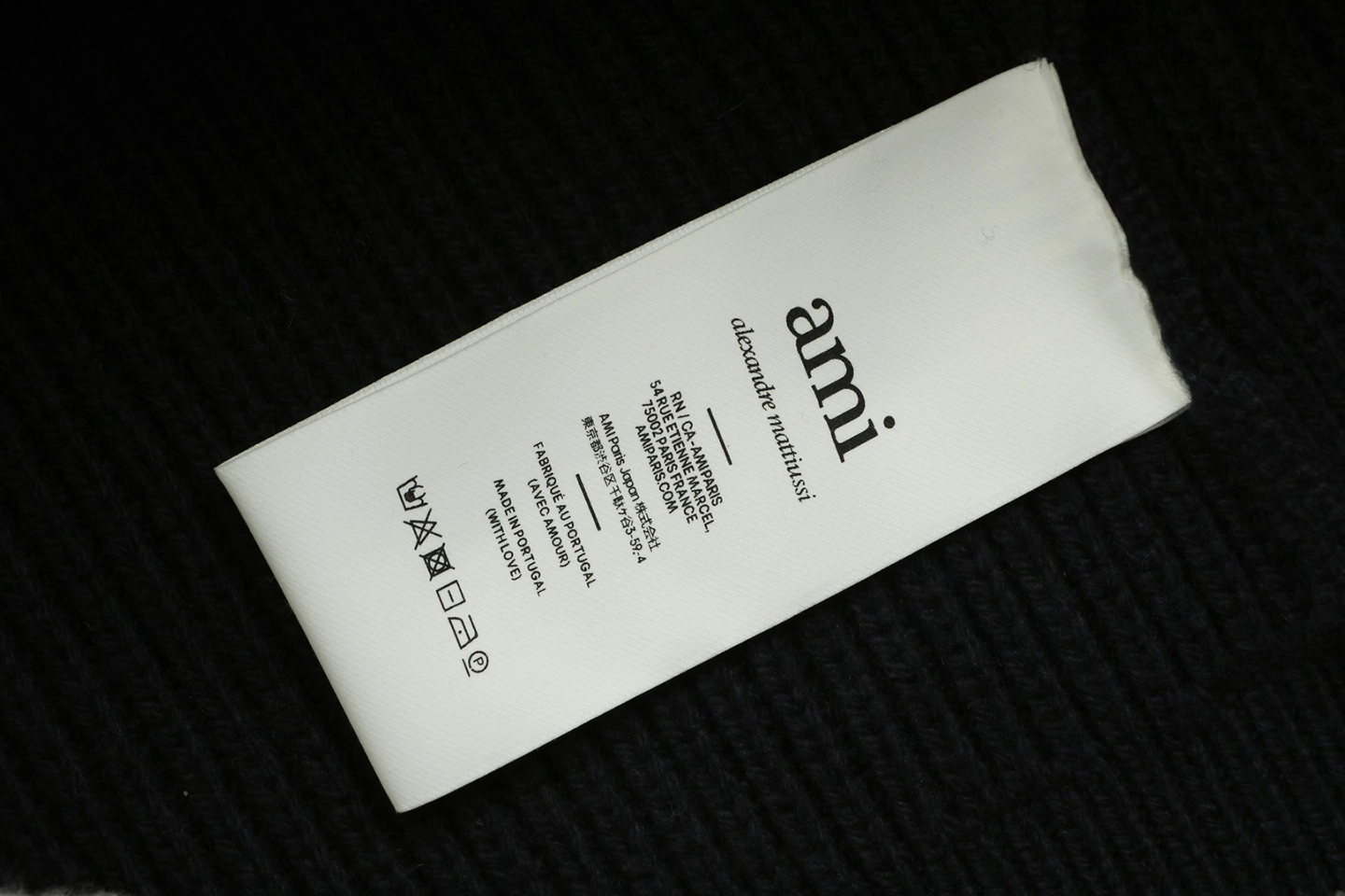 Designed with a classic V-neck and clean shoulder lines, the cardigan flatters a wide range of body types. Subtle color-block ribbed trims at the cuffs and hem add visual depth while preserving a refined, understated aesthetic. The iconic Ami heart detail introduces a touch of charm without overpowering the overall look.