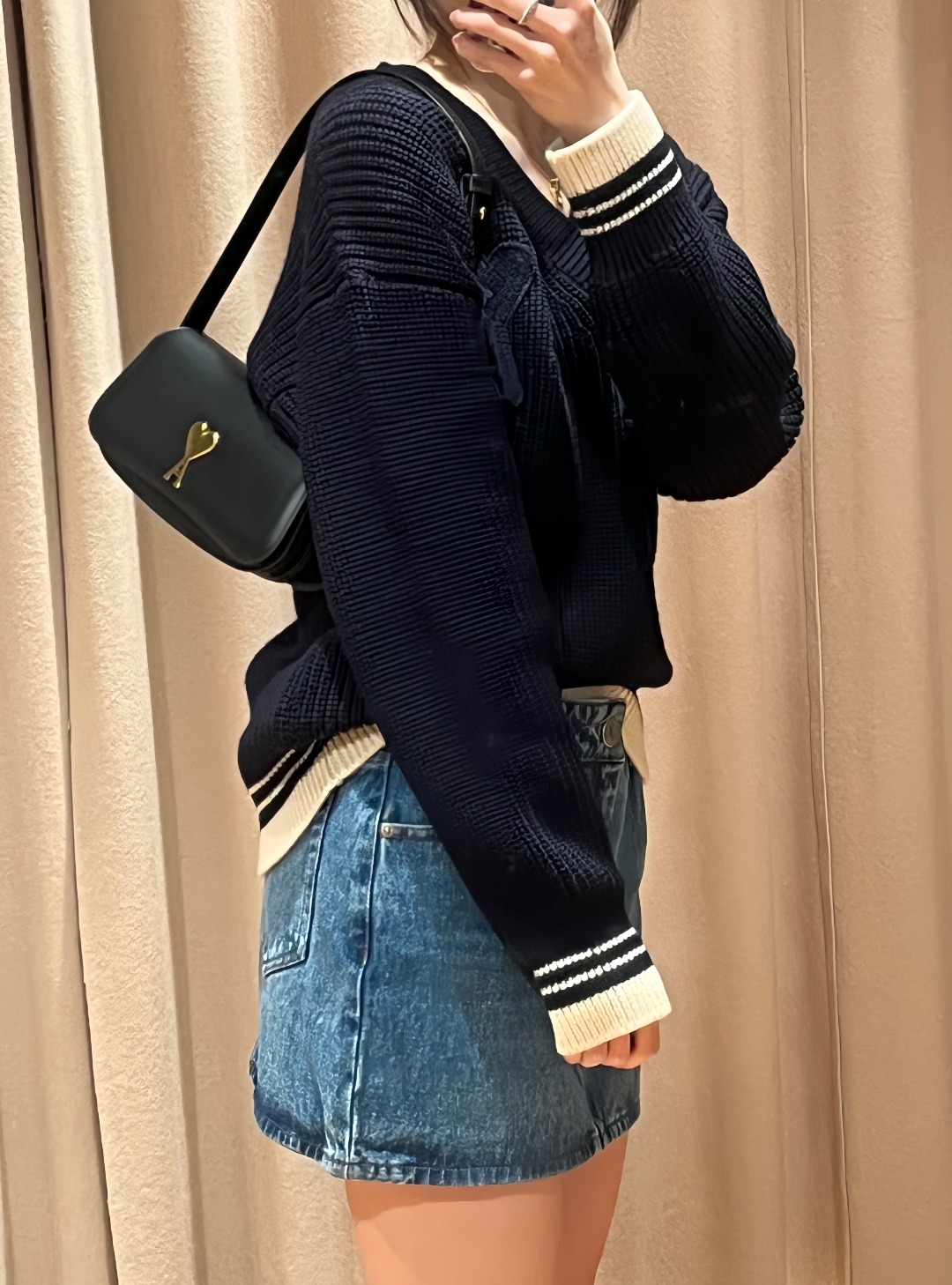 The Ami Heart Color-Block Knit Cardigan embodies the brand’s signature Parisian minimalism, blending playful heart motifs with refined craftsmanship to create a versatile and elegant knitwear essential.