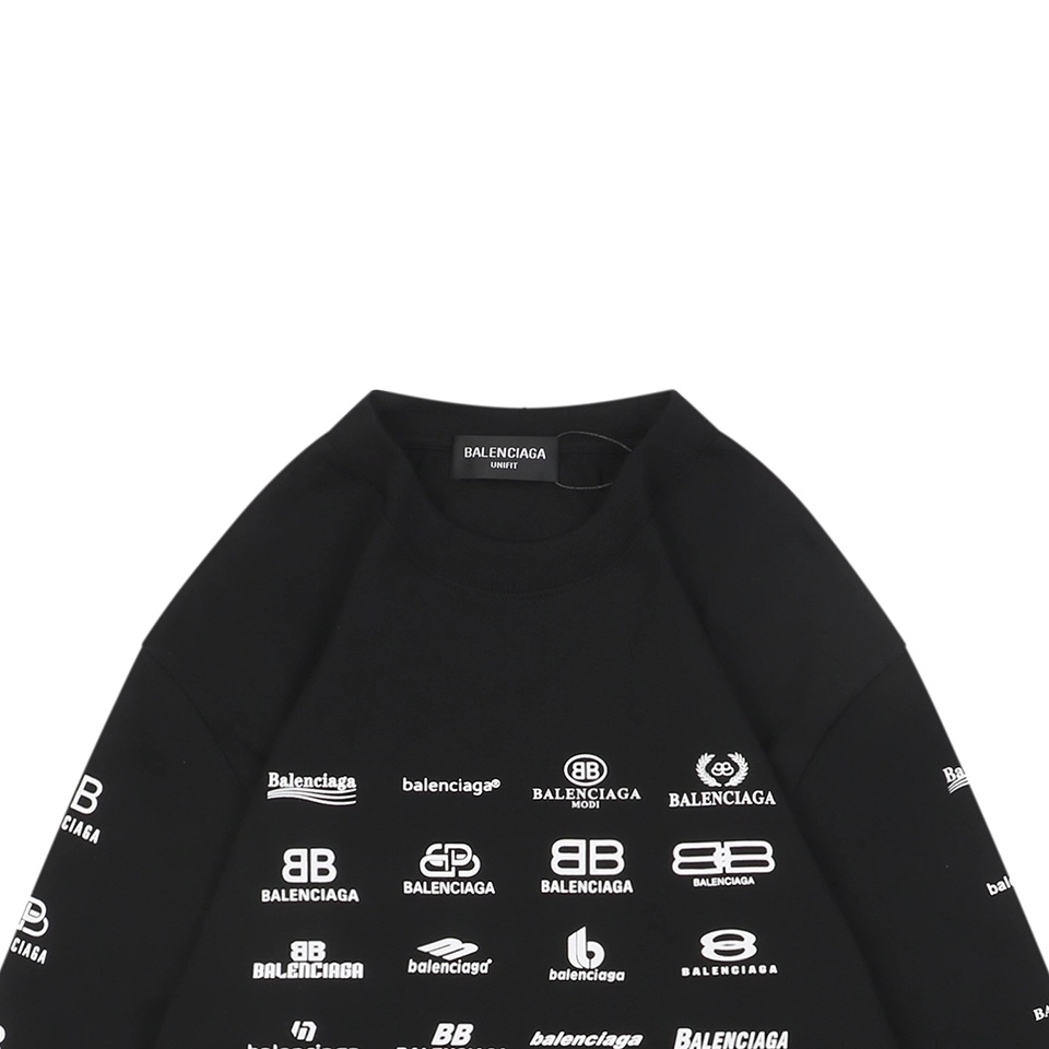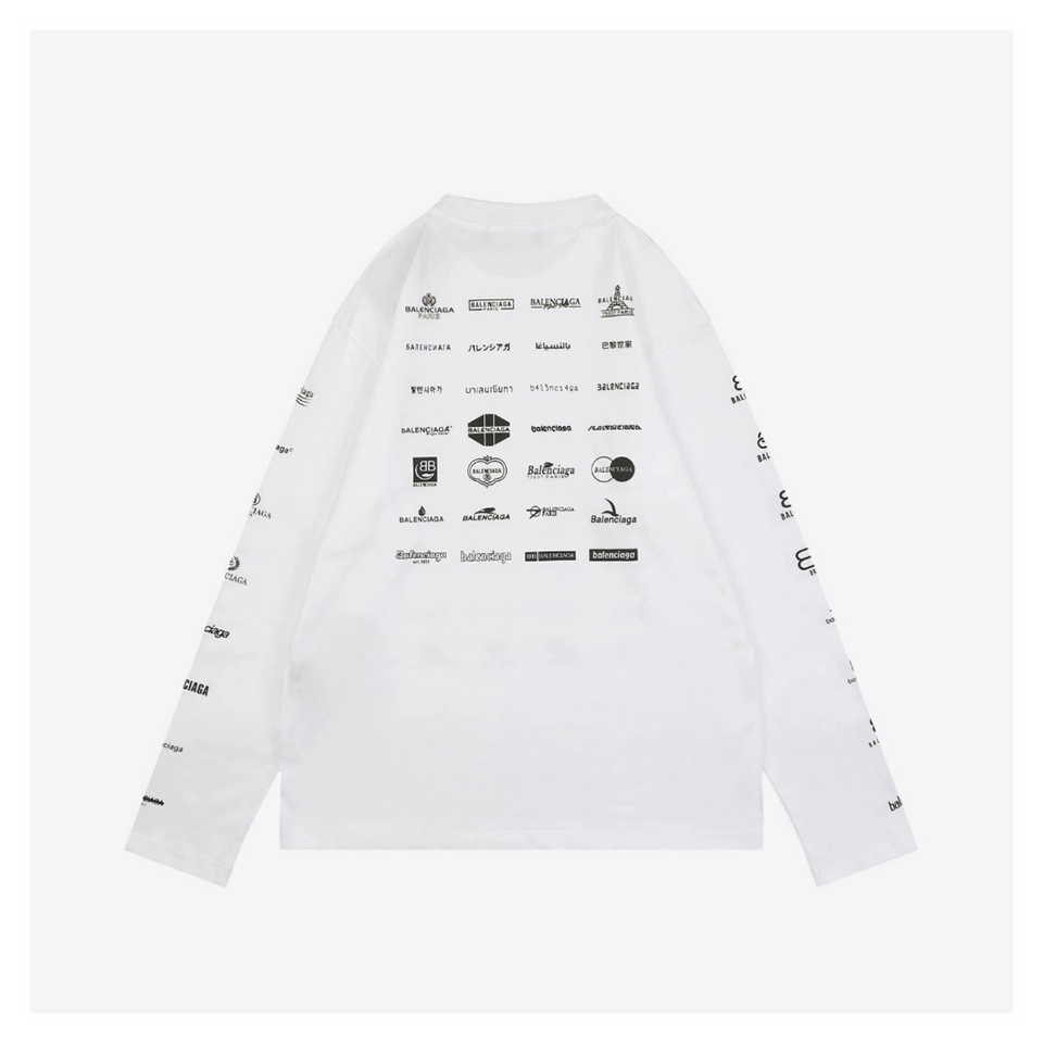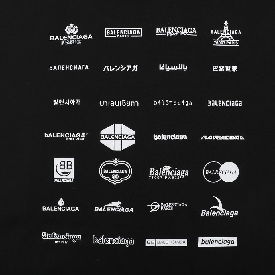 The Balenciaga Multilogo Graphic Shirt delivers bold visual impact with a collage of Balenciaga logos spanning multiple languages and typographic styles. Crafted from high-quality cotton, the shirt comes in both classic black and crisp white, offering a statement piece that blends minimalism from the front with maximalist branding on the back and sleeves. Its oversized silhouette and extended sleeves lend a relaxed yet striking aesthetic perfect for streetwear layering.