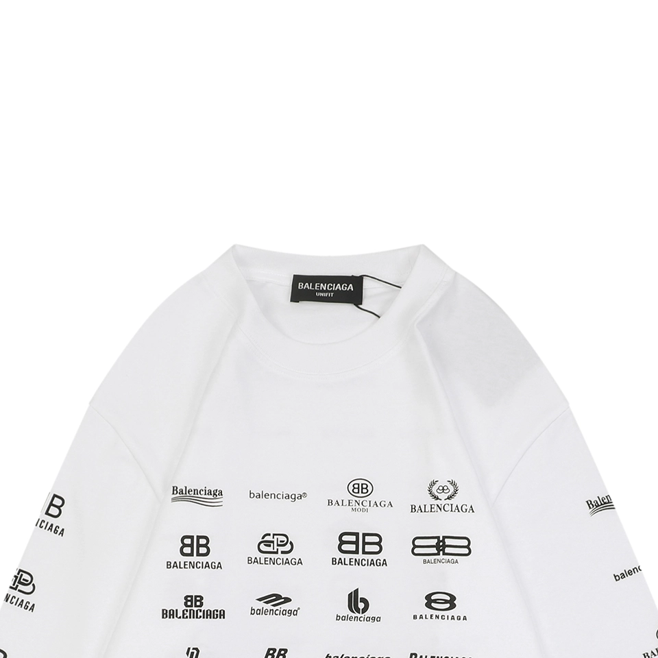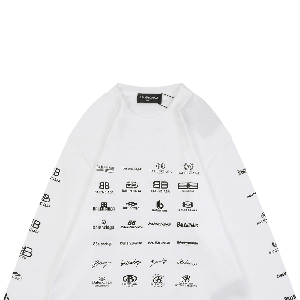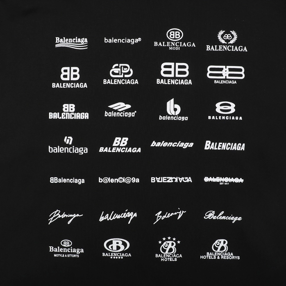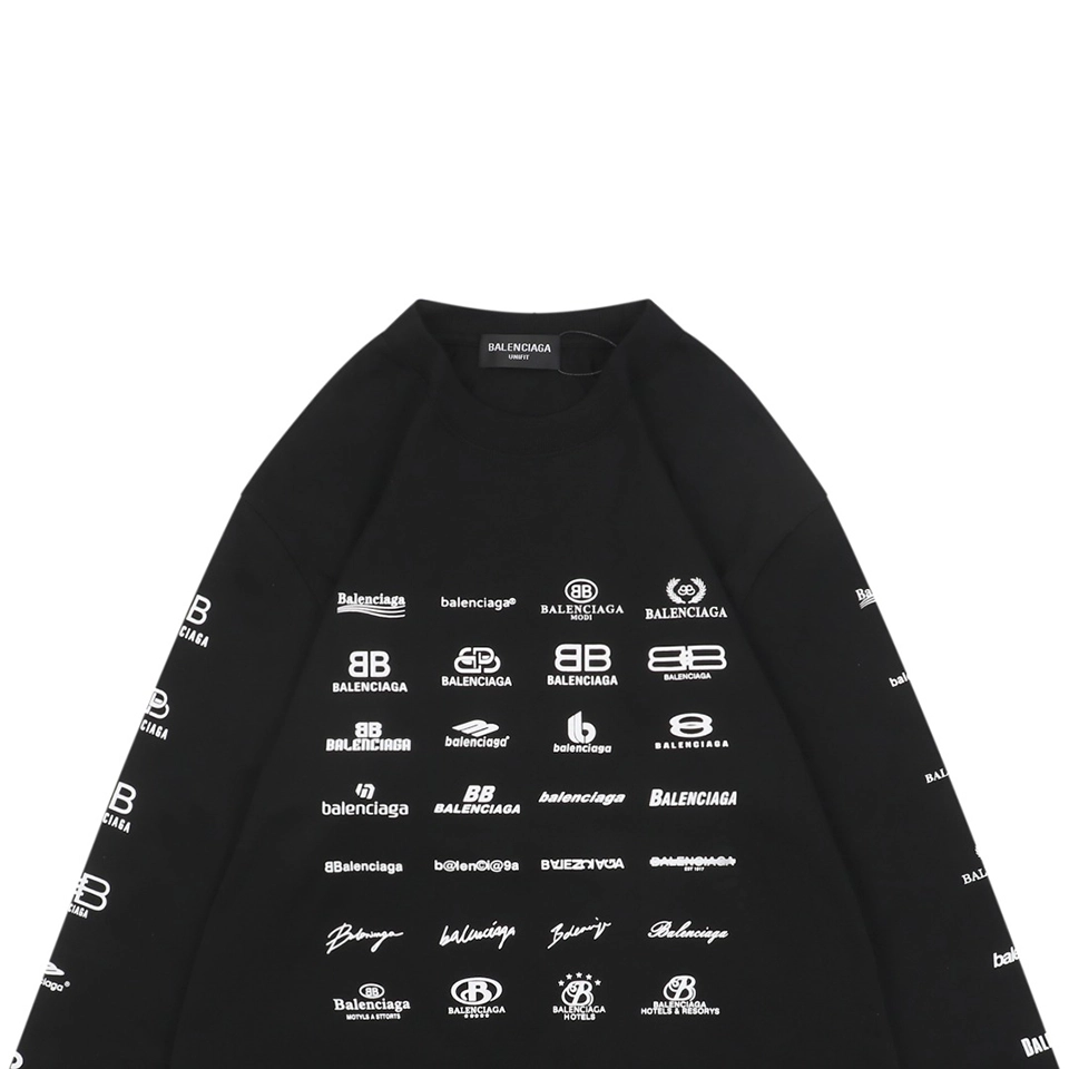 The Balenciaga Multilogo Graphic Shirt delivers bold visual impact with a collage of Balenciaga logos spanning multiple languages and typographic styles. Crafted from high-quality cotton, the shirt comes in both classic black and crisp white, offering a statement piece that blends minimalism from the front with maximalist branding on the back and sleeves. Its oversized silhouette and extended sleeves lend a relaxed yet striking aesthetic perfect for streetwear layering.