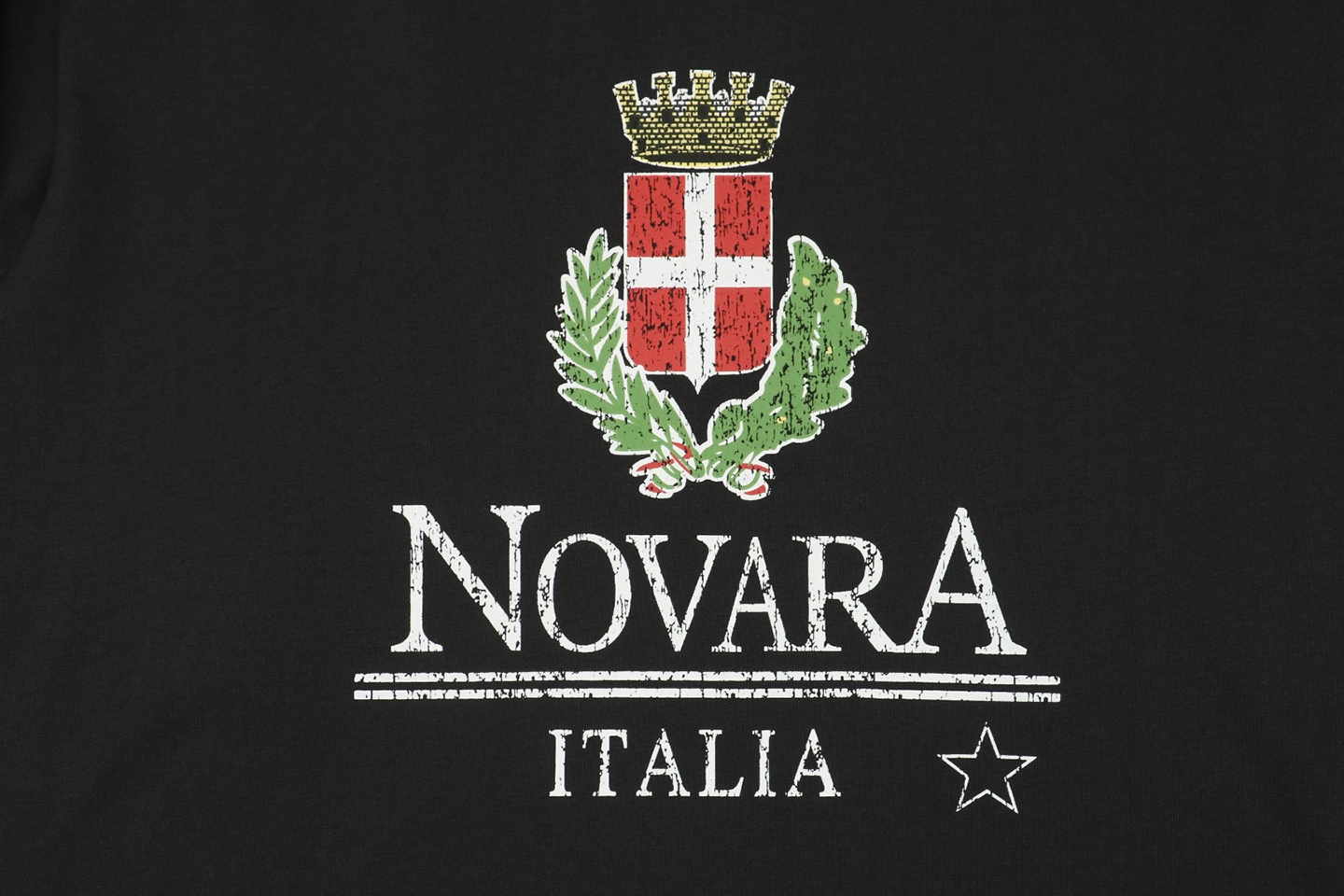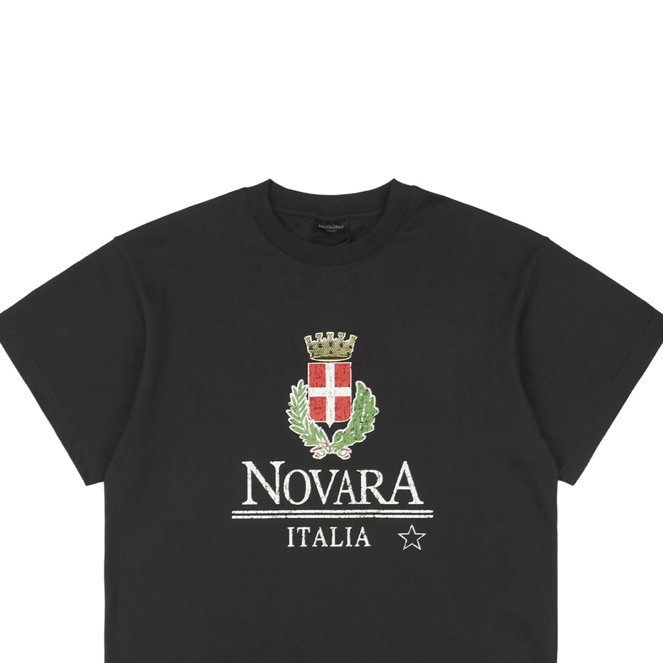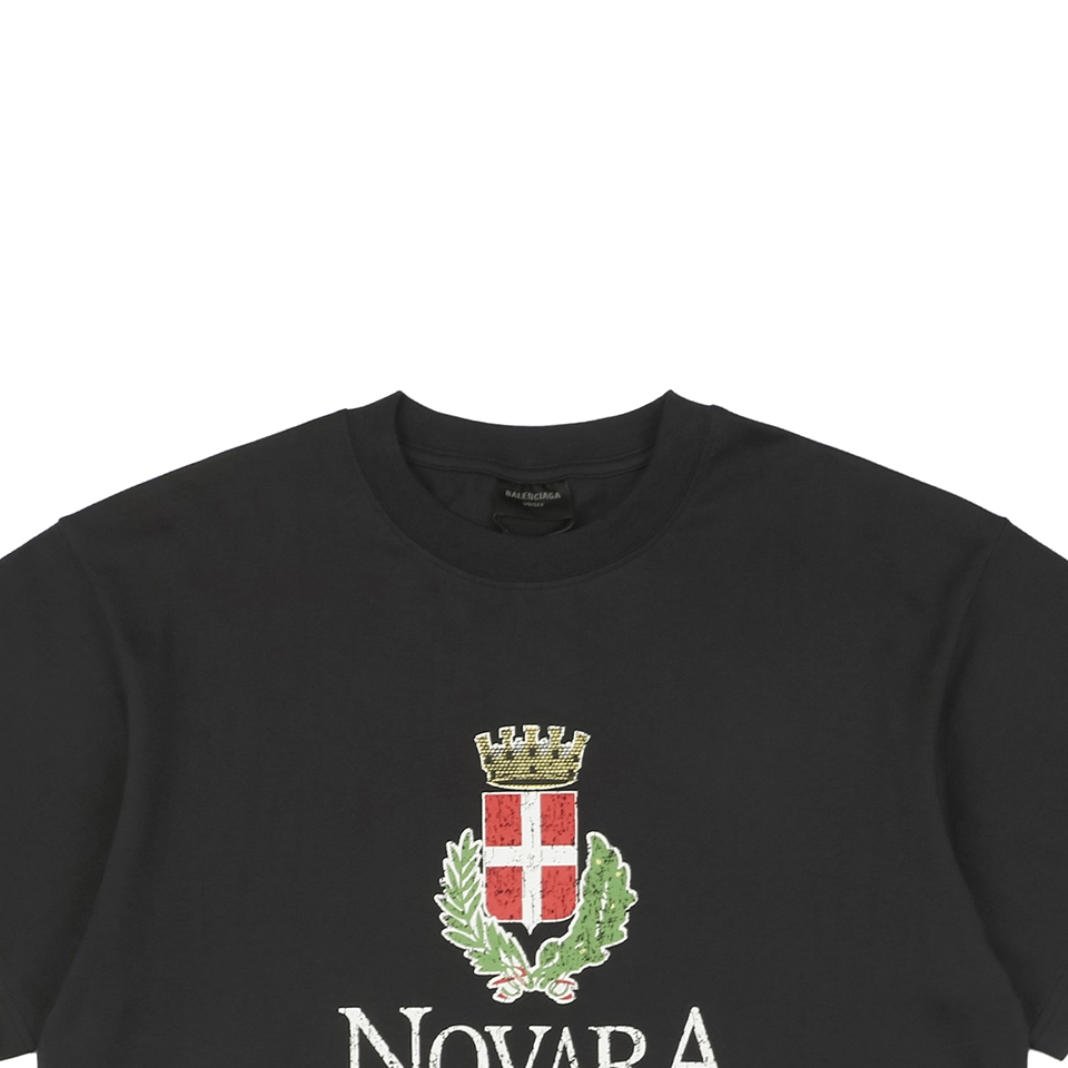 The Balenciaga NOVARA Crest Cracked Print T-shirt delivers a vintage collegiate vibe through its distressed “NOVARA ITALIA” print and cracked ink finish. Featuring a bold red cross crest encircled by laurel leaves and topped with a golden crown, this design nods to traditional heraldry with a streetwear edge. Crafted from soft cotton jersey, the black base keeps it classic and easy to pair for everyday looks.