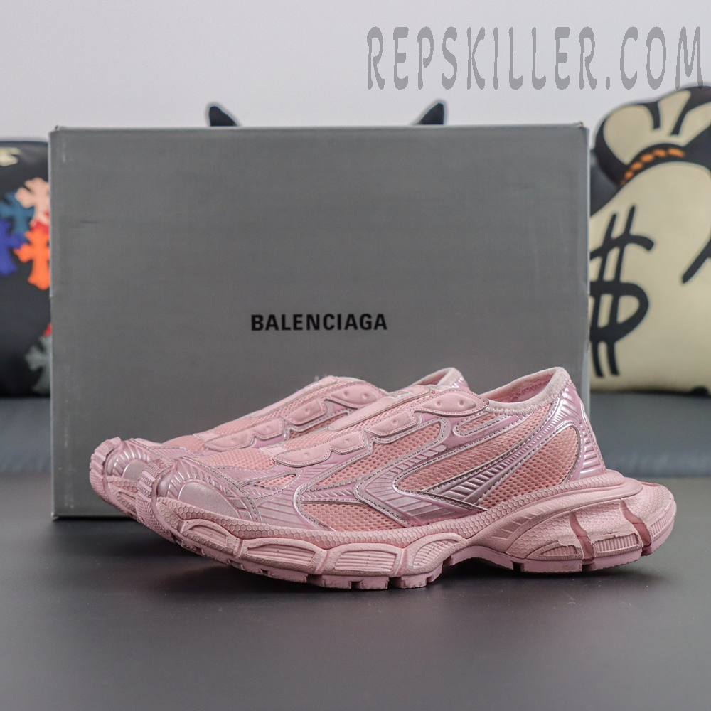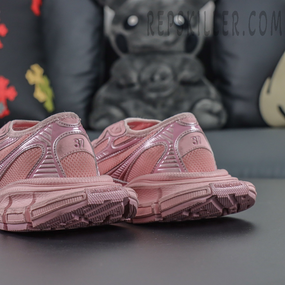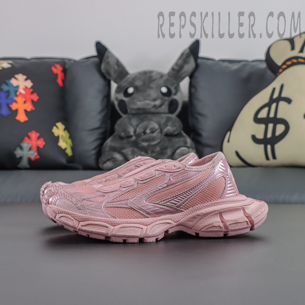 Balenciaga Runner Sneaker in Rose Pink fuses deconstructed athletic cues with high-fashion aesthetics. Featuring a layered mesh and polyurethane upper in tonal rose pink, the design mimics worn-in performance shoes with exposed stitching and deliberately distressed textures. The exaggerated sole unit adds sculptural bulk and an avant-garde edge, delivering both cushioning and a bold silhouette. This sneaker embodies Balenciaga’s disruptive approach to sneaker culture and urban expression.