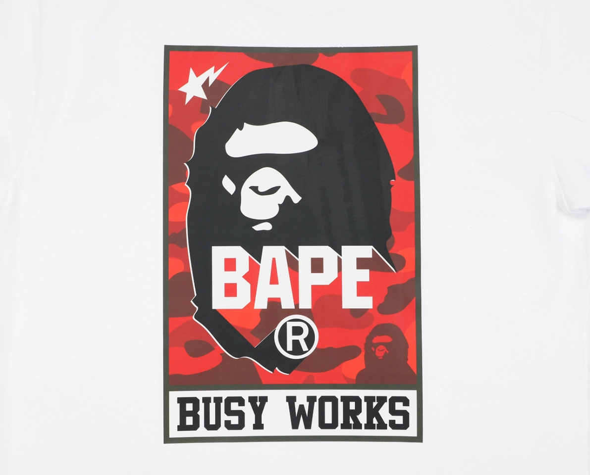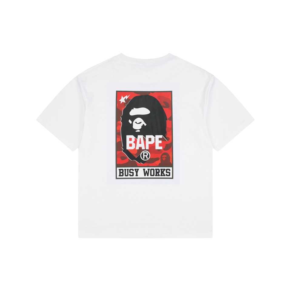 The BAPE Busy Works Camo Ape Head T-Shirt delivers a bold streetwear statement, featuring the iconic Ape Head graphic set against a vibrant camo-inspired backdrop.