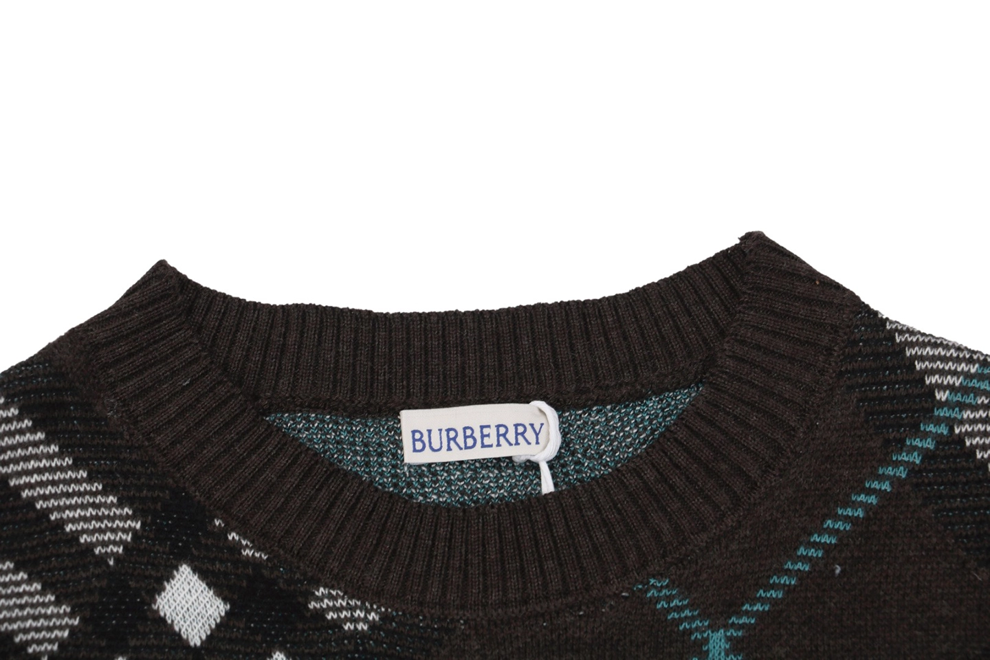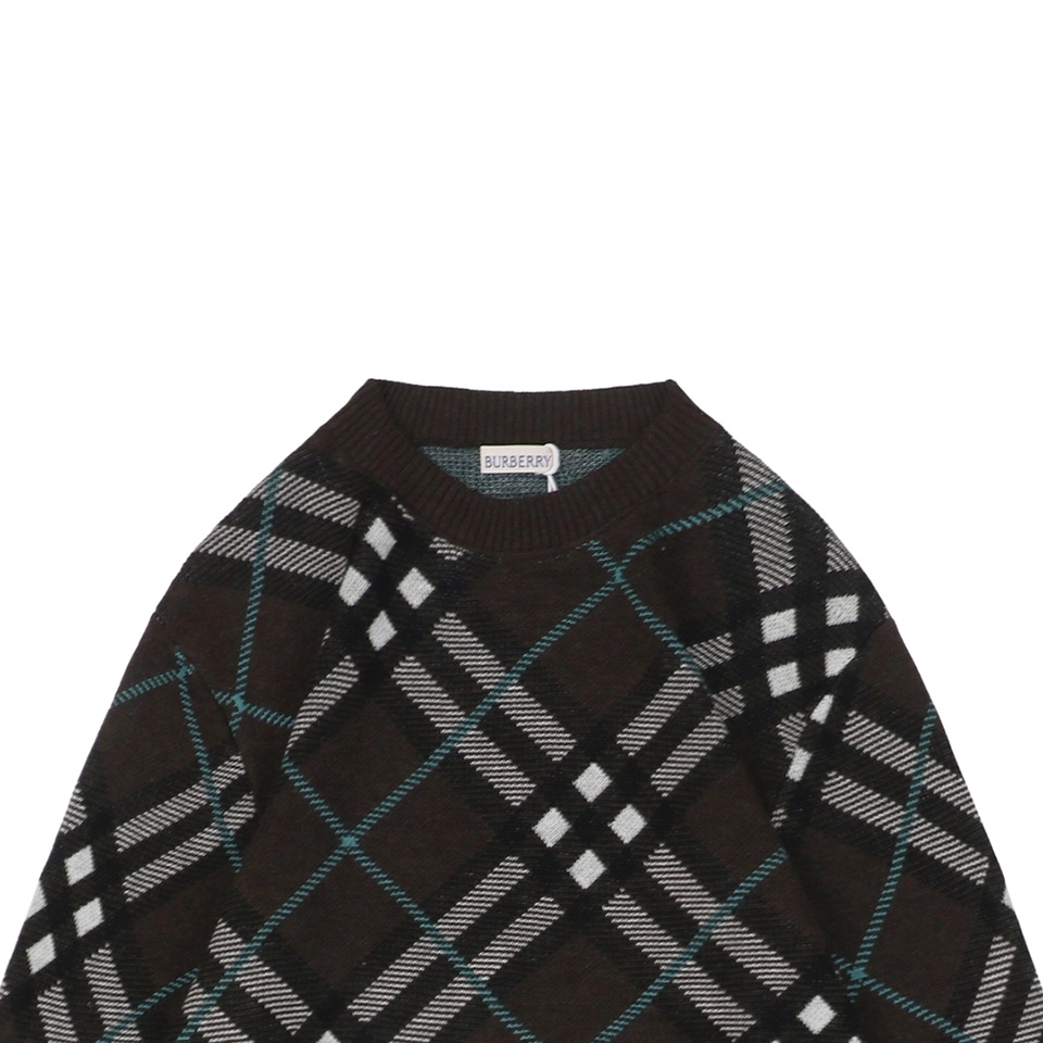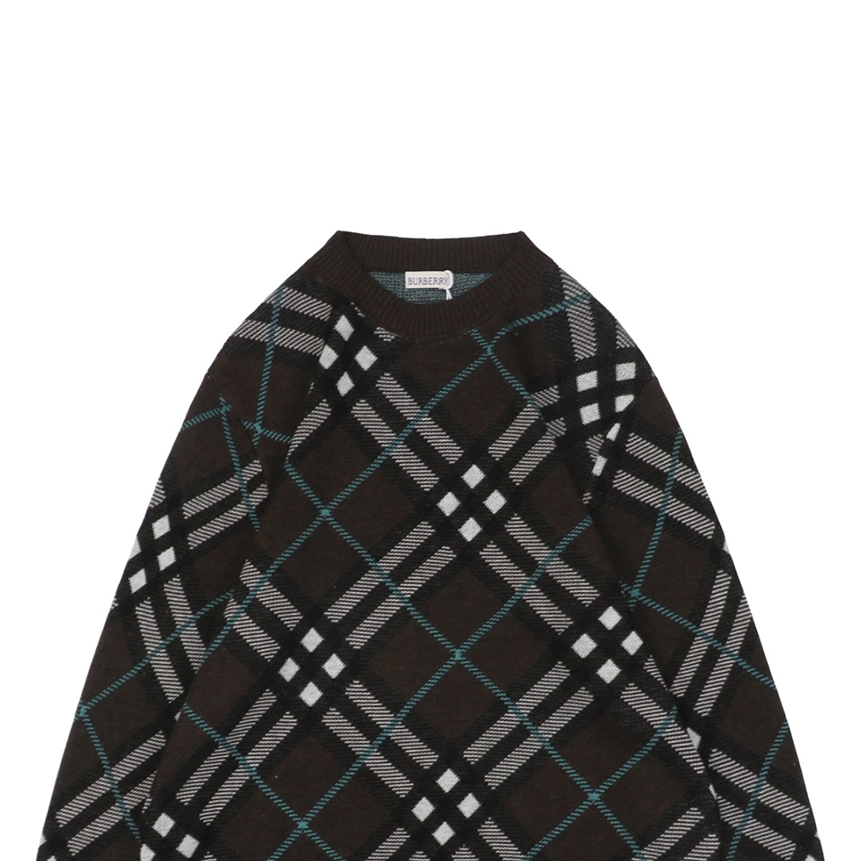 BBry Check Pattern Crewneck Sweater captures the essence of classic British fashion with a bold diagonal plaid motif in brown, black, and turquoise. Crafted from a cozy wool-blend knit, it features a ribbed collar, cuffs, and hem for a snug fit. The crewneck silhouette adds a timeless touch, making it suitable for both casual and elevated ensembles. A soft hand feel and structured weight ensure both warmth and style throughout the season.