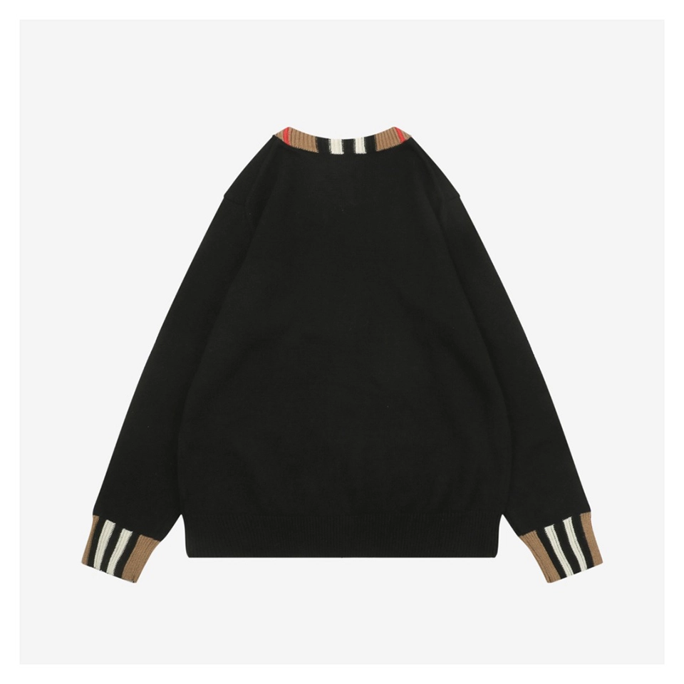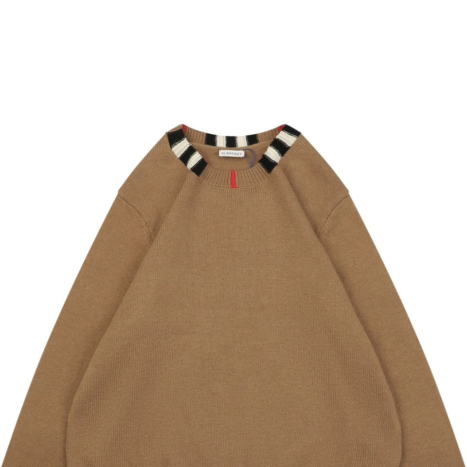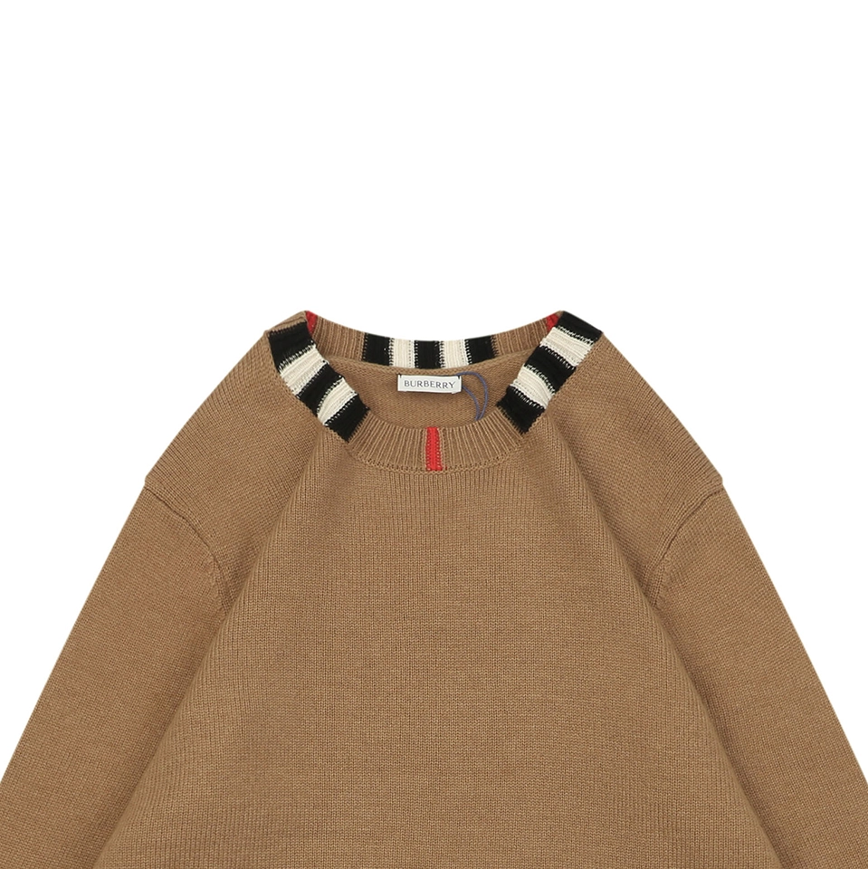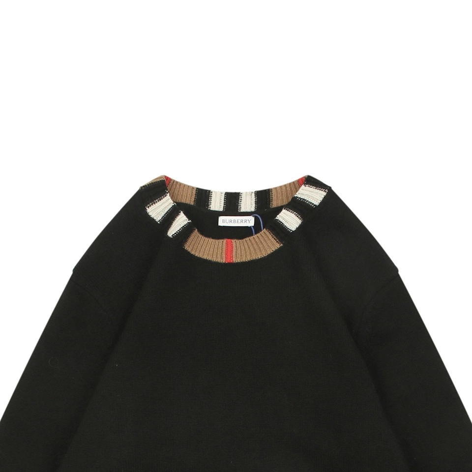 Produced through an extensive multi-step process—including flat knitting, manual finishing, precision linking, and seamless collar construction—the sweater is knitted on imported 9-gauge machines with controlled timing to ensure consistent texture and a structured drape. The classic ribbed crewneck is accented with signature BBry check detailing, adding understated visual depth without overpowering the minimalist silhouette.