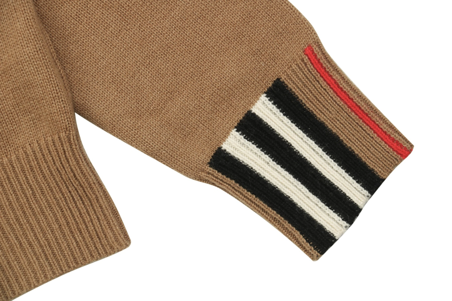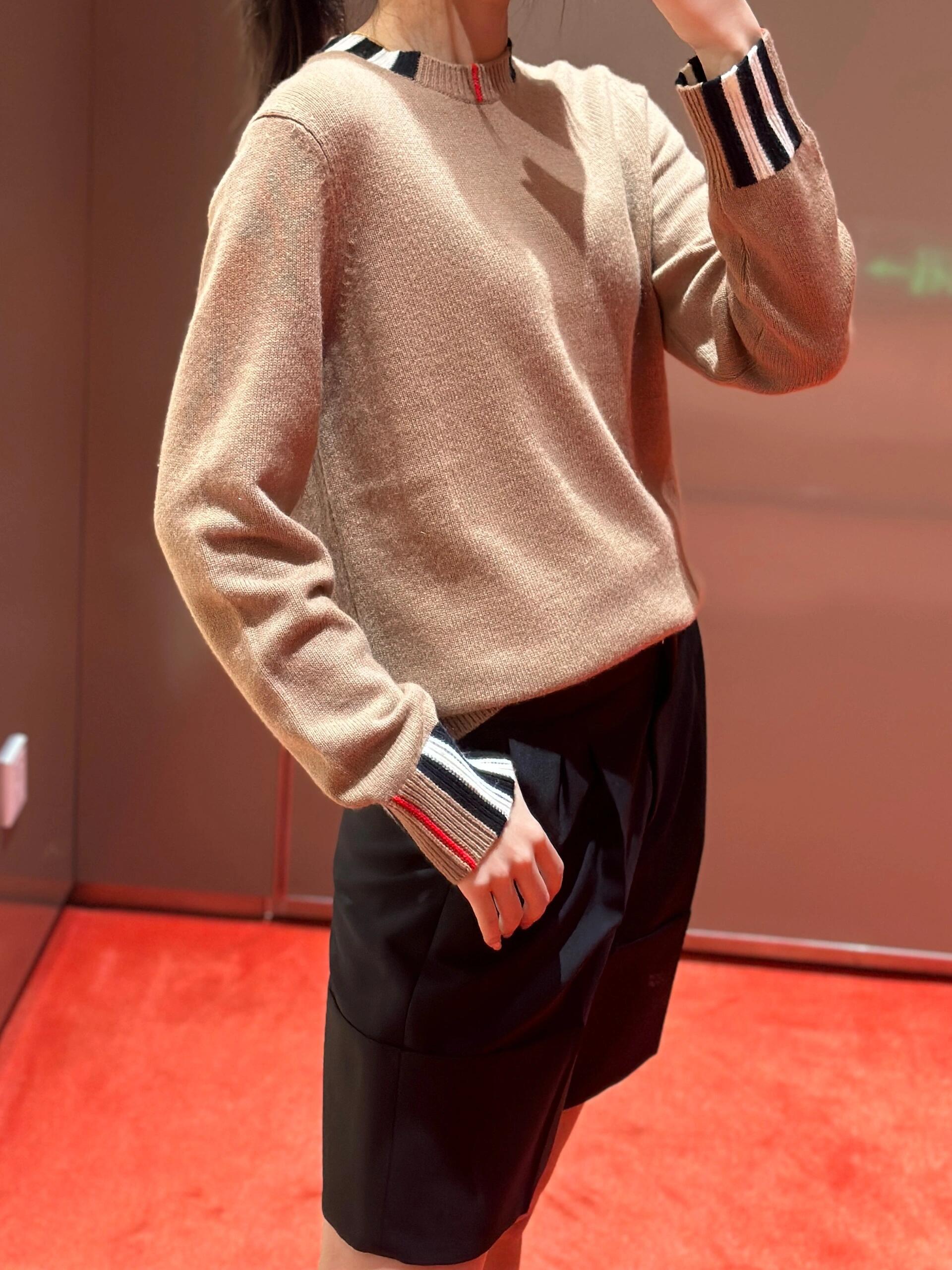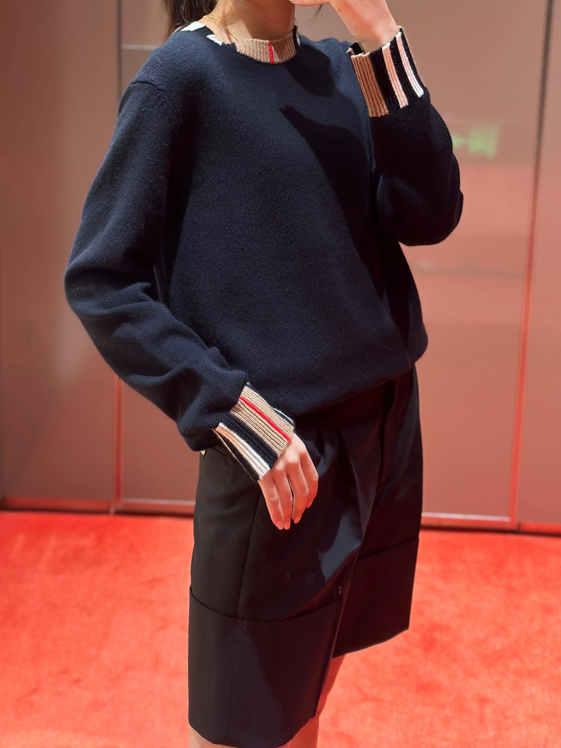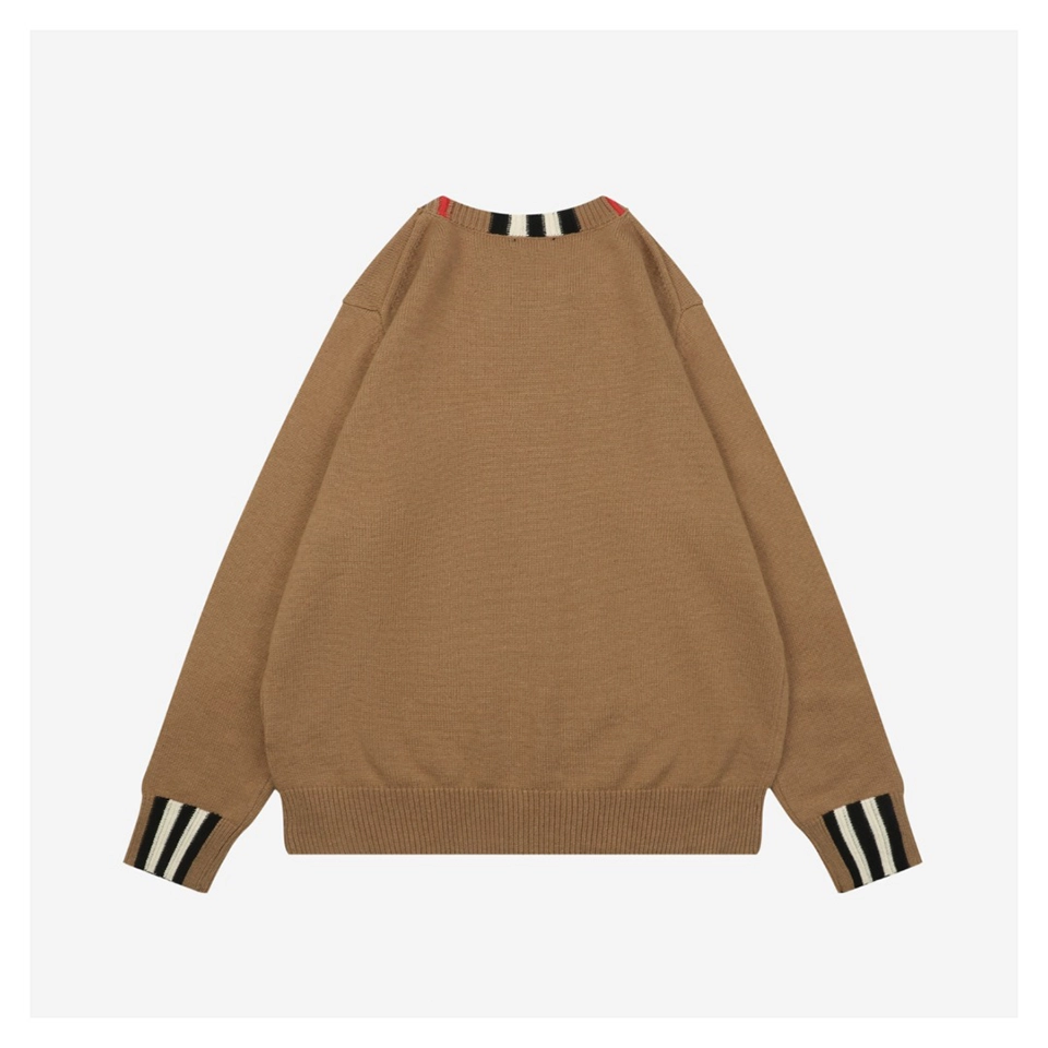 Produced through an extensive multi-step process—including flat knitting, manual finishing, precision linking, and seamless collar construction—the sweater is knitted on imported 9-gauge machines with controlled timing to ensure consistent texture and a structured drape. The classic ribbed crewneck is accented with signature BBry check detailing, adding understated visual depth without overpowering the minimalist silhouette.