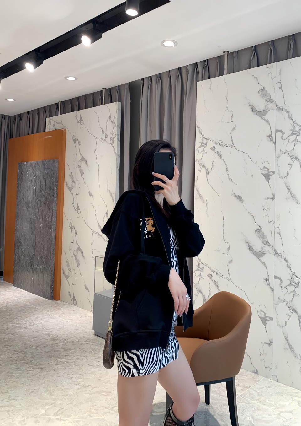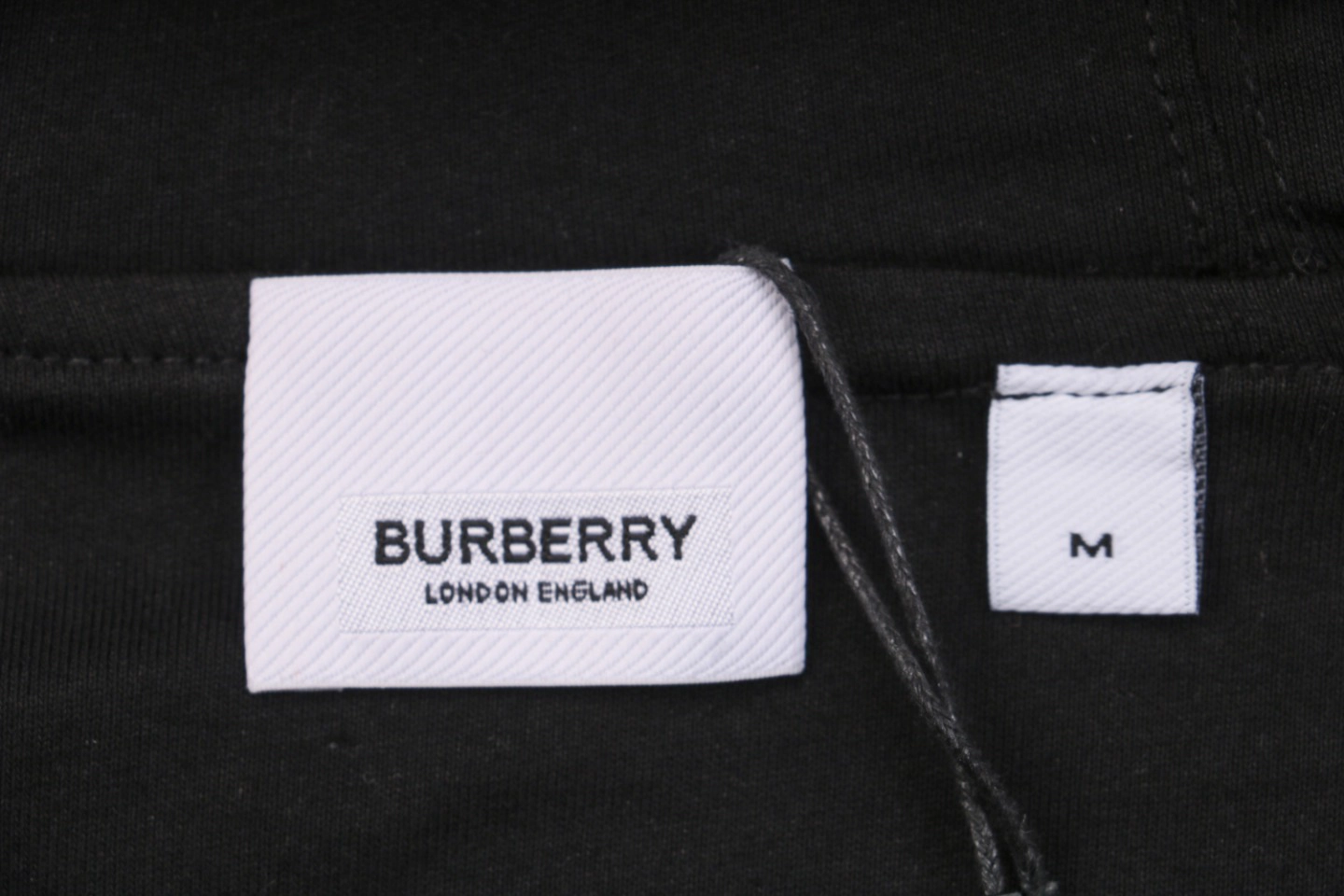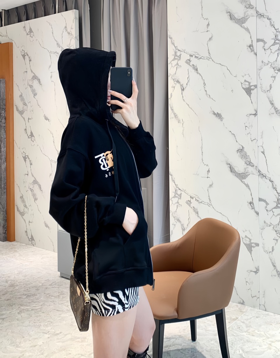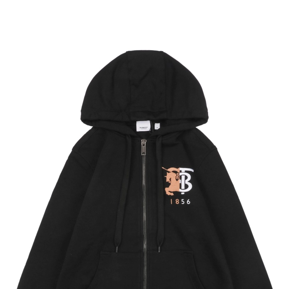 The BBry Colorblock Equestrian Logo Zip Hoodie brings iconic British heritage into modern streetwear. Made from soft cotton fleece, it features a tonal black base with an eye-catching dual-color chest embroidery: the TB monogram fused with a knight motif and the year “1856” for historical reference. Full zip front and drawstring hood complete the look.