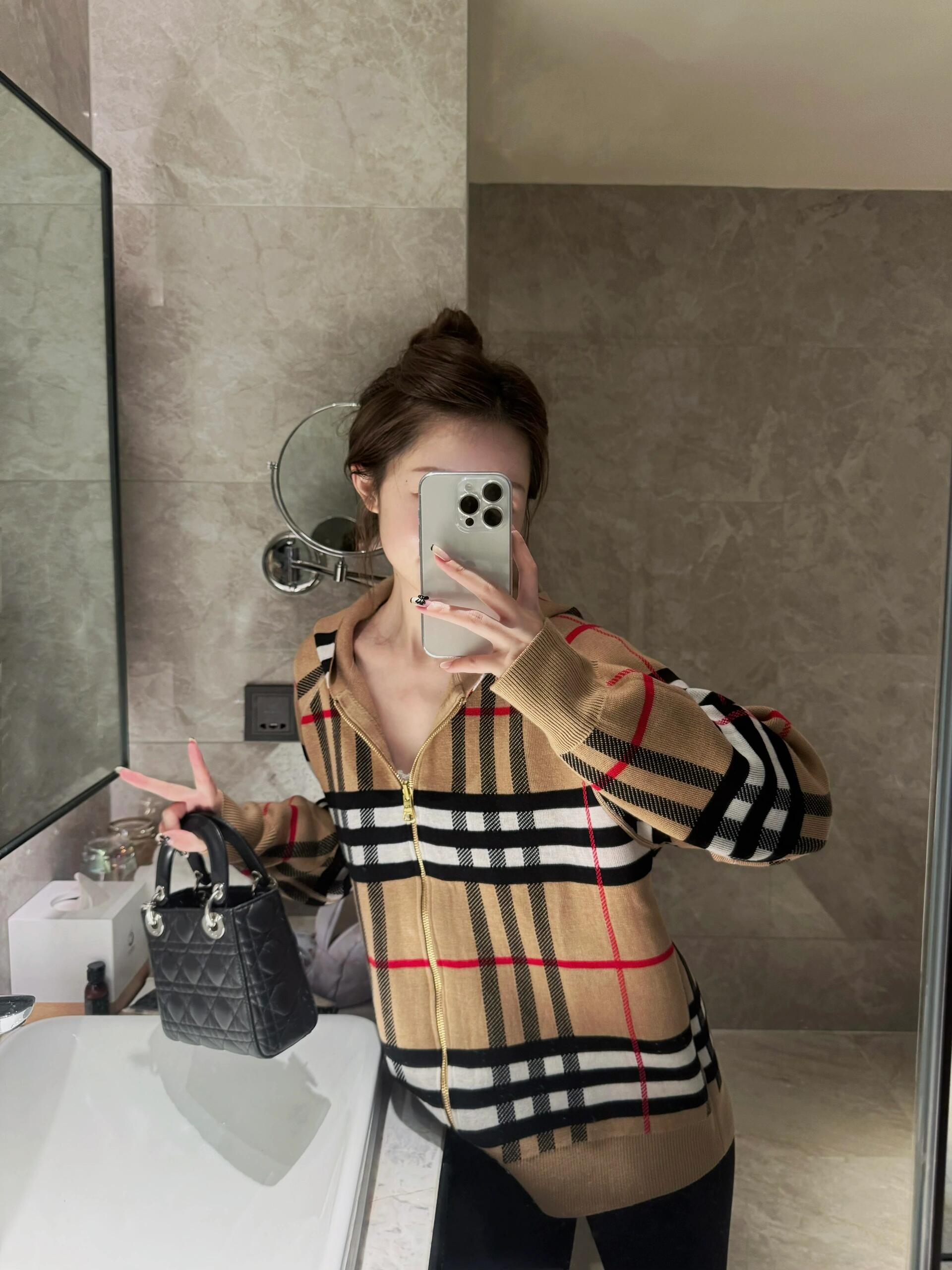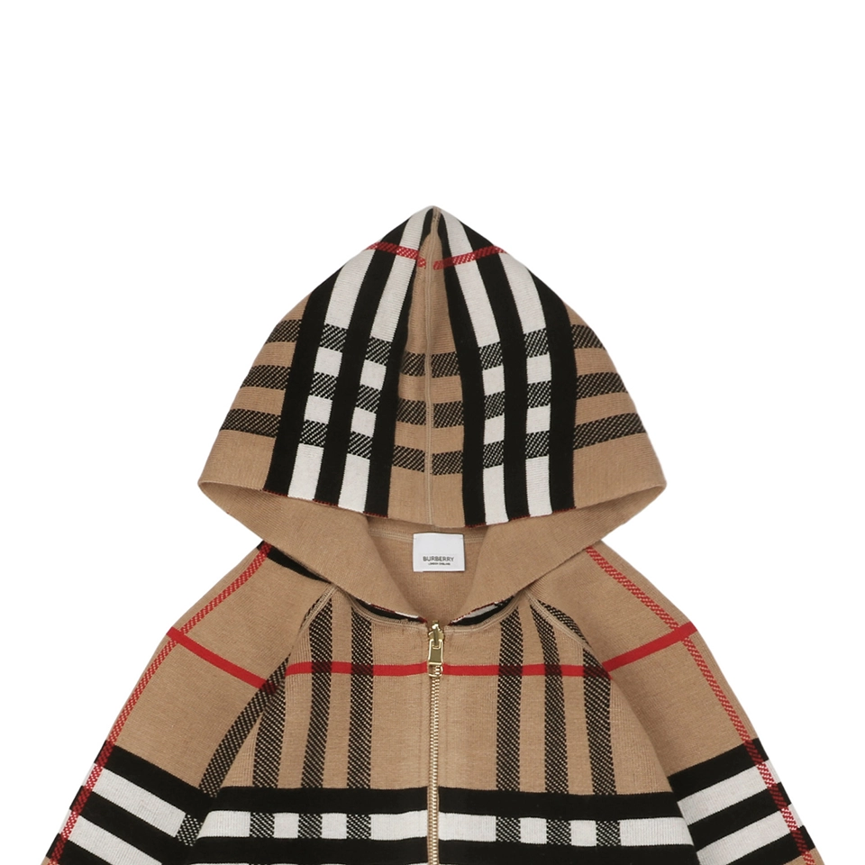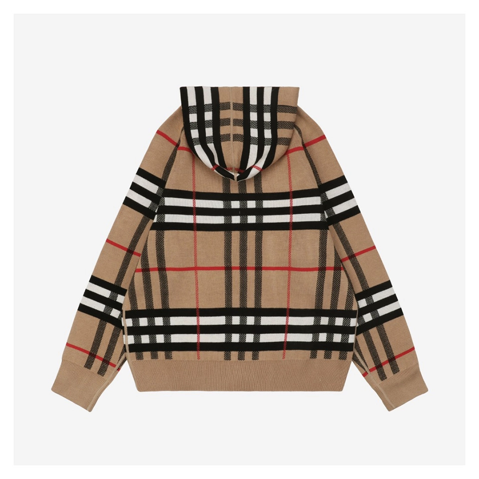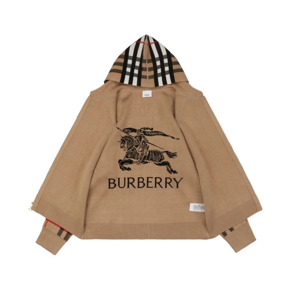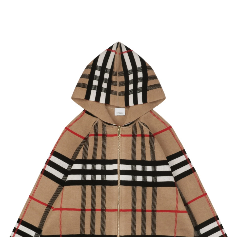 The BBry Reversible Check & Knight Zip Hoodie offers two distinct styles in one versatile garment. One side showcases the brand’s iconic check pattern in warm camel tones, while the reverse side features a plain finish with a bold equestrian knight motif embroidered across the back. Crafted from a soft, mid-weight knit with a structured hood and full-length gold zipper, this piece balances traditional heritage with modern utility.