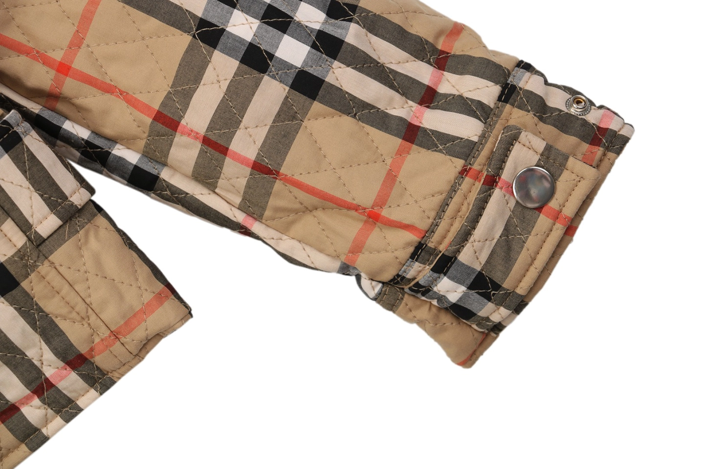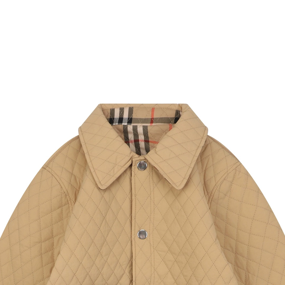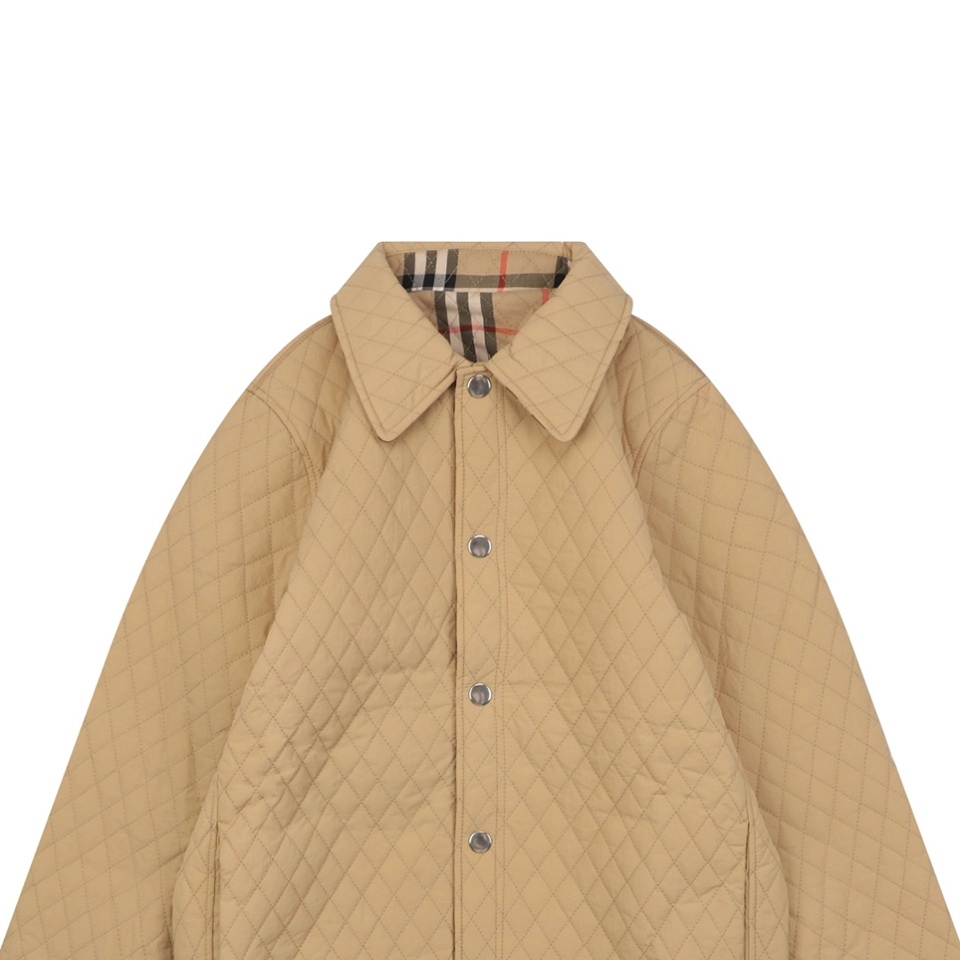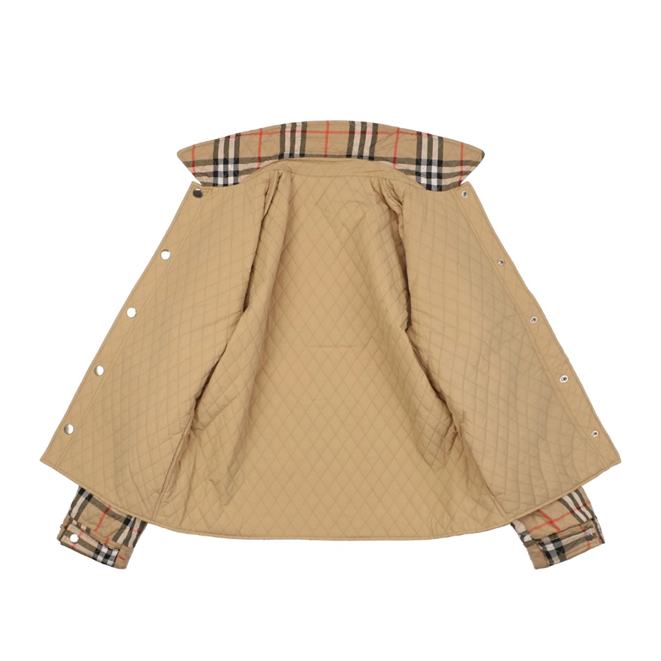 The BBry Small Quilted Reversible Jacket in khaki features the brand’s iconic vintage check pattern, crafted with ultra-fine diamond quilting for a refined, heritage-inspired look. Designed to be fully reversible, it offers two distinct styles in one piece, enhancing versatility for everyday wear. The lightweight padded interior provides comfortable warmth without bulkiness. Finished with custom-molded logo snap buttons and precise seam alignment, this jacket blends craftsmanship and modern utility effortlessly. Unisex design suitable for a wide range of personal styles.