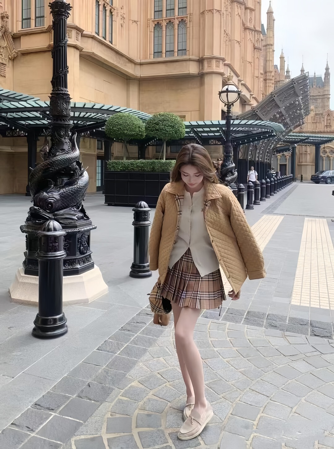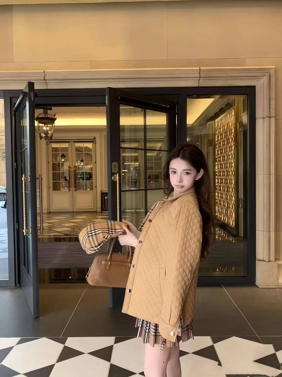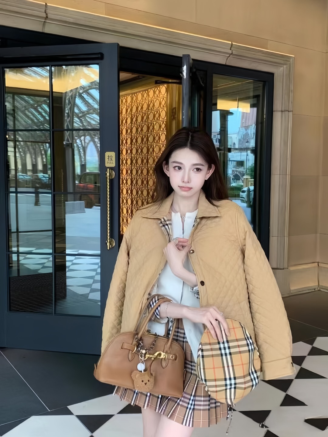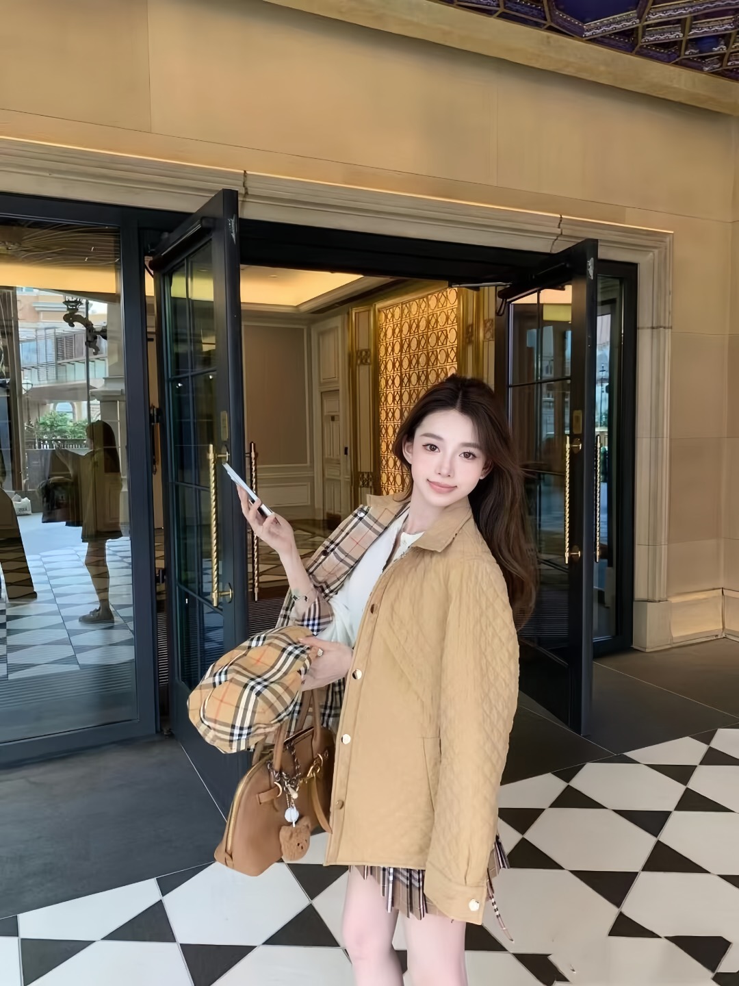 The BBry Small Quilted Reversible Jacket in khaki features the brand’s iconic vintage check pattern, crafted with ultra-fine diamond quilting for a refined, heritage-inspired look. Designed to be fully reversible, it offers two distinct styles in one piece, enhancing versatility for everyday wear. The lightweight padded interior provides comfortable warmth without bulkiness. Finished with custom-molded logo snap buttons and precise seam alignment, this jacket blends craftsmanship and modern utility effortlessly. Unisex design suitable for a wide range of personal styles.