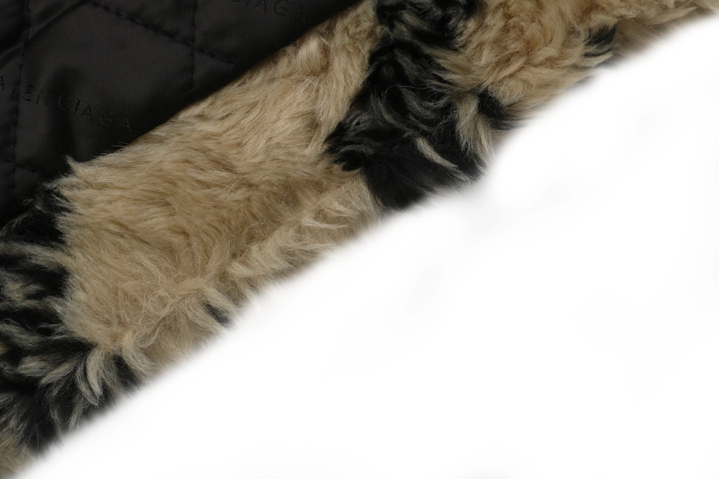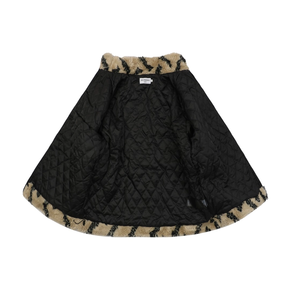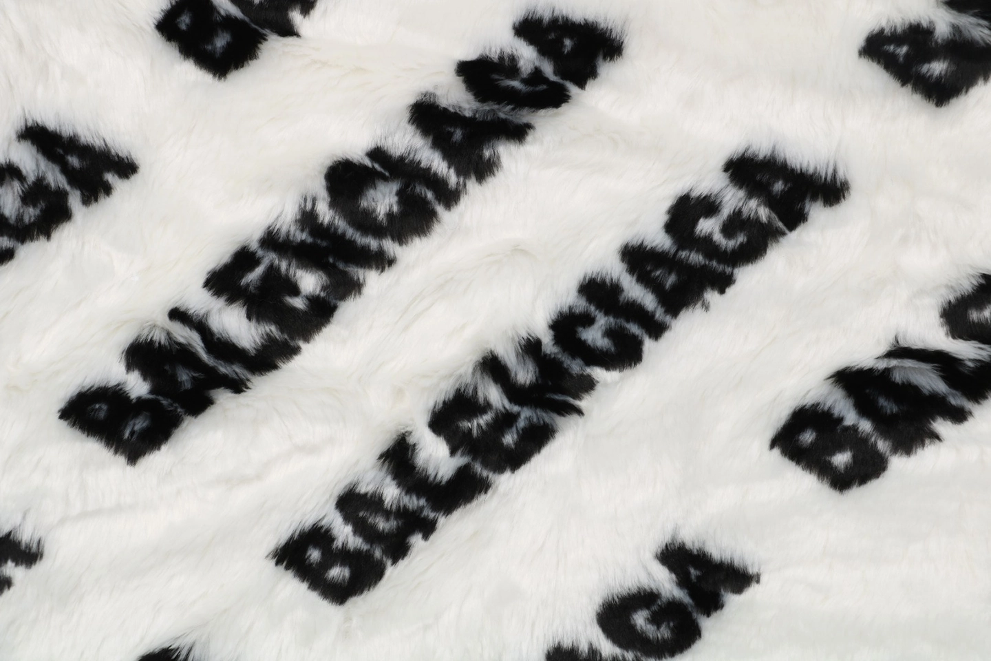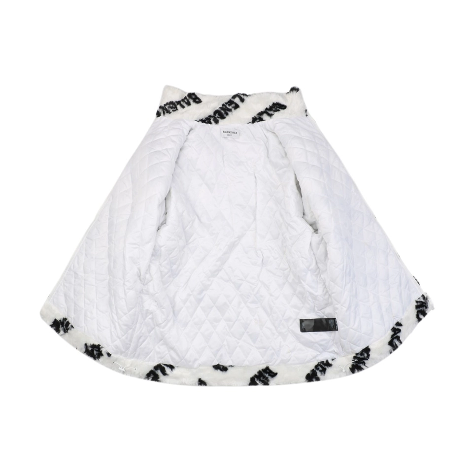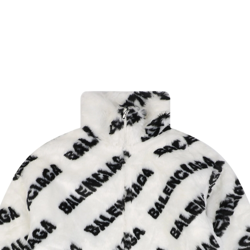 The jacket features an all-over Blcg Paris logo pattern in a dynamic “scrolling text” layout. Rather than standard printing, the lettering is integrated directly into the fur texture through specialized fabrication techniques, allowing the logo to merge seamlessly with the pile. The result is a visually striking yet refined finish with strong brand identity.