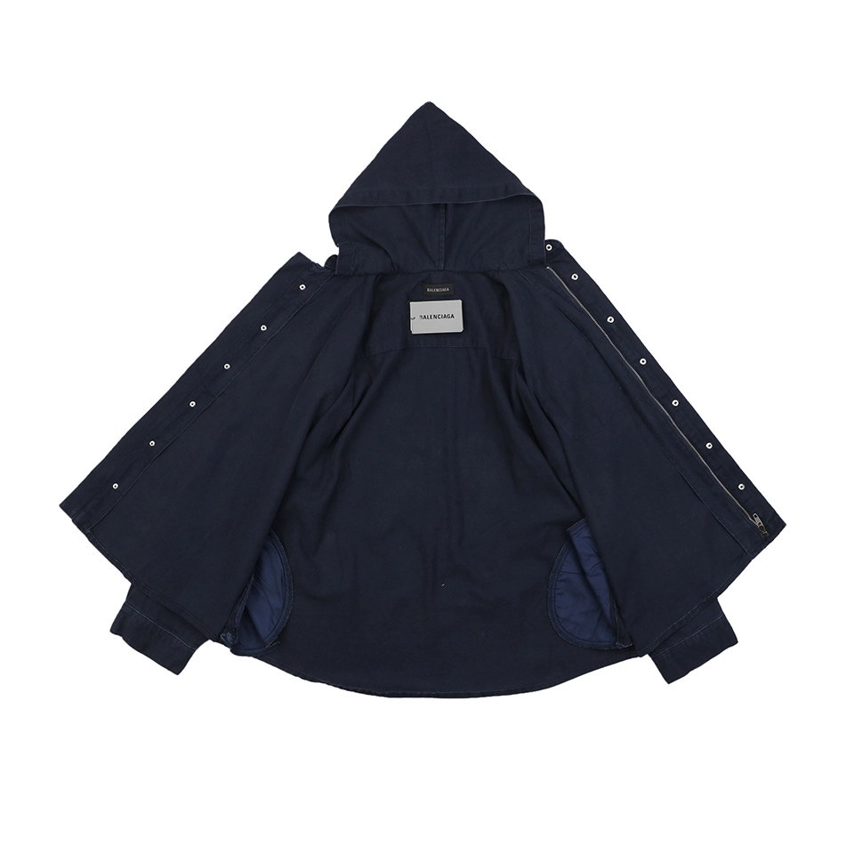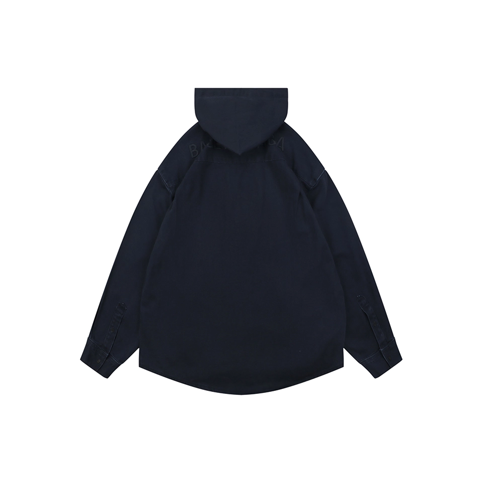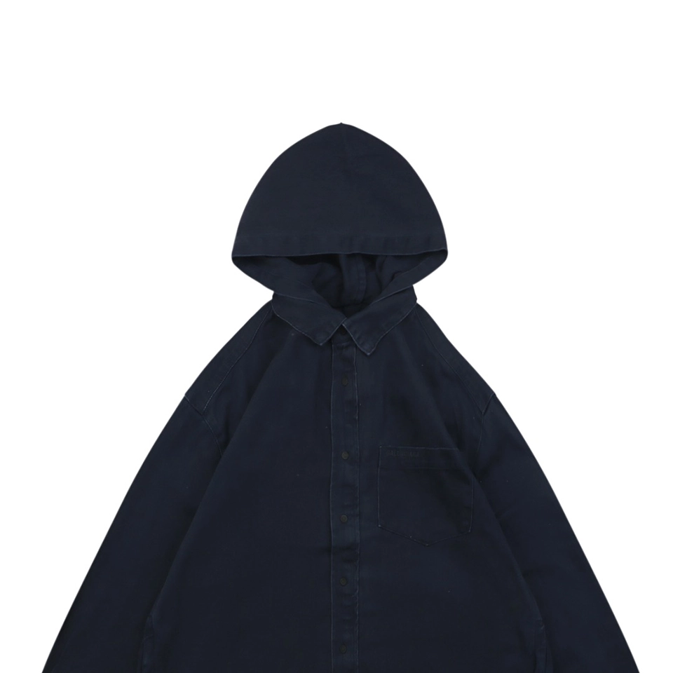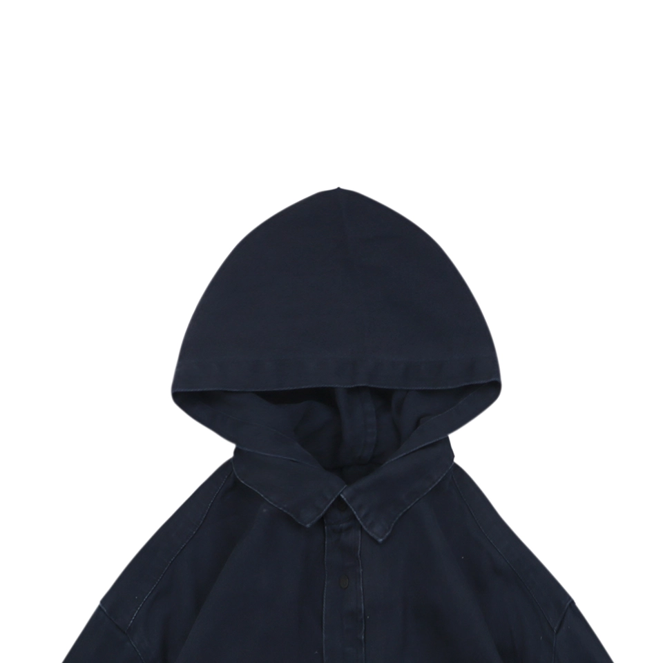 Crafted from heavyweight denim, the fabric is structured yet comfortable, enhanced by a multi-process wash that creates a naturally worn-in texture. The standout design features a fused shirt collar and hood construction, blending tailoring with streetwear for a distinctive layered look.