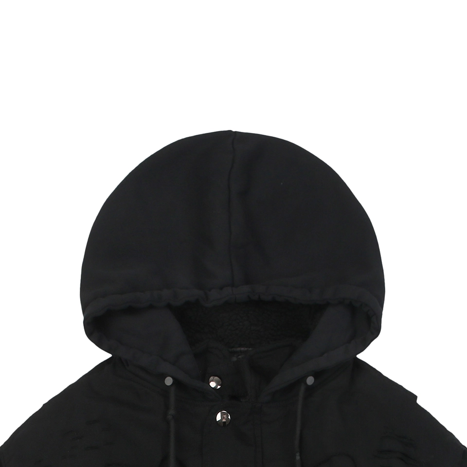 Crafted with Blcg’s signature avant-garde aesthetic, the Blcg Heavy Distressed Washed Hooded Jacket features a complex multi-layer destruction technique that makes each piece truly unique. Built from thickened military grid-woven fabric and finished with an all-over washed-black treatment, the jacket delivers a raw vintage texture that stands out from ordinary outerwear.