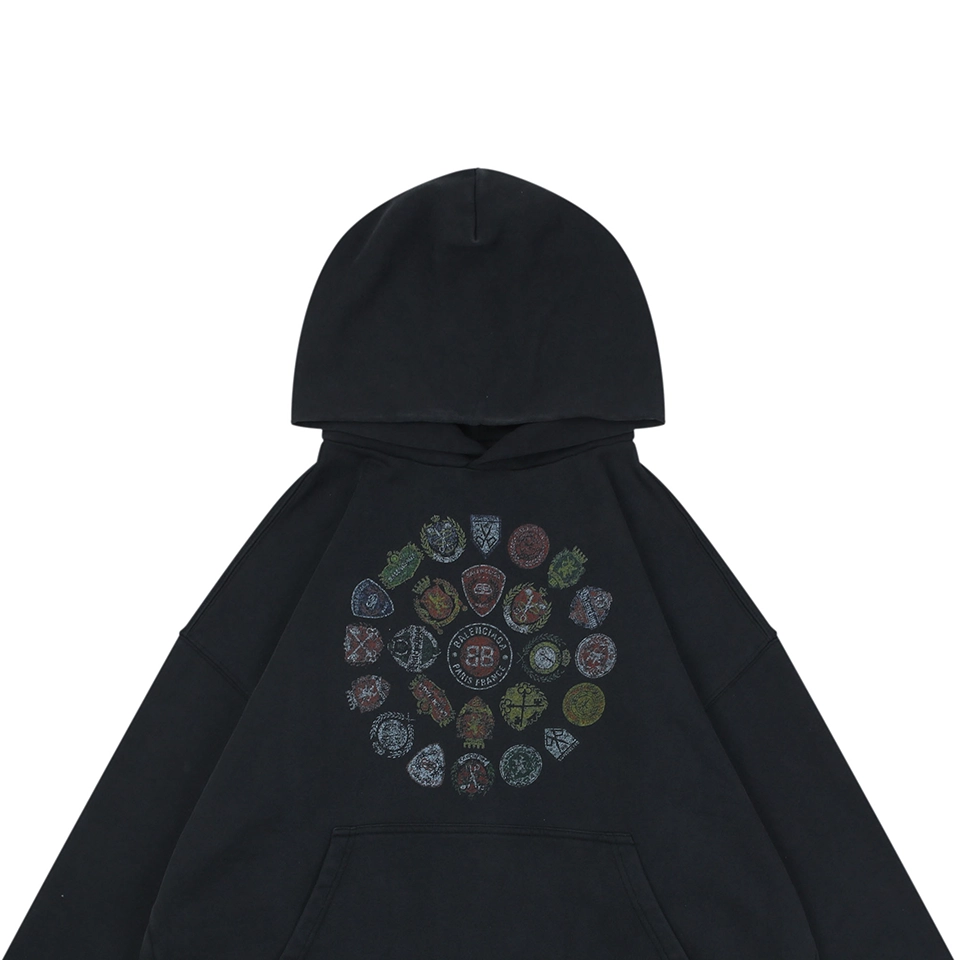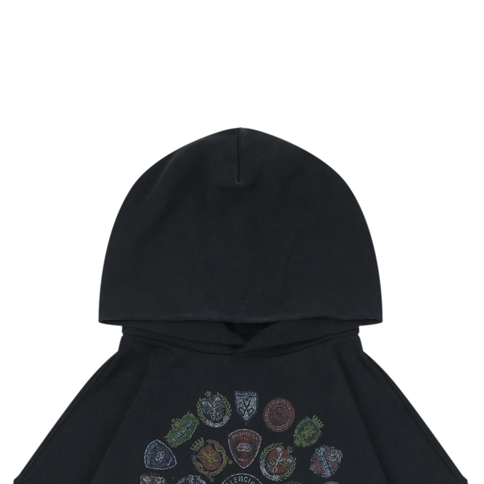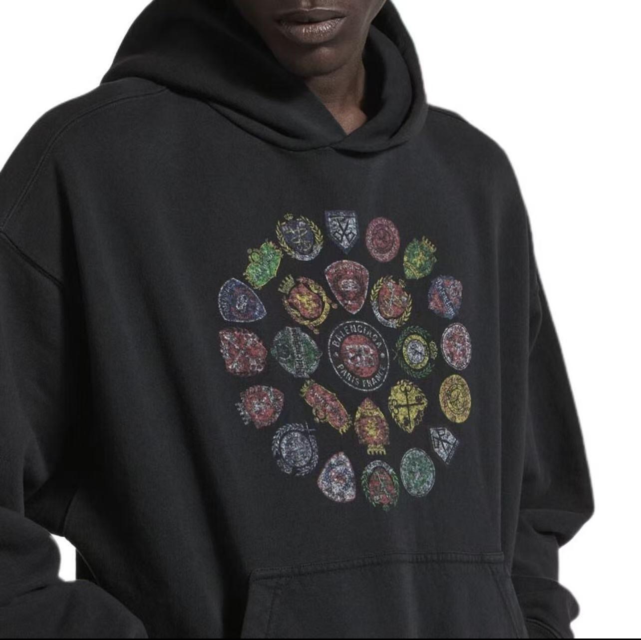 The front features a circle of multi-badge collegiate-style graphics, printed with high-definition, raised detailing for a premium tactile finish. Across the back, the bold Gothic “Balenciaga” logo adds strong visual impact. Designed with an oversized dropped-shoulder silhouette and a clean hood without drawstrings, the hoodie drapes effortlessly while enhancing shoulder shape.