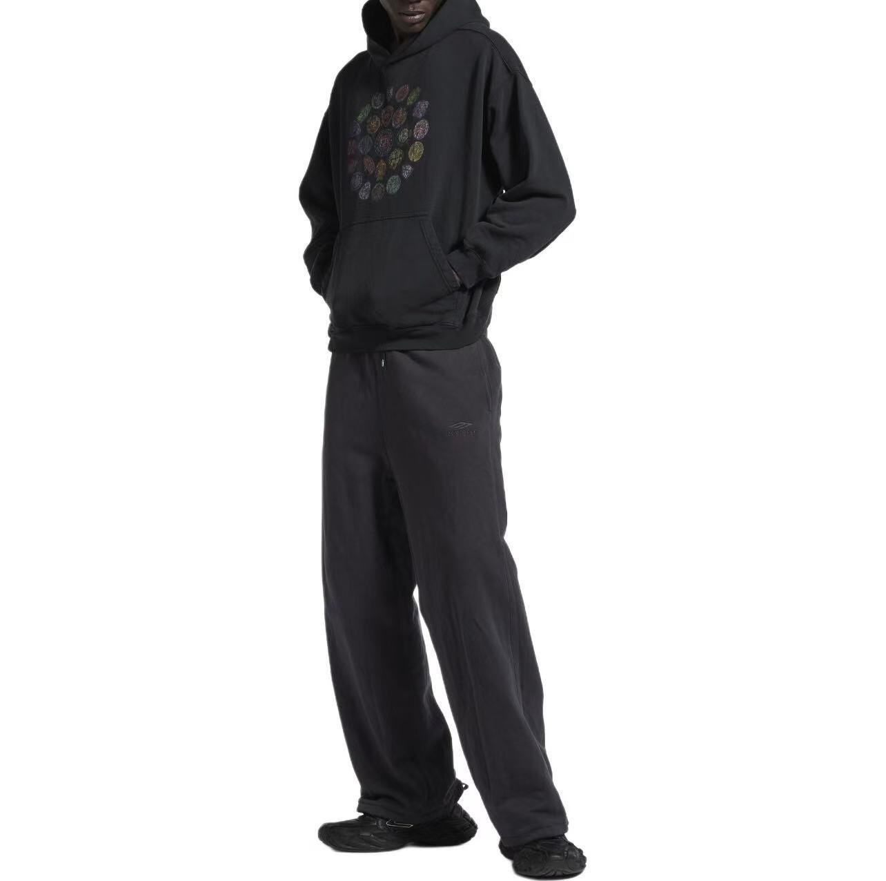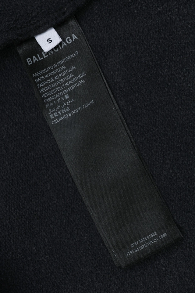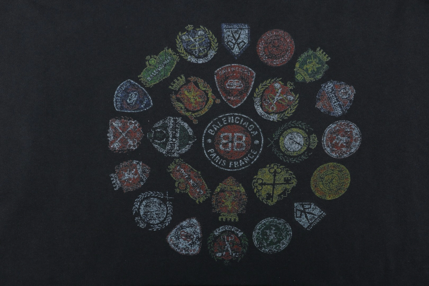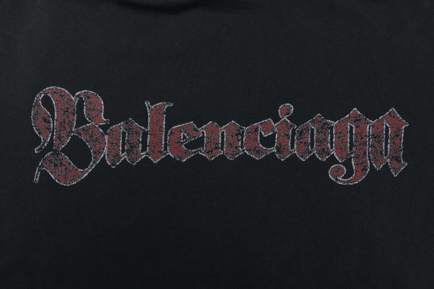 The front features a circle of multi-badge collegiate-style graphics, printed with high-definition, raised detailing for a premium tactile finish. Across the back, the bold Gothic “Balenciaga” logo adds strong visual impact. Designed with an oversized dropped-shoulder silhouette and a clean hood without drawstrings, the hoodie drapes effortlessly while enhancing shoulder shape.