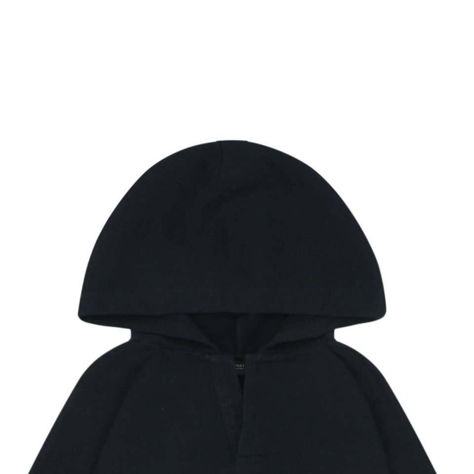 The hoodie undergoes a layered stone-wash and enzyme-wash process. Stone washing creates a naturally faded, textured surface through physical abrasion, while enzyme washing gently removes excess pigments at the fiber level, resulting in rich tonal depth and a softer hand feel.