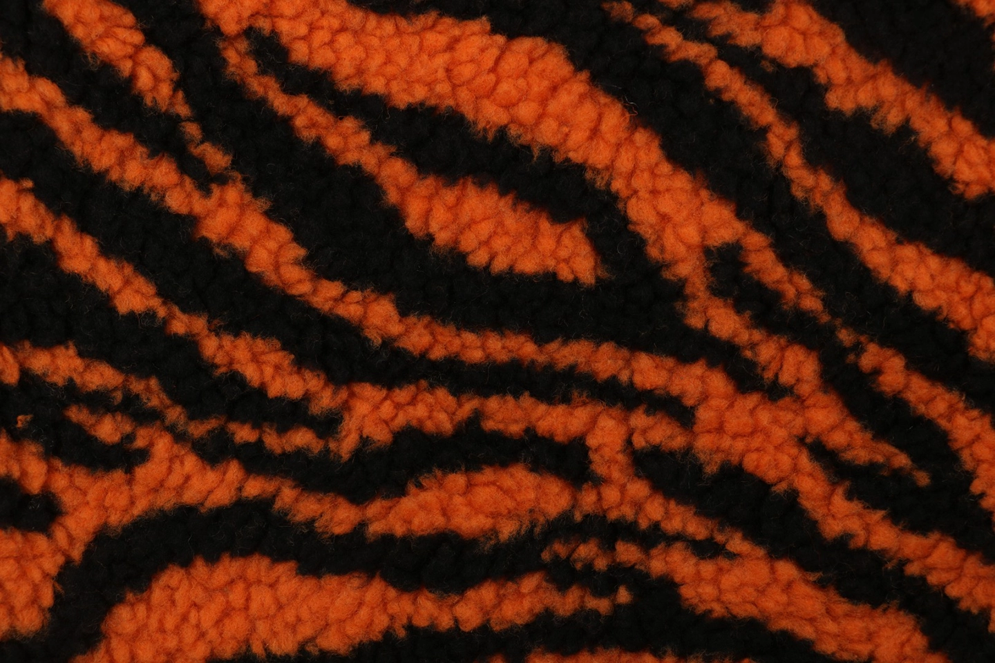 • Custom teddy fleece fabric with bold tiger stripe pattern