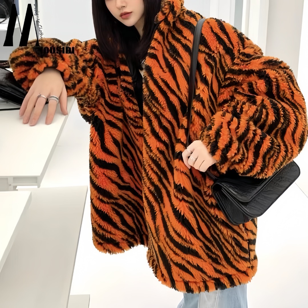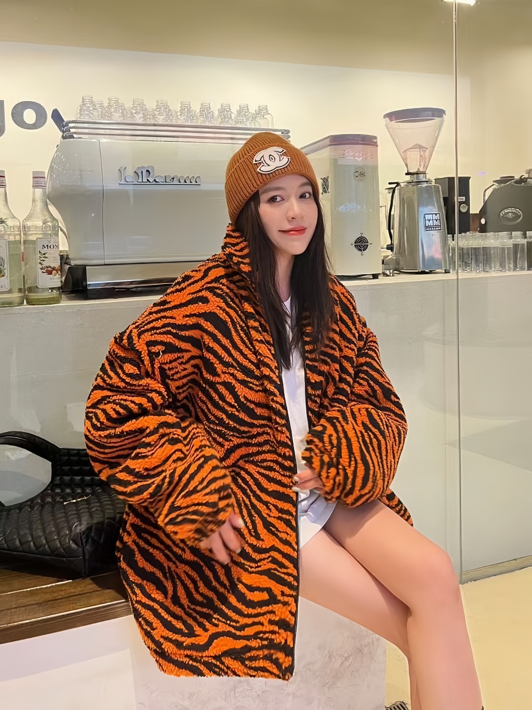 The Blcg Tiger Stripe Teddy Fleece Zip-Up Jacket is inspired by bold 1980s retro aesthetics, featuring an eye-catching tiger stripe pattern that delivers strong visual impact and distinctive character. Crafted from a custom-developed teddy fleece fabric, the material undergoes a same-bath dyeing process to ensure rich color depth and consistent pattern definition throughout the garment.