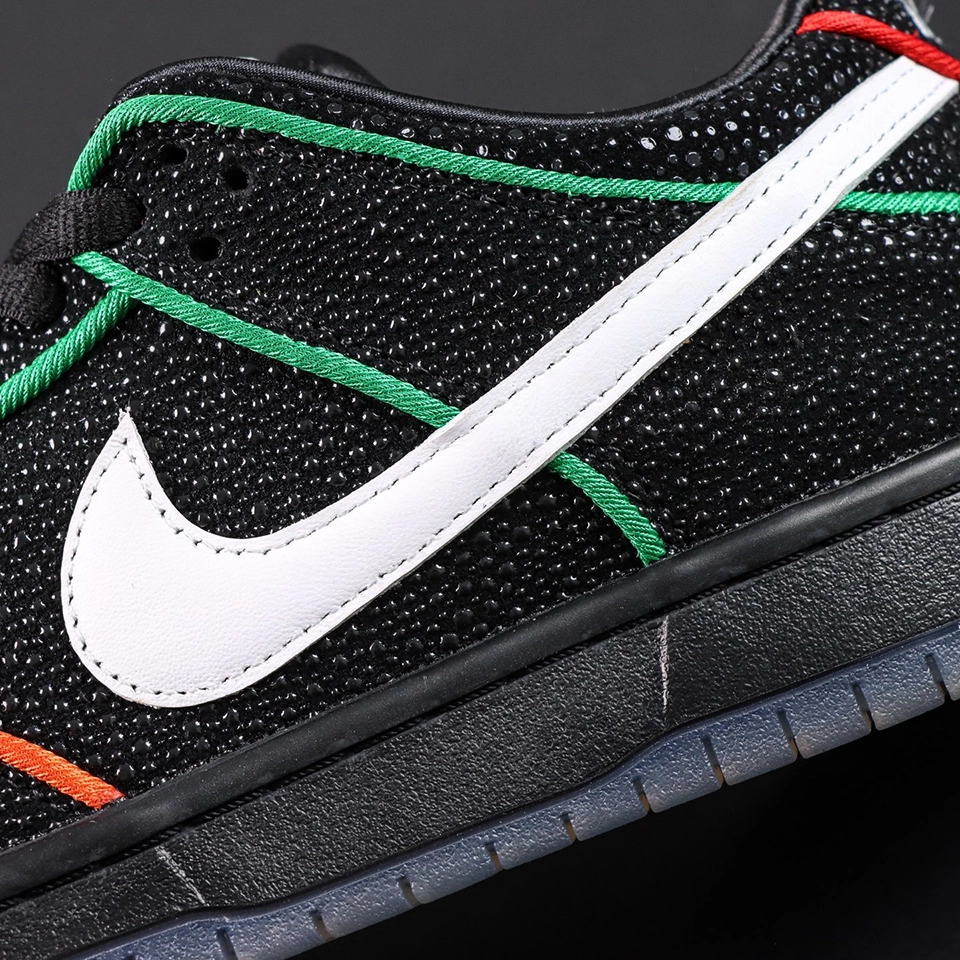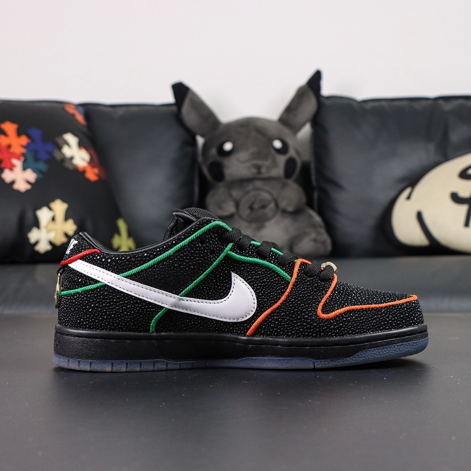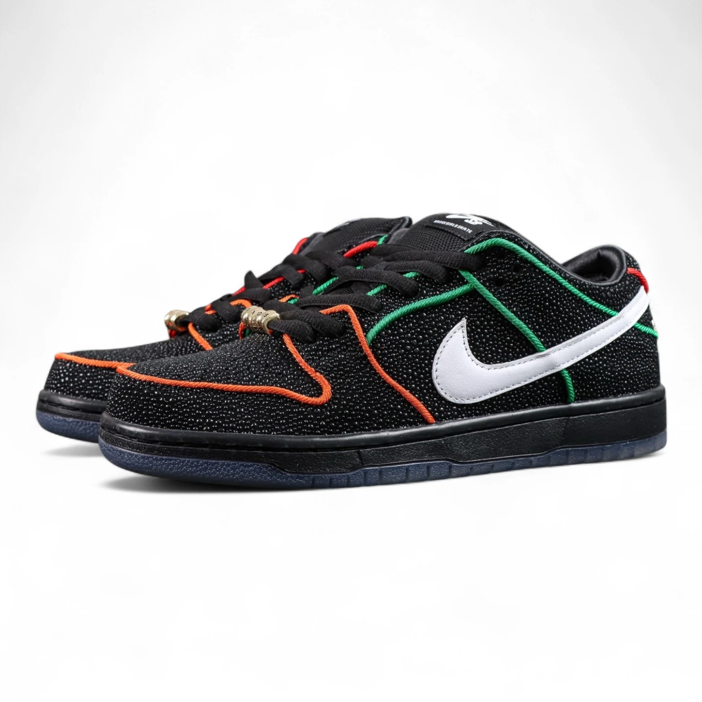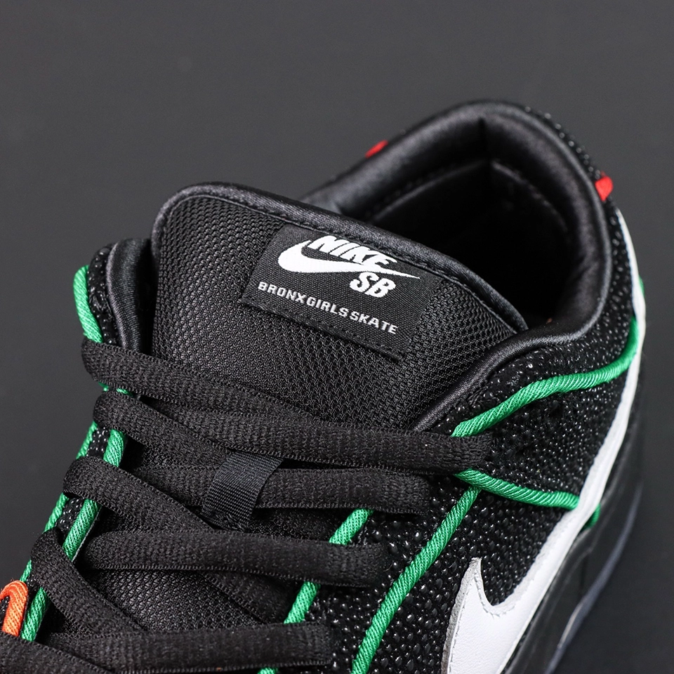 The Bronx Girls Skate x Dunk Low SB ‘Mel & Kava’ celebrates community, resilience, and vibrant street culture. The upper showcases a bold black stingray-textured base, highlighted by multicolored piping in orange, green, and red, paying homage to cultural pride. A crisp white leather Swoosh contrasts the dark backdrop, while dual golden lace dubraes nod to the two namesakes, Mel & Kava. Designed for skateboarding, the pair is equipped with Zoom Air cushioning and a grippy semi-translucent outsole, blending expressive style with street-ready performance.