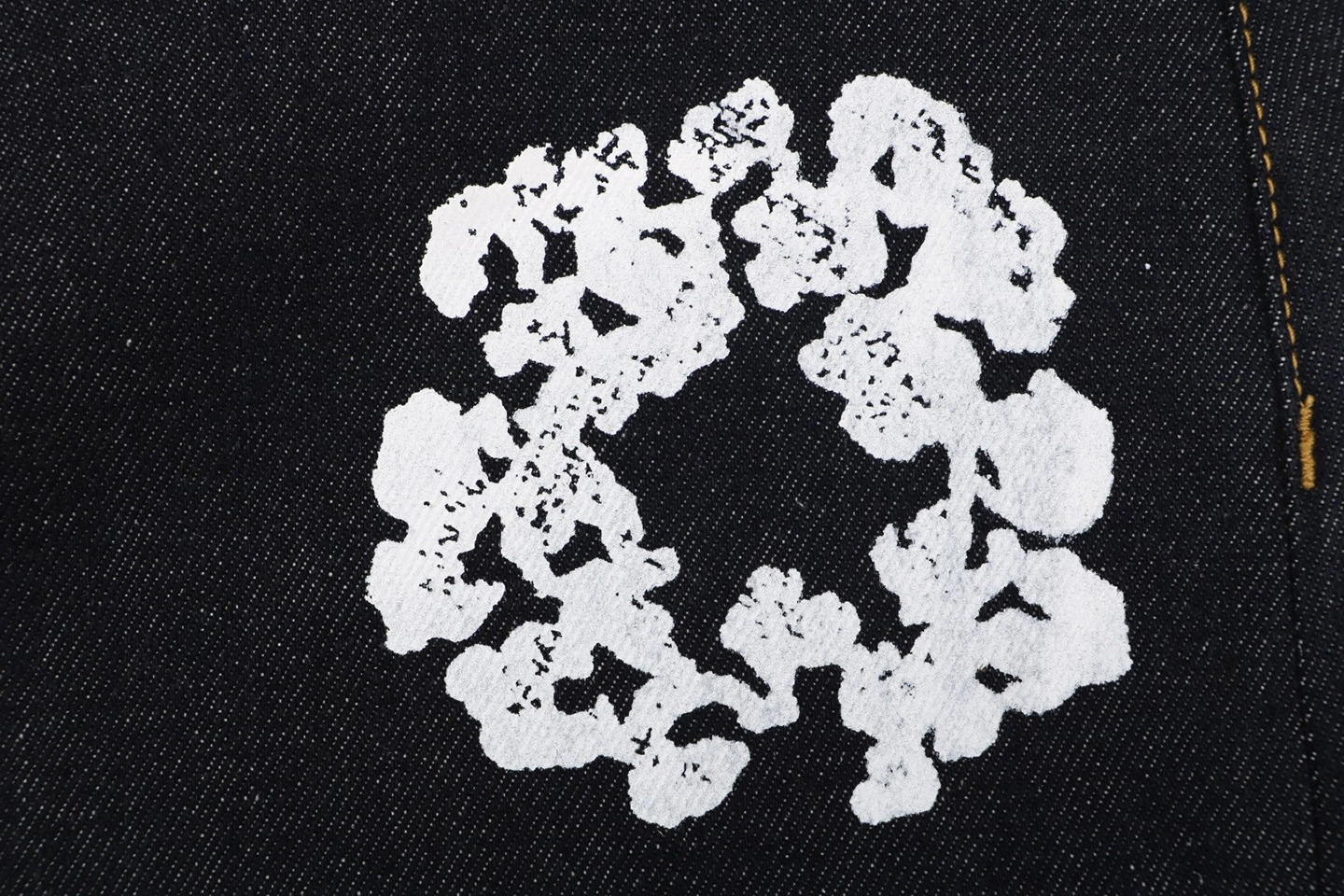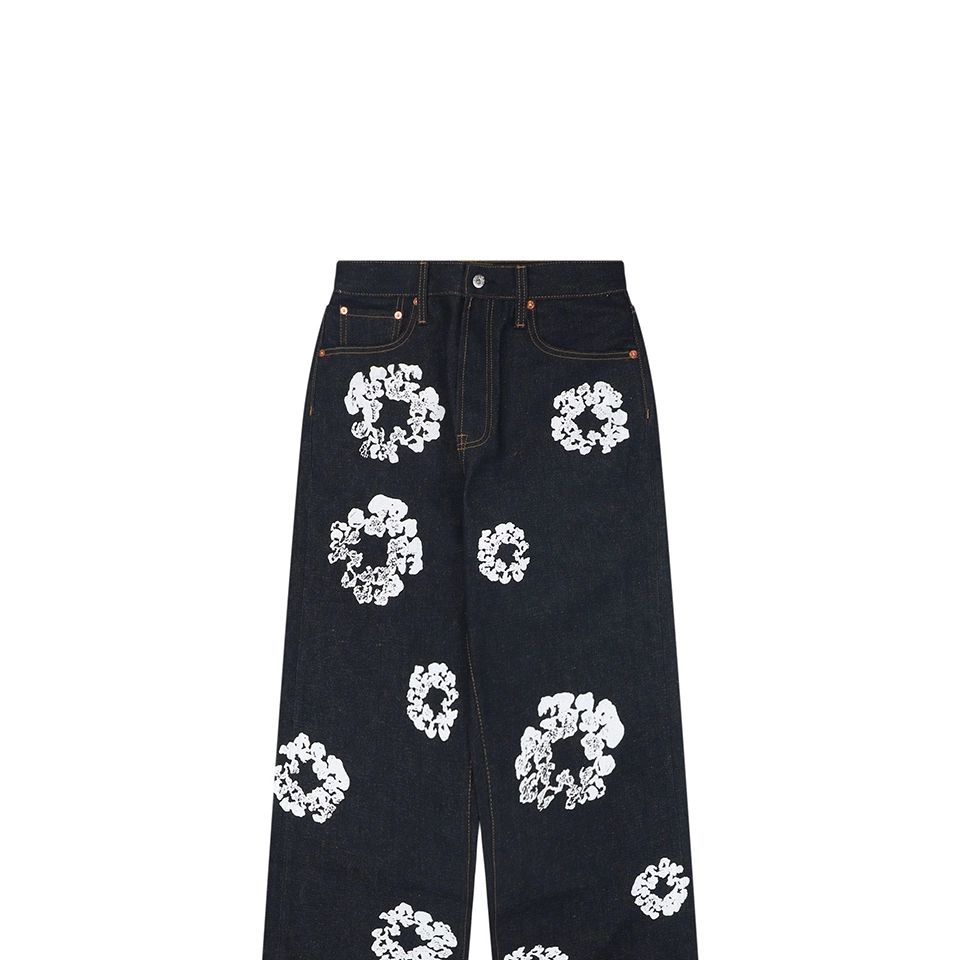 The jeans are highlighted by the signature cotton wreath graphics, applied through precise garment-position printing and enhanced with multiple wash treatments to create a subtle vintage worn effect. The print integrates naturally with the denim grain, delivering a strong retro aesthetic.