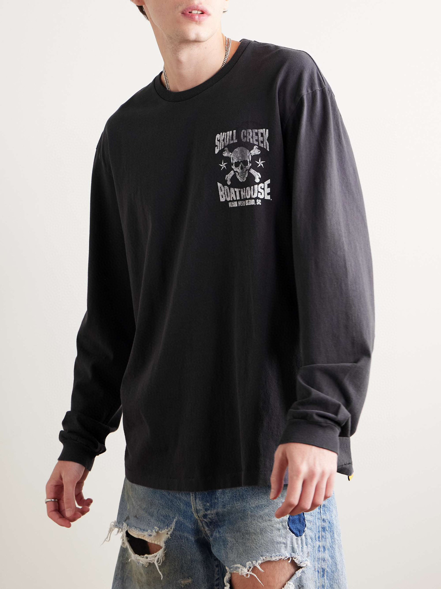 The Gallery Dept Skull Surfing Foil Glitter Print Shirt delivers a bold surf-inspired aesthetic with a rebellious twist. The front features a minimalist skull-and-stars chest print, while the back explodes with energy through a large skeleton-on-surfboard graphic, accented with shimmering gold foil text and white glitter detailing. Crafted from heavyweight cotton and finished with ribbed cuffs and a crew neckline, this long-sleeve piece channels streetwear grit and vintage Americana flair in one compelling statement.