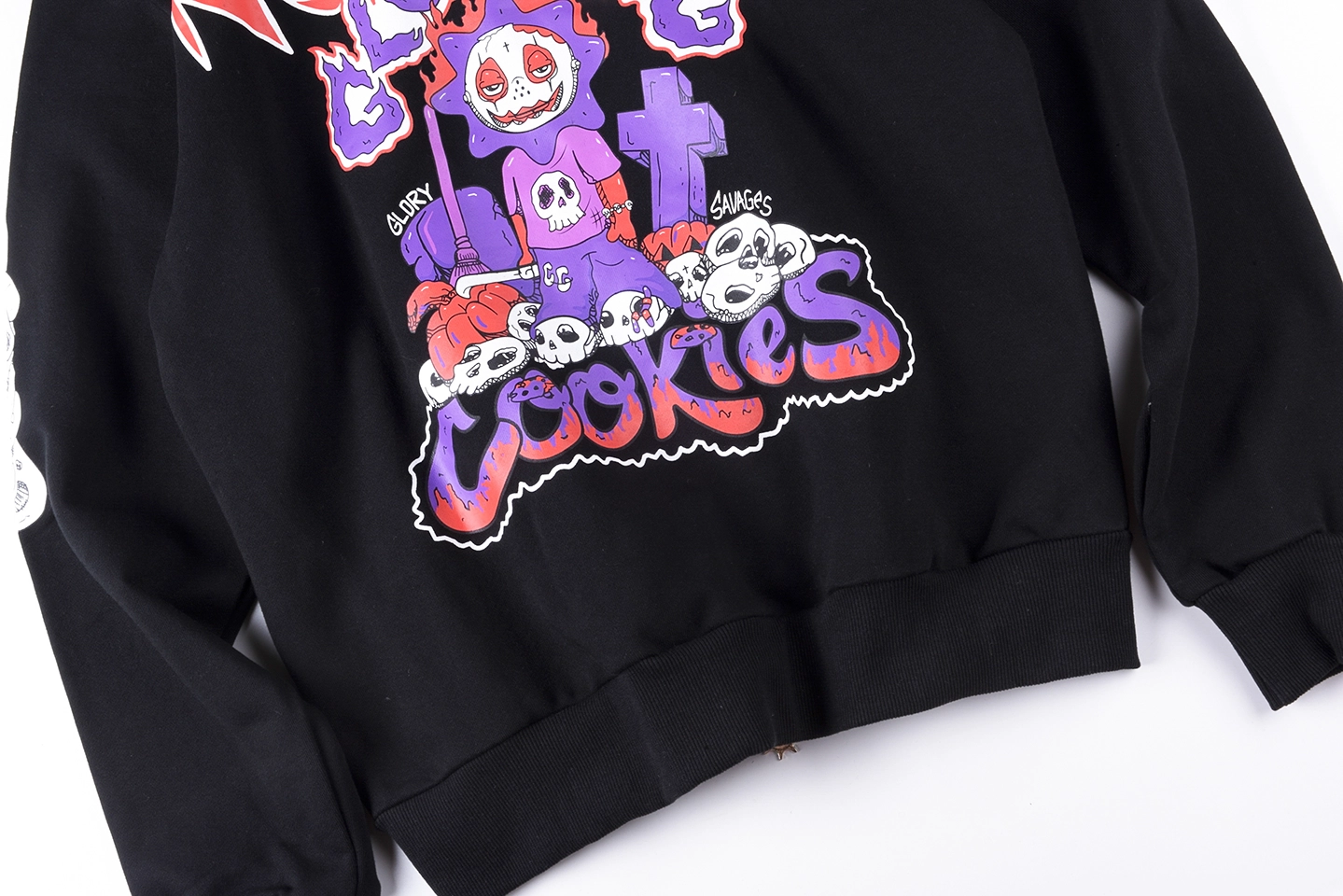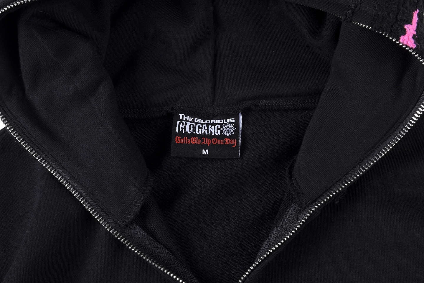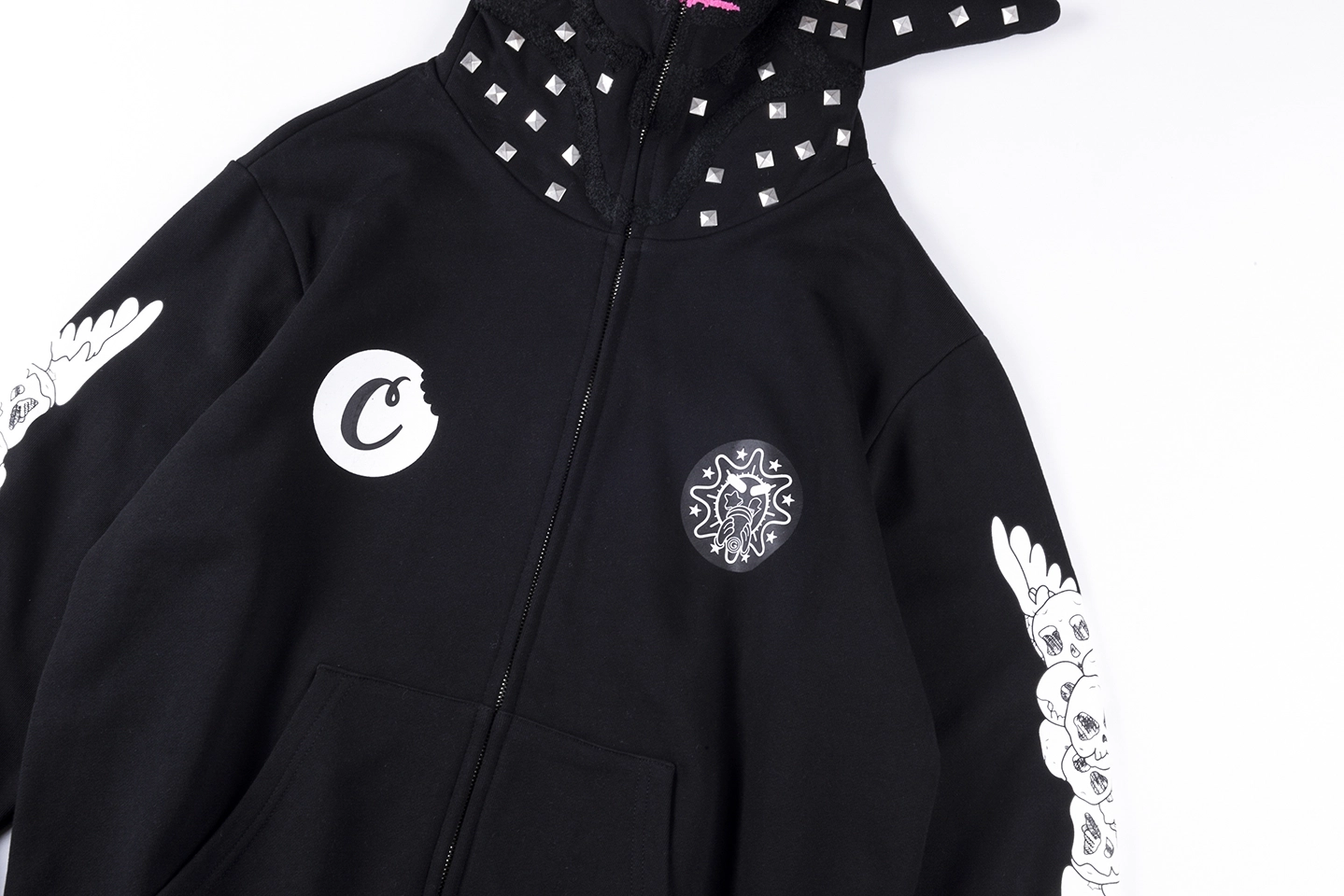 The Glo Gang Nightmare Cookies Spiked Hood Full-Zip Hoodie unleashes a dark, horror-infused street aesthetic driven by aggressive detailing and cult graphics. Built on a clean jet black base, the hoodie features a fully enclosed spiked hood design covered in metal studs, highlighted with embroidered red eyes and facial graphics for a menacing look when zipped up. The back showcases a bold “Nightmare Glo Gang Cookies” cartoon graphic, blending twisted animation with graffiti-style typography. Finished with all-over sleeve graphics and a functional full-zip construction, this piece is pure statement energy.
