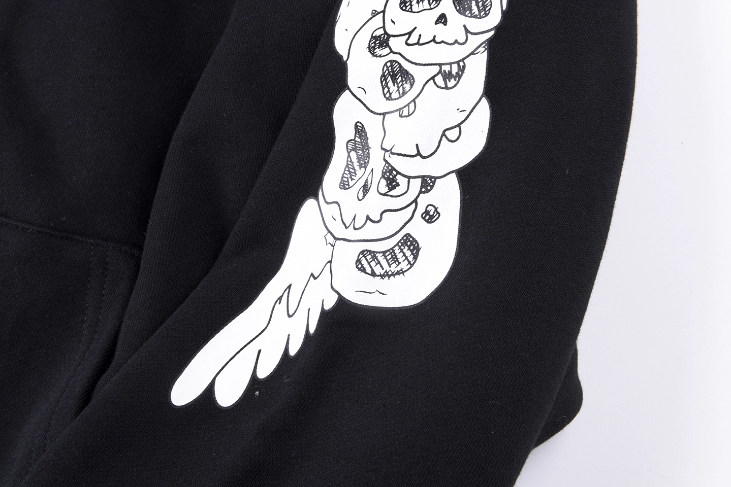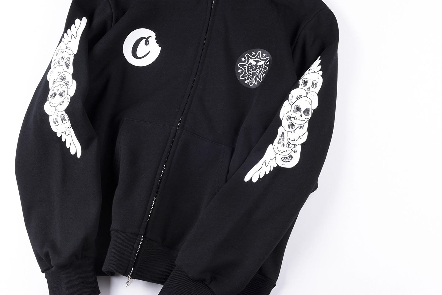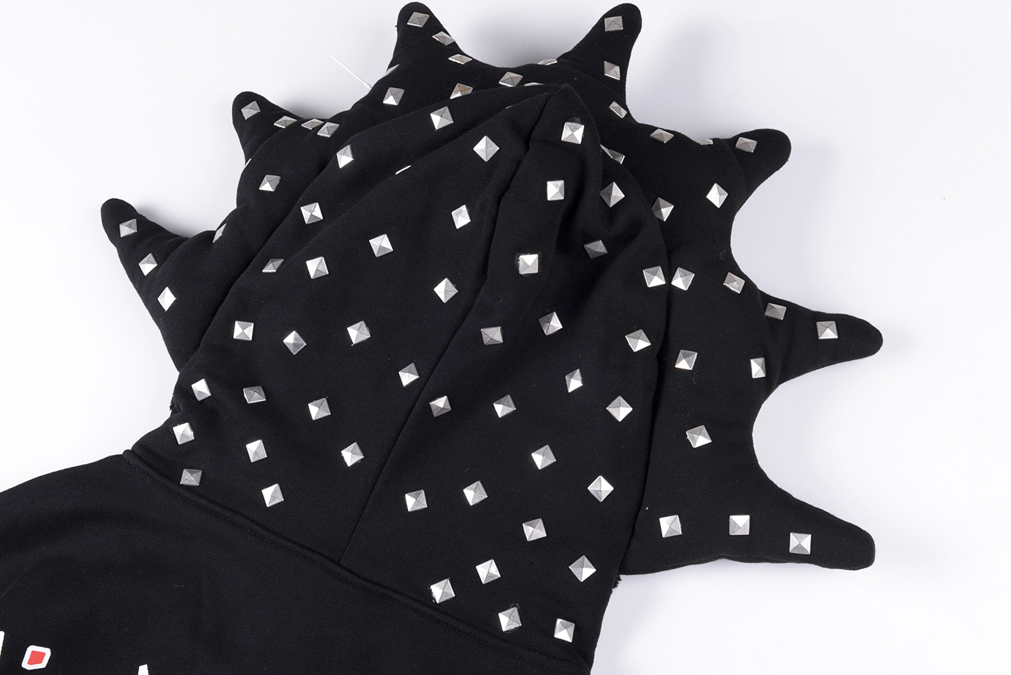 The Glo Gang Nightmare Cookies Spiked Hood Full-Zip Hoodie unleashes a dark, horror-infused street aesthetic driven by aggressive detailing and cult graphics. Built on a clean jet black base, the hoodie features a fully enclosed spiked hood design covered in metal studs, highlighted with embroidered red eyes and facial graphics for a menacing look when zipped up. The back showcases a bold “Nightmare Glo Gang Cookies” cartoon graphic, blending twisted animation with graffiti-style typography. Finished with all-over sleeve graphics and a functional full-zip construction, this piece is pure statement energy.