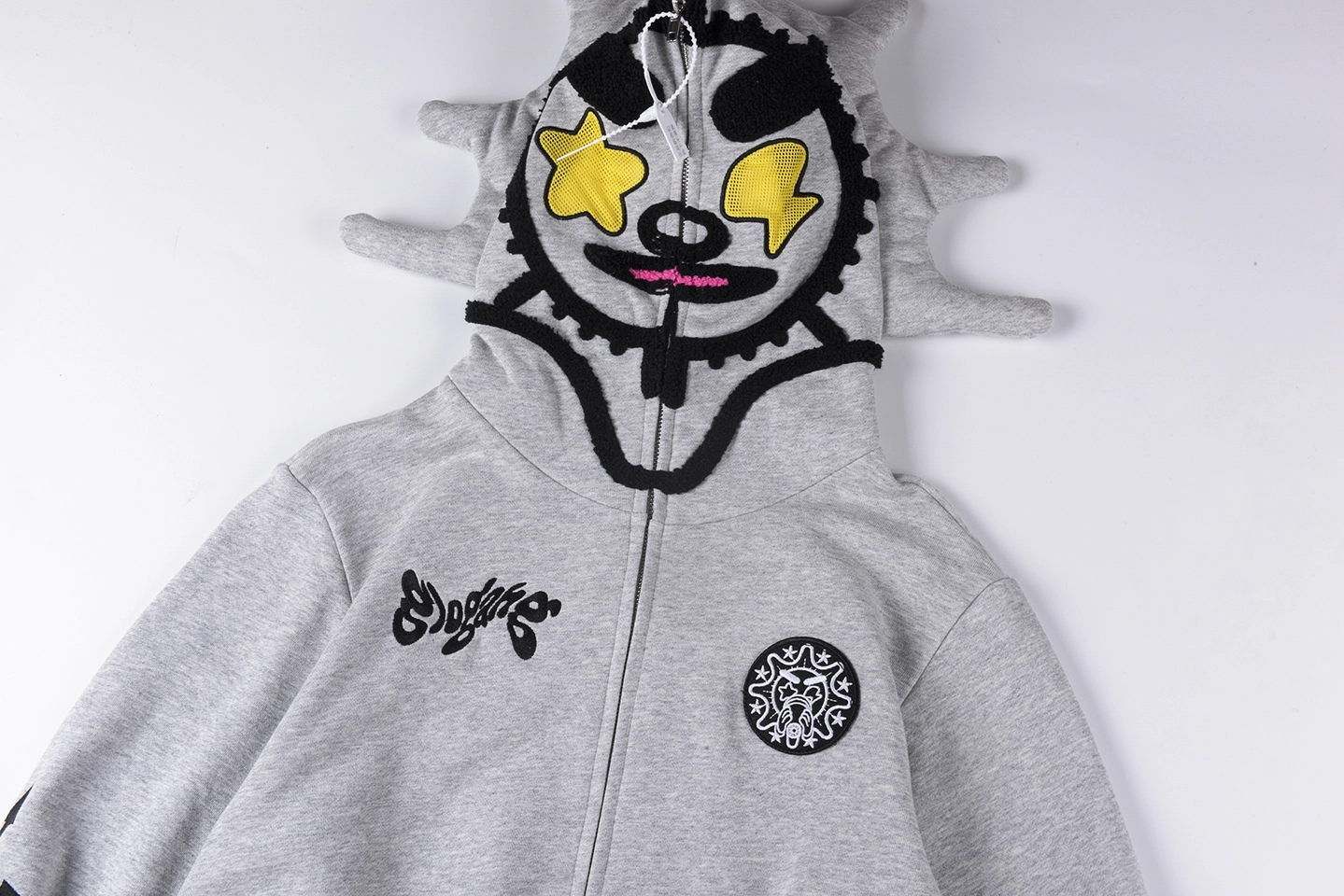 The Glo Gang “The Glory” Spiked Mask Full Zip Hoodie is a bold and eccentric piece that fuses urban streetwear style with creative flair. Featuring Glo Gang’s signature spiked hood design and a fully integrated zip-up face mask with bold embroidered facial details, this hoodie turns heads with its originality. Premium cotton blend fabric ensures warmth and comfort, while the embroidered back logo and directional sleeve prints enhance its visual impact. Perfect for those who want to make a strong fashion statement.