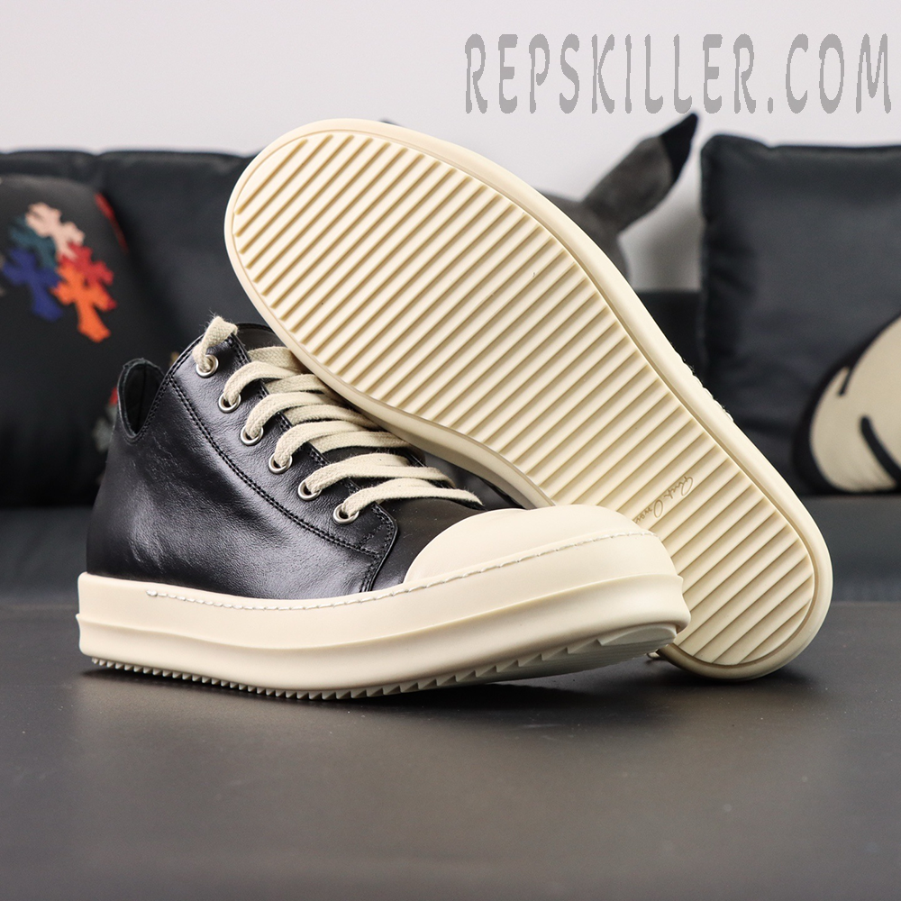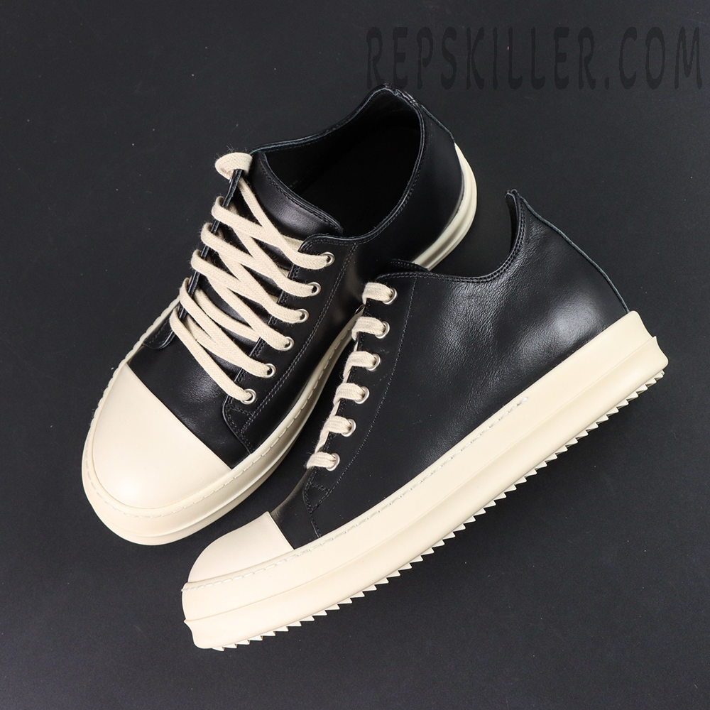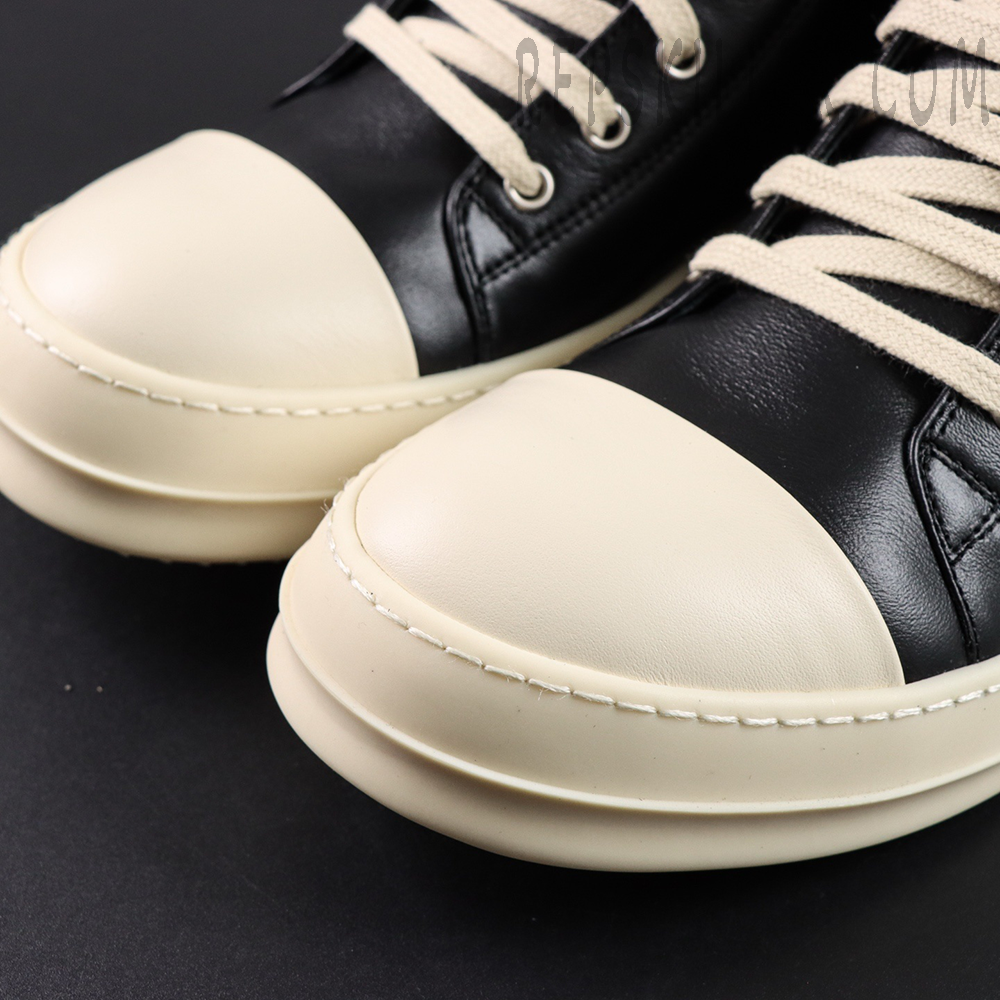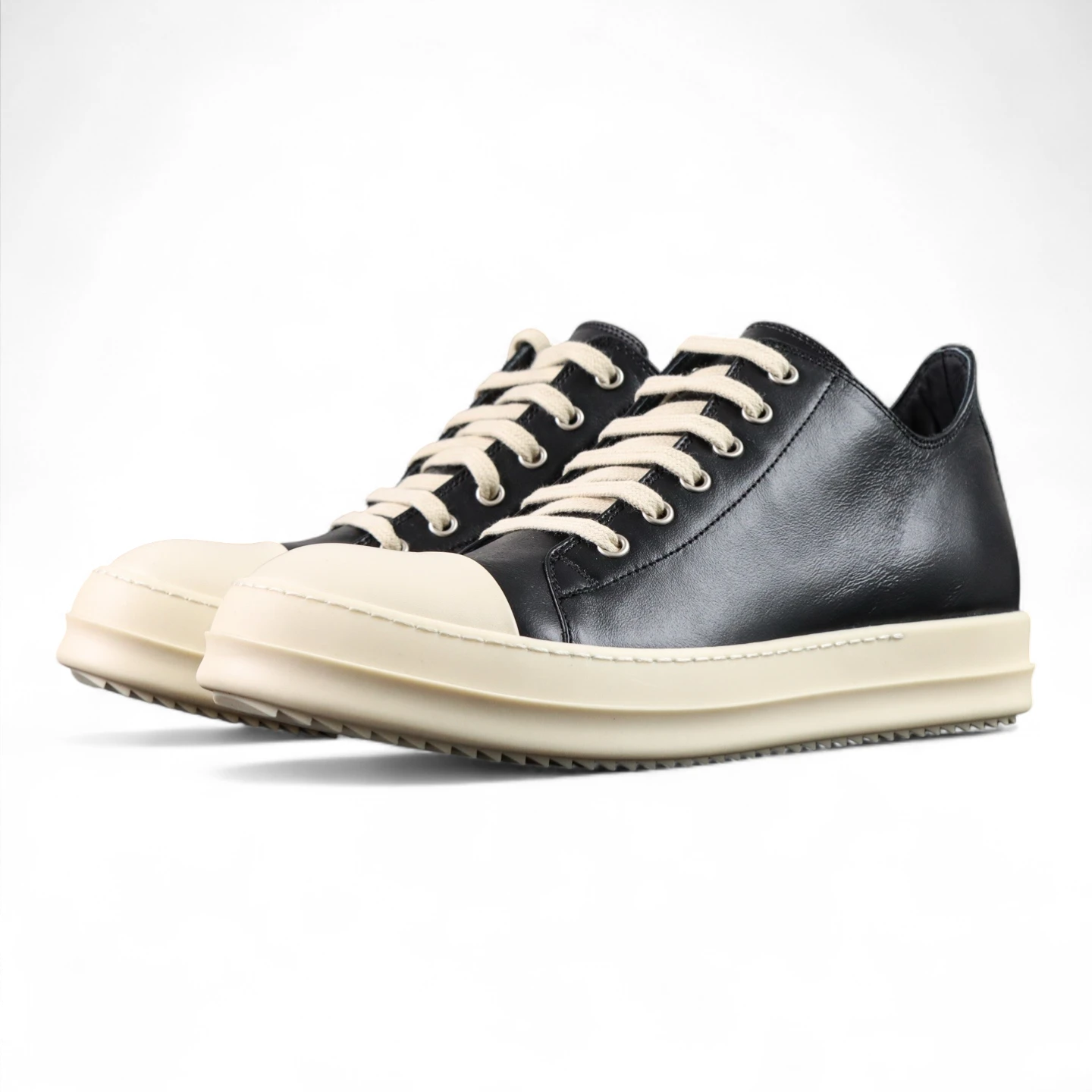 The Hollywood Low ‘Black Milk’ delivers a premium, minimal silhouette from Rick Owens’ sub-label DRKSHDW. The low-top sneaker features a smooth black calf leather upper paired with cream-toned (Milk) accents on the lace set and rubber toe cap. A thick, off-white exaggerated platform sole with a serrated tread reinforces the brand’s signature brutalist aesthetic while offering everyday comfort.