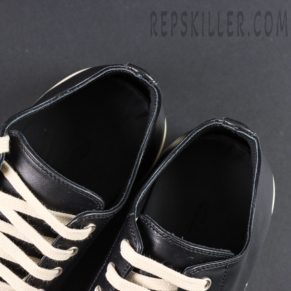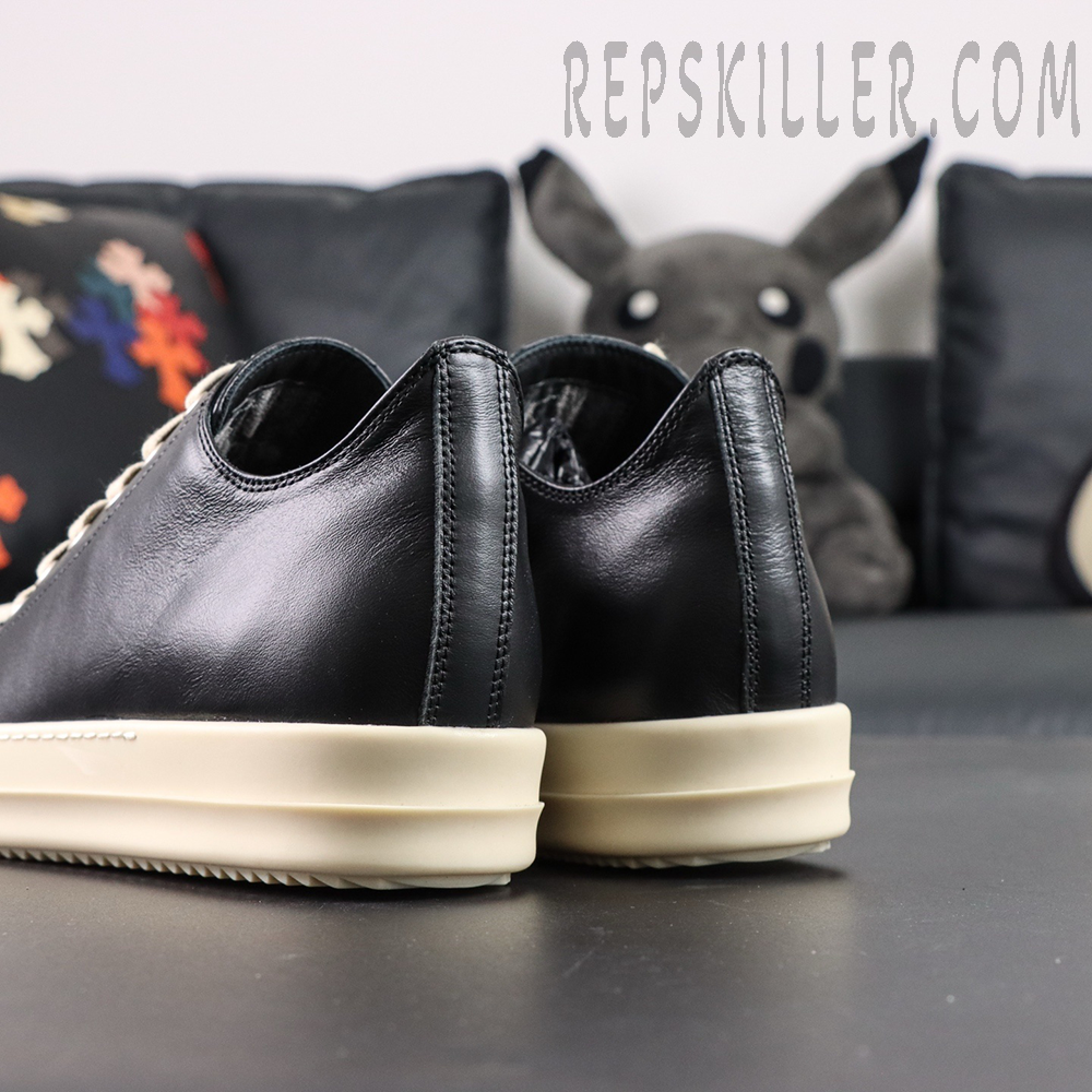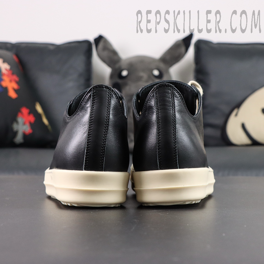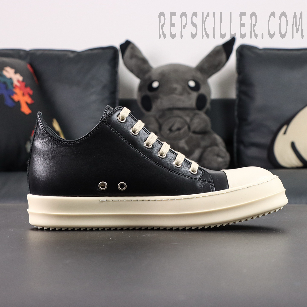 The Hollywood Low ‘Black Milk’ delivers a premium, minimal silhouette from Rick Owens’ sub-label DRKSHDW. The low-top sneaker features a smooth black calf leather upper paired with cream-toned (Milk) accents on the lace set and rubber toe cap. A thick, off-white exaggerated platform sole with a serrated tread reinforces the brand’s signature brutalist aesthetic while offering everyday comfort.