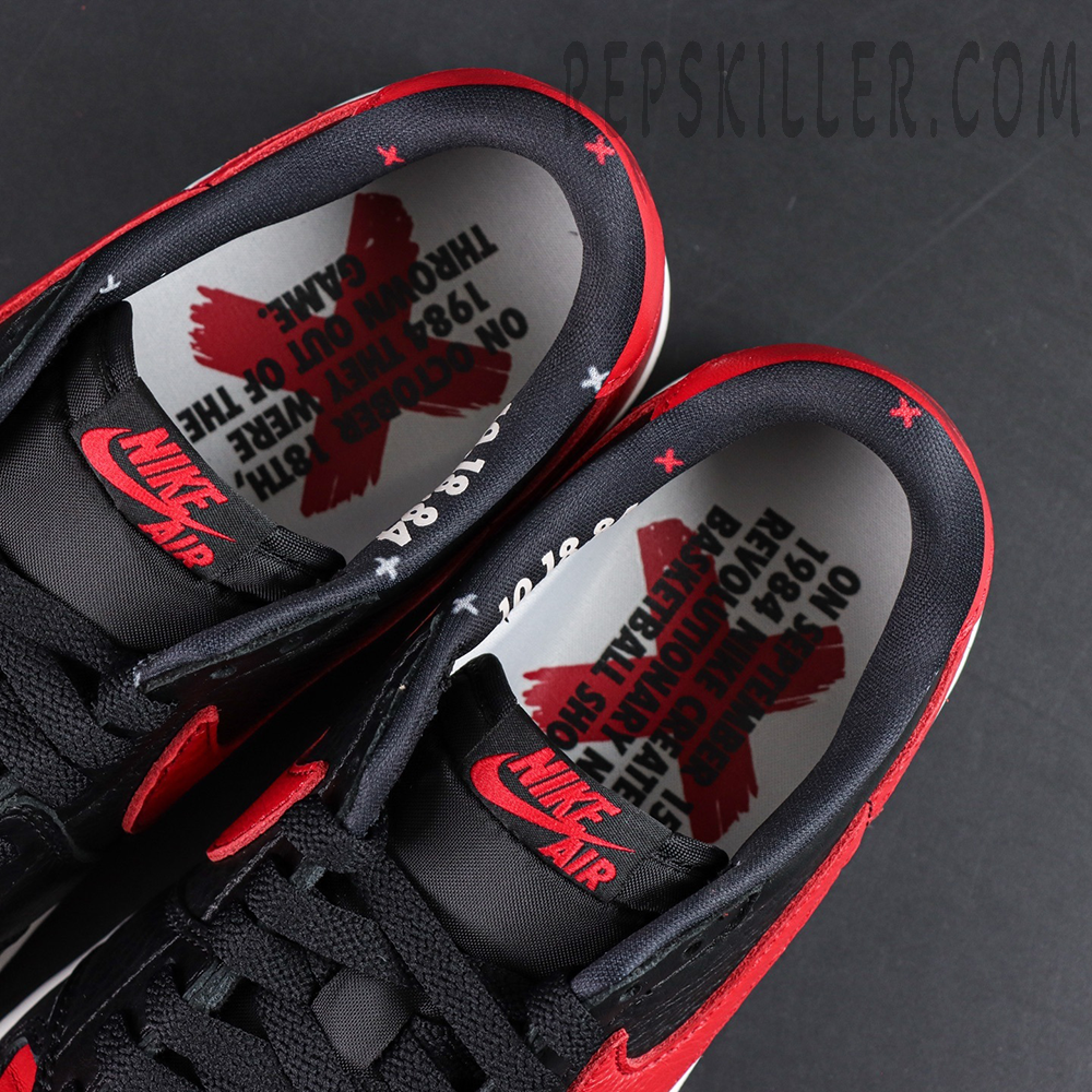 The upper is crafted from premium tumbled leather, featuring a bold black base contrasted by Varsity Red accents on the toe box, Swoosh, heel, and outsole. A standout detail is the tonal “X” on the heel tab, paying homage to the legendary “Banned” Air Jordan 1 High from 2011. The classic Nike Air woven tongue label adds an authentic OG touch.