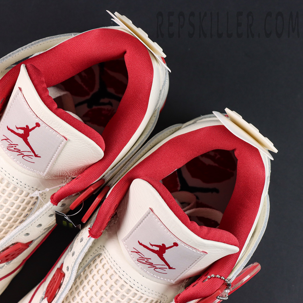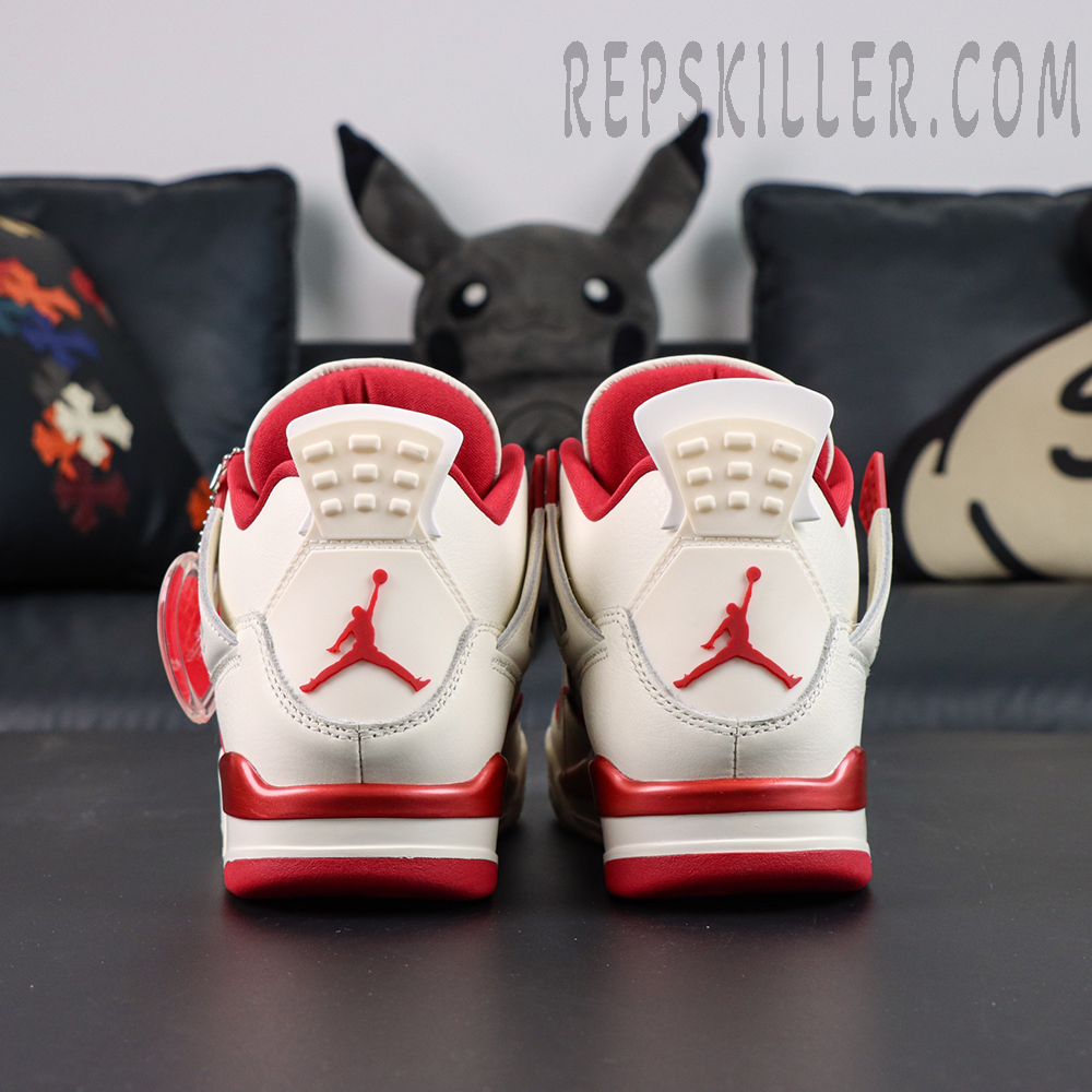The upper is crafted from premium off-white leather, offering a clean and elegant base that highlights the shoe’s refined aesthetic. Sierra Red accents add warmth and contrast across the molded eyelets, textile collar lining, and signature Jumpman branding on the woven tongue tag and heel tab. A translucent heart-themed hangtag further enhances the romantic concept, reinforcing its appeal among high-quality Jordan reps and Air Jordan 4 reps enthusiasts.