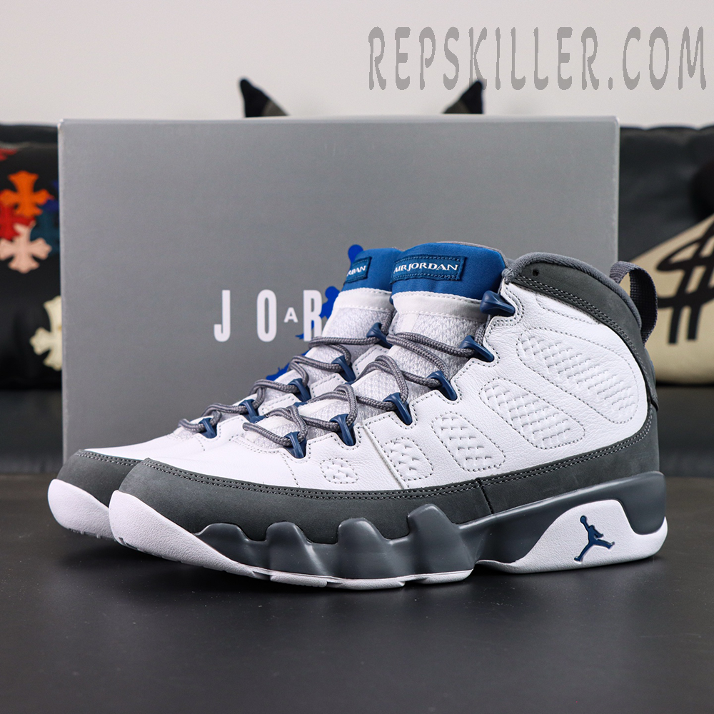 The upper features a premium white leather base paired with soft grey nubuck overlays, delivering a balanced mix of texture and durability. Signature stitched paneling along the sidewalls enhances depth and structure, while subtle French Blue accents appear on the Air Jordan tongue tag and the embroidered “23” on the heel, adding a refined pop of color that stays true to the original design. These details make the pair stand out among high-quality Jordan 9 reps and premium sneaker reps.