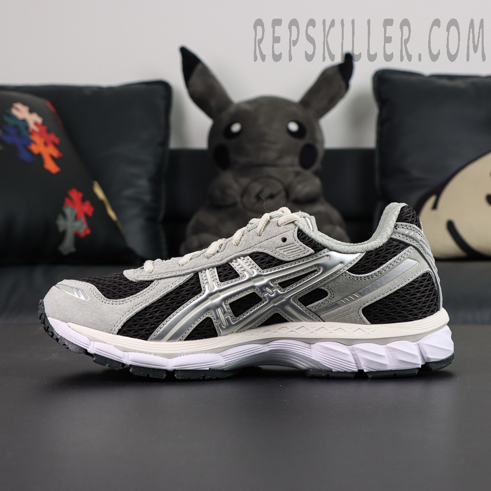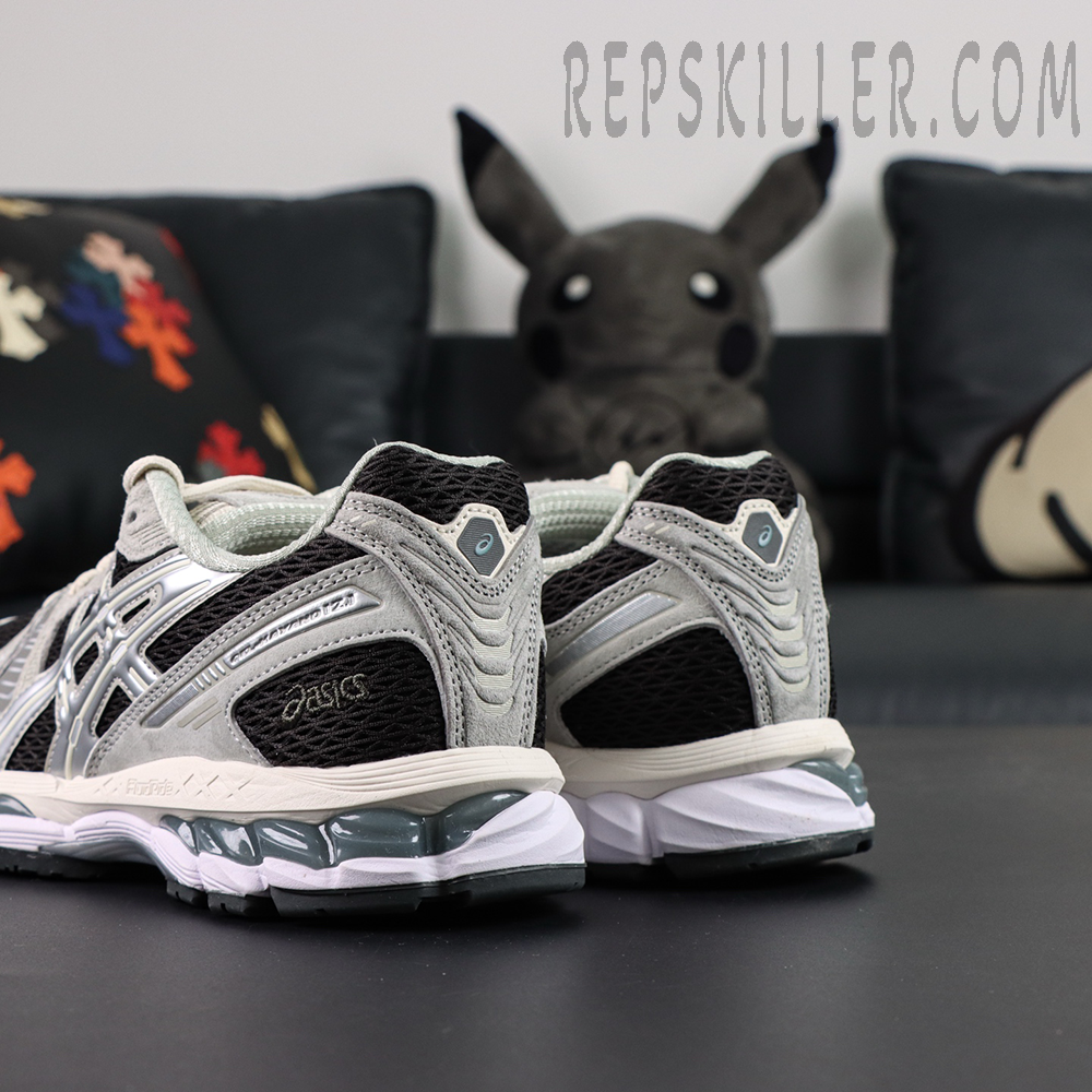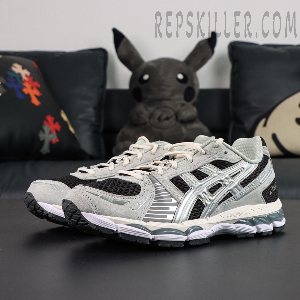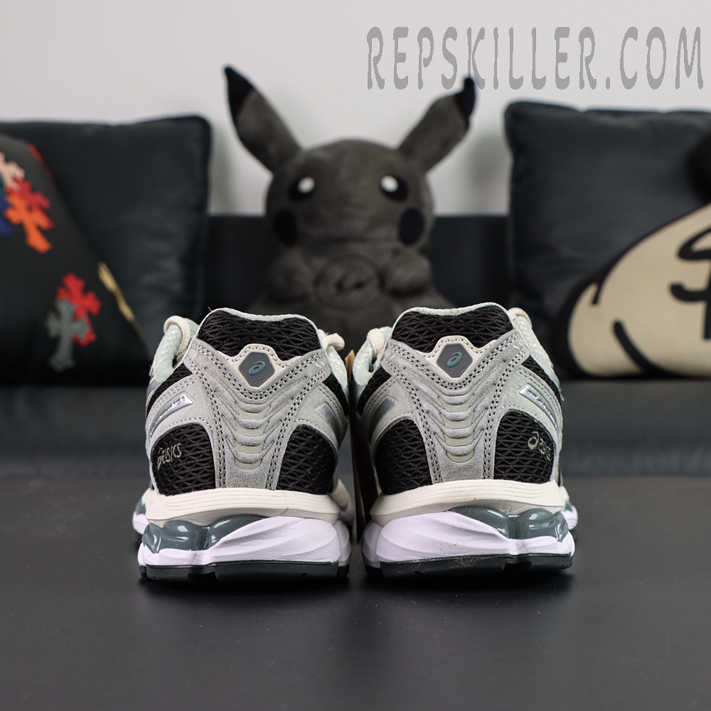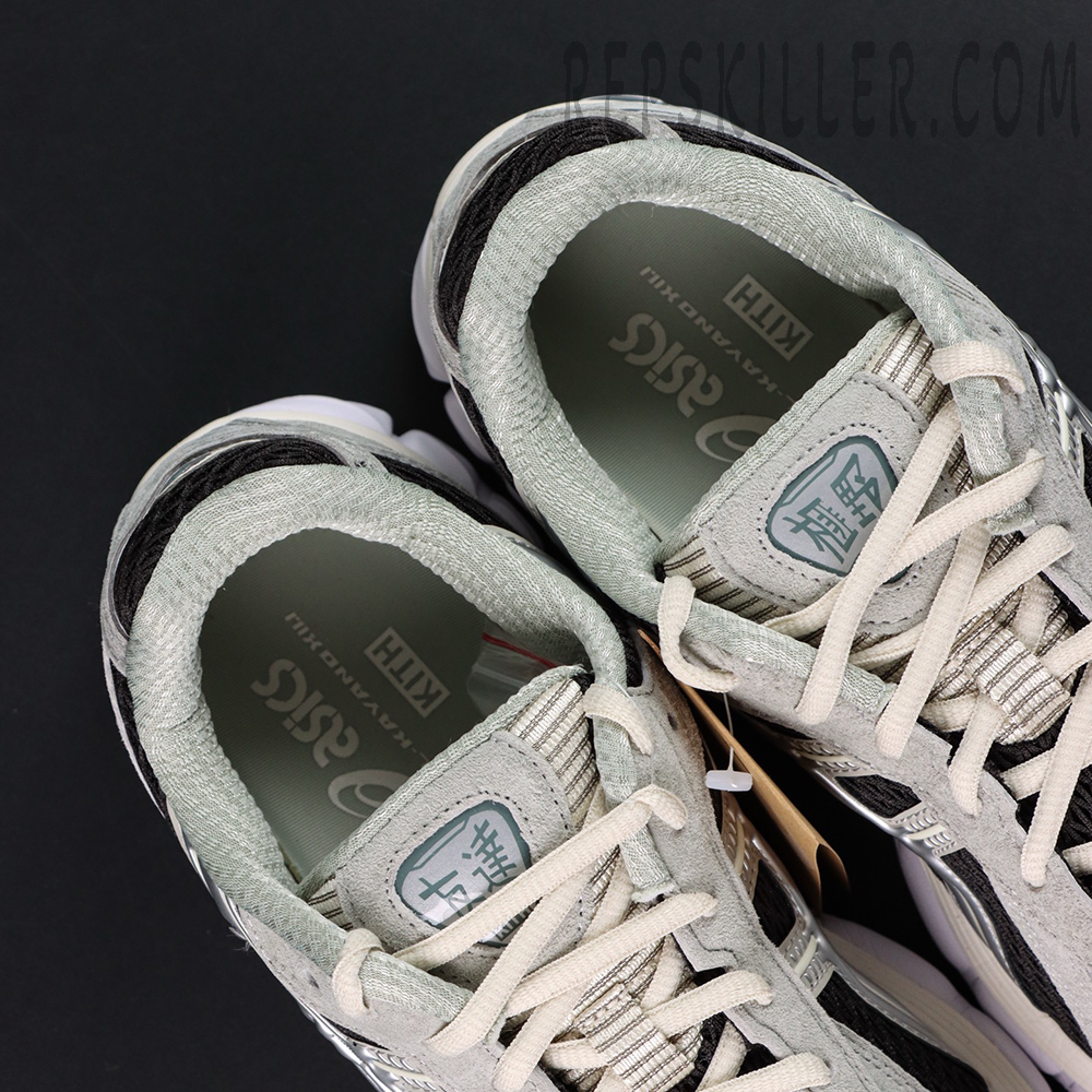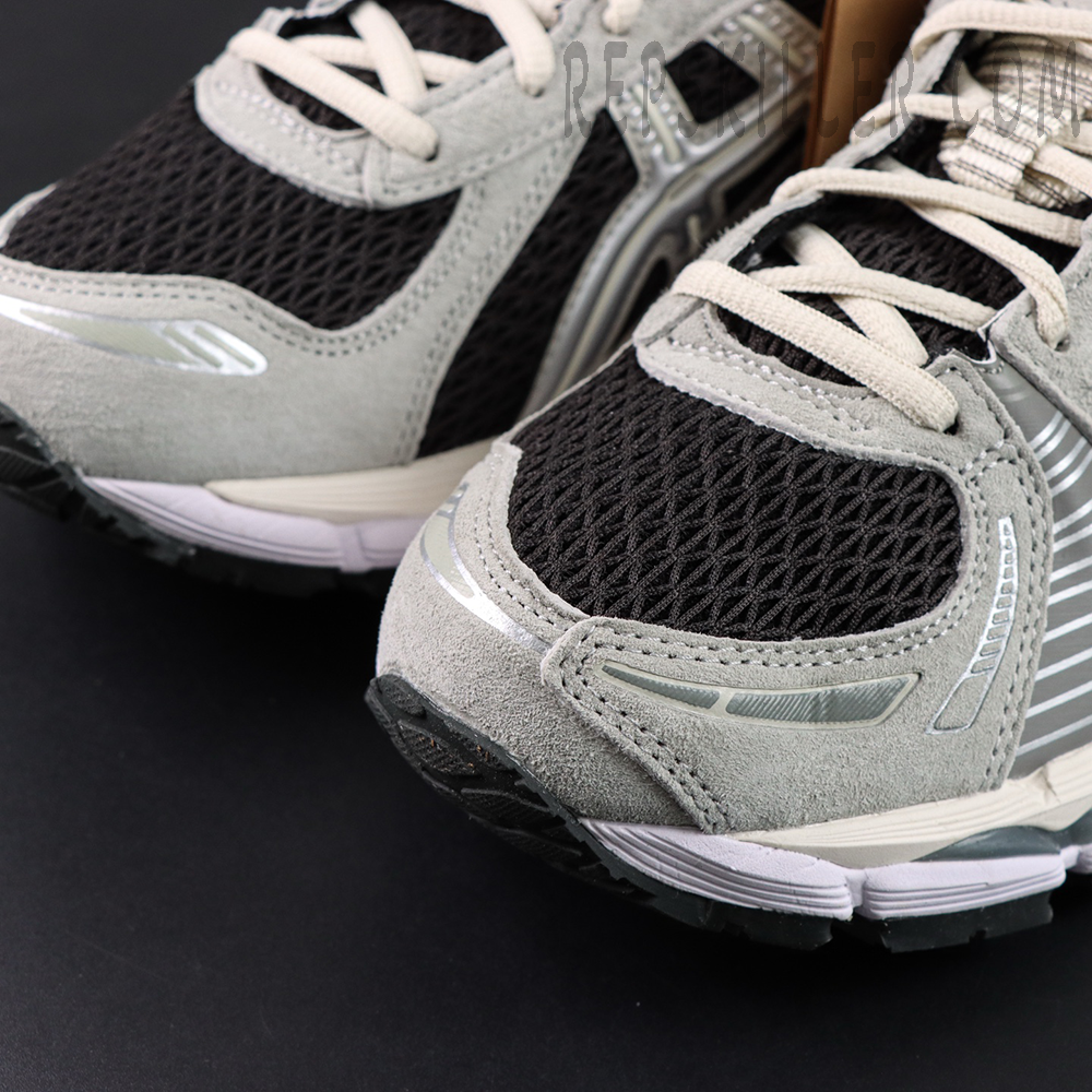 The upper features anthracite woven mesh, offering breathability and depth, while light grey suede overlays add a premium, textured contrast. Signature metallic silver ASICS tiger stripes elevate the look with a subtle futuristic edge. On the tongue, a triangular badge showcases the Japanese word “tomodachi” (friend) alongside Kith branding, reinforcing the collaboration’s community-driven message.