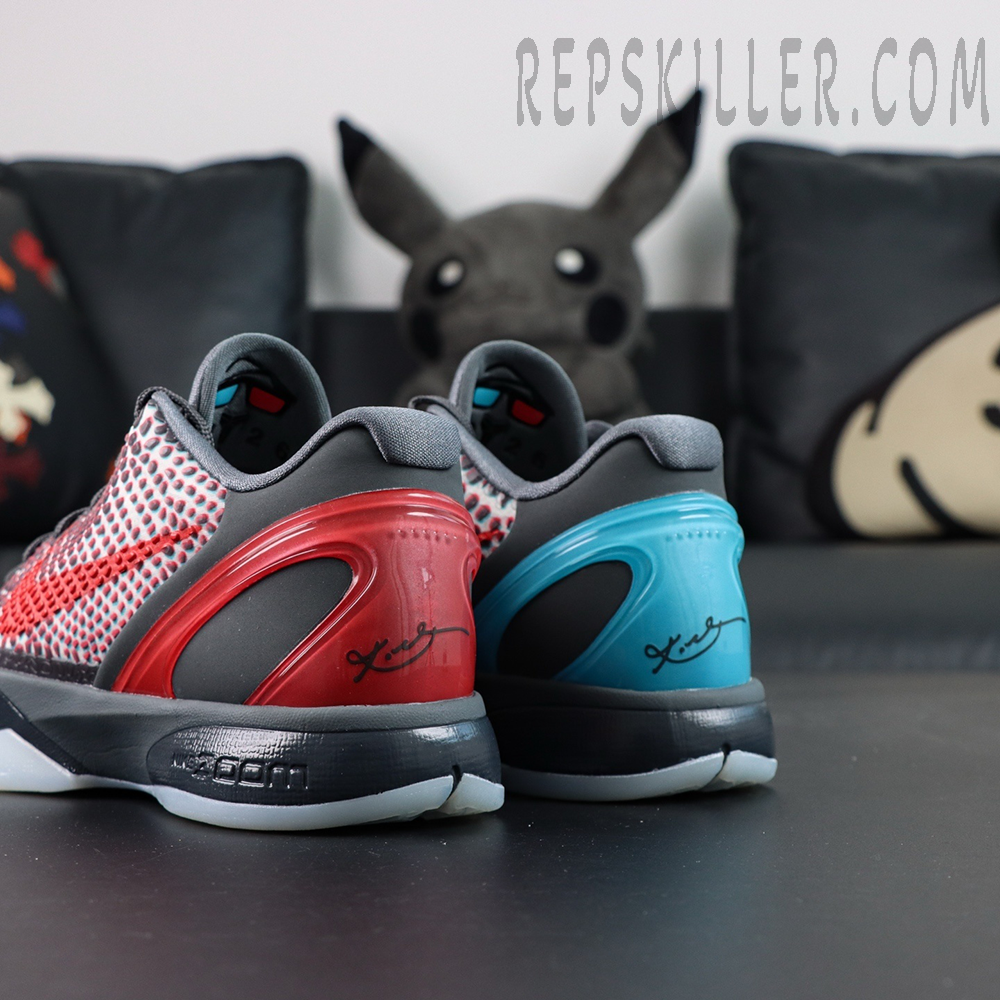 Built with the signature snakeskin-textured upper, the shoe features a grey base layered with raised crimson and blue-scaled detailing that delivers the unmistakable 3D illusion. A vibrant red Swoosh cuts across the lateral side, while contrasting hits on the tongue logos nod to the original All-Star theme. The low-cut silhouette maintains Kobe Bryant’s performance-driven philosophy, offering a sleek, court-ready profile engineered for speed and precision.