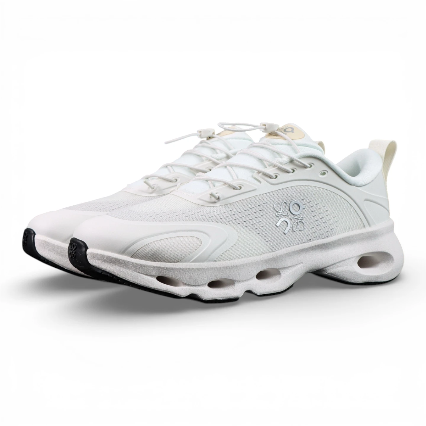 The upper is constructed from breathable technical mesh in a crisp white tone, complemented by smooth light grey structural overlays that enhance durability while maintaining a sleek, understated look. L’s iconic anagram logo is subtly placed on the lateral side, reinforcing the collaboration’s luxury identity without overpowering the design. A streamlined speed-lacing system ensures a secure, adaptive fit, blending functional innovation with contemporary style—an essential detail for top-tier L x ON Cloudsolo reps.