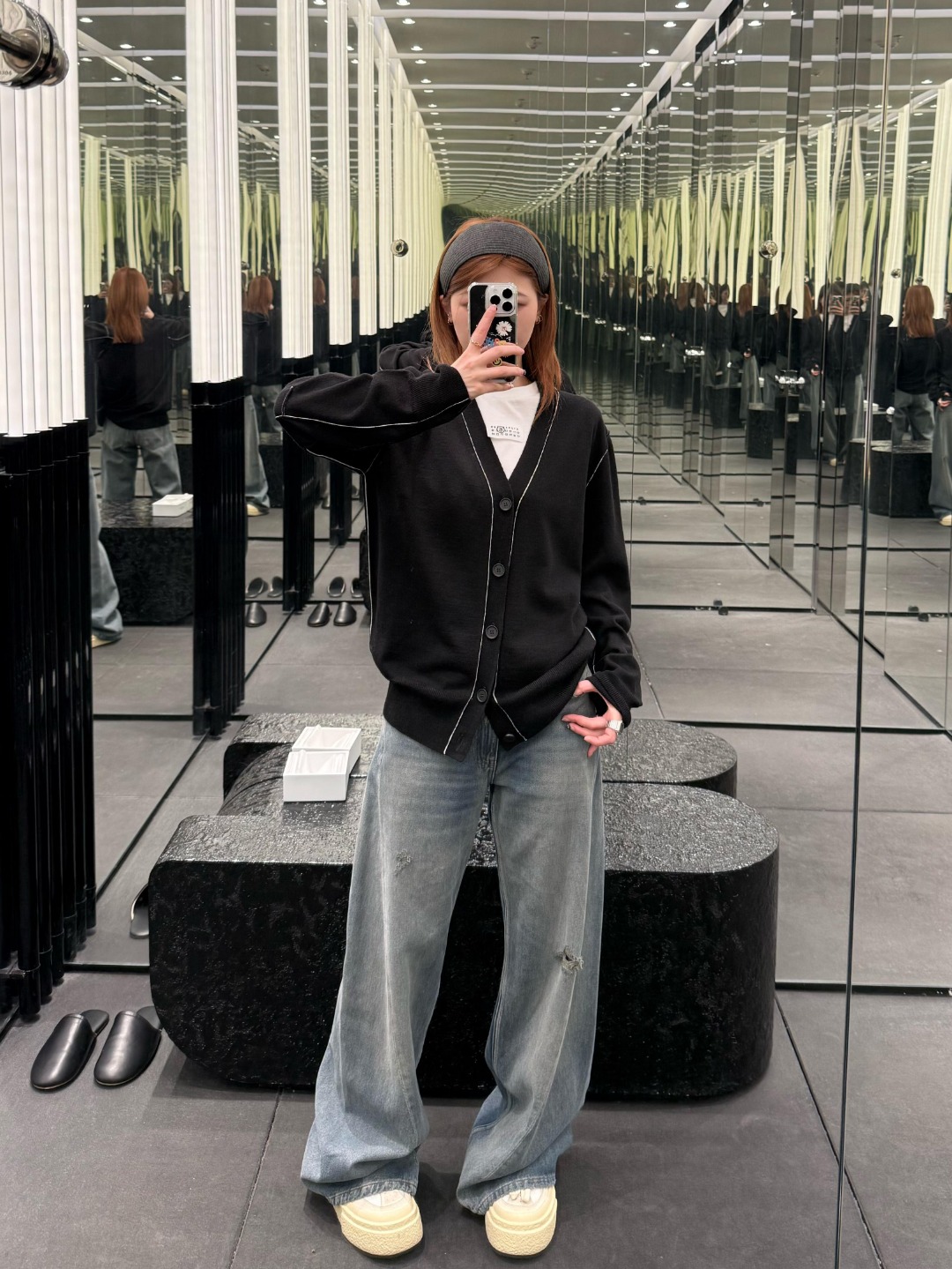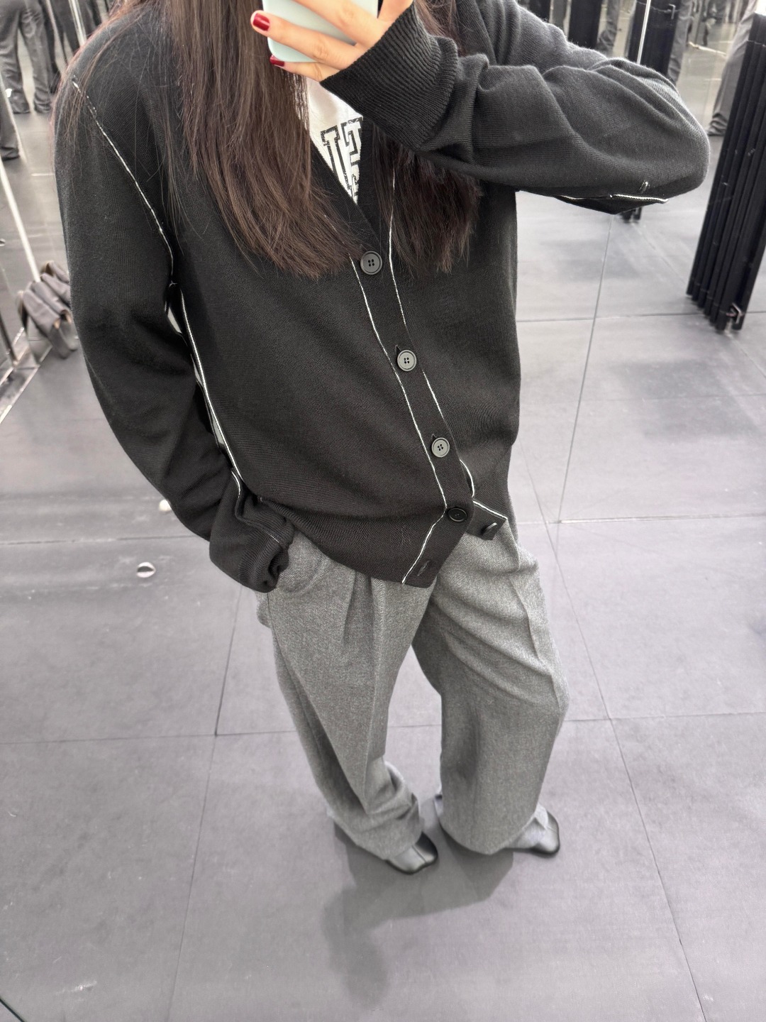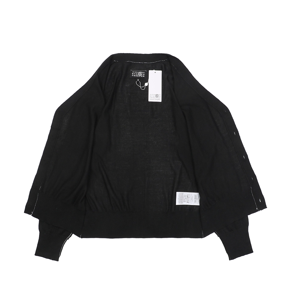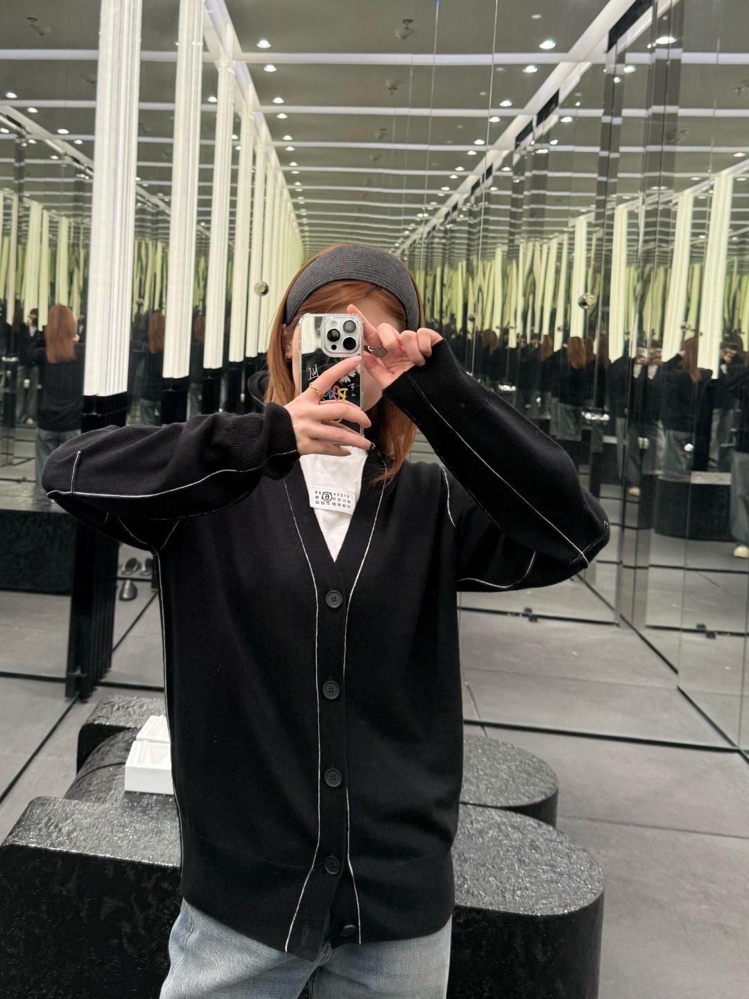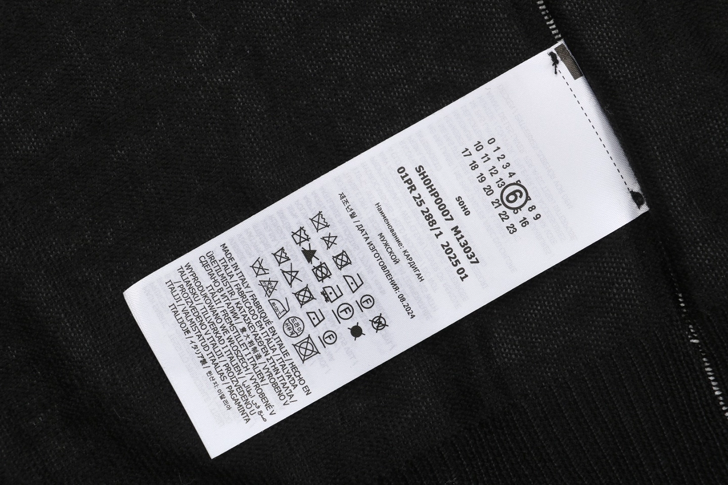 The Maison Margiela Contrast Stitch V-Neck Cardigan is crafted from a premium blend of 30% wool, 40% nylon, and 30% acrylic, delivering a soft, warm, and durable texture. Knitted using a German Stoll 12-gauge machine, the surface remains smooth, structured, and high-quality. Maison Margiela’s signature inside-out construction and chain-stitch seaming ensure comfortable wear with reinforced durability. The relaxed shoulder design enhances a modern, effortless look, while the distinctive contrast stitching highlights the brand’s iconic minimalist aesthetic. This cardigan is perfect for everyday wear, layering, and refined seasonal styling.