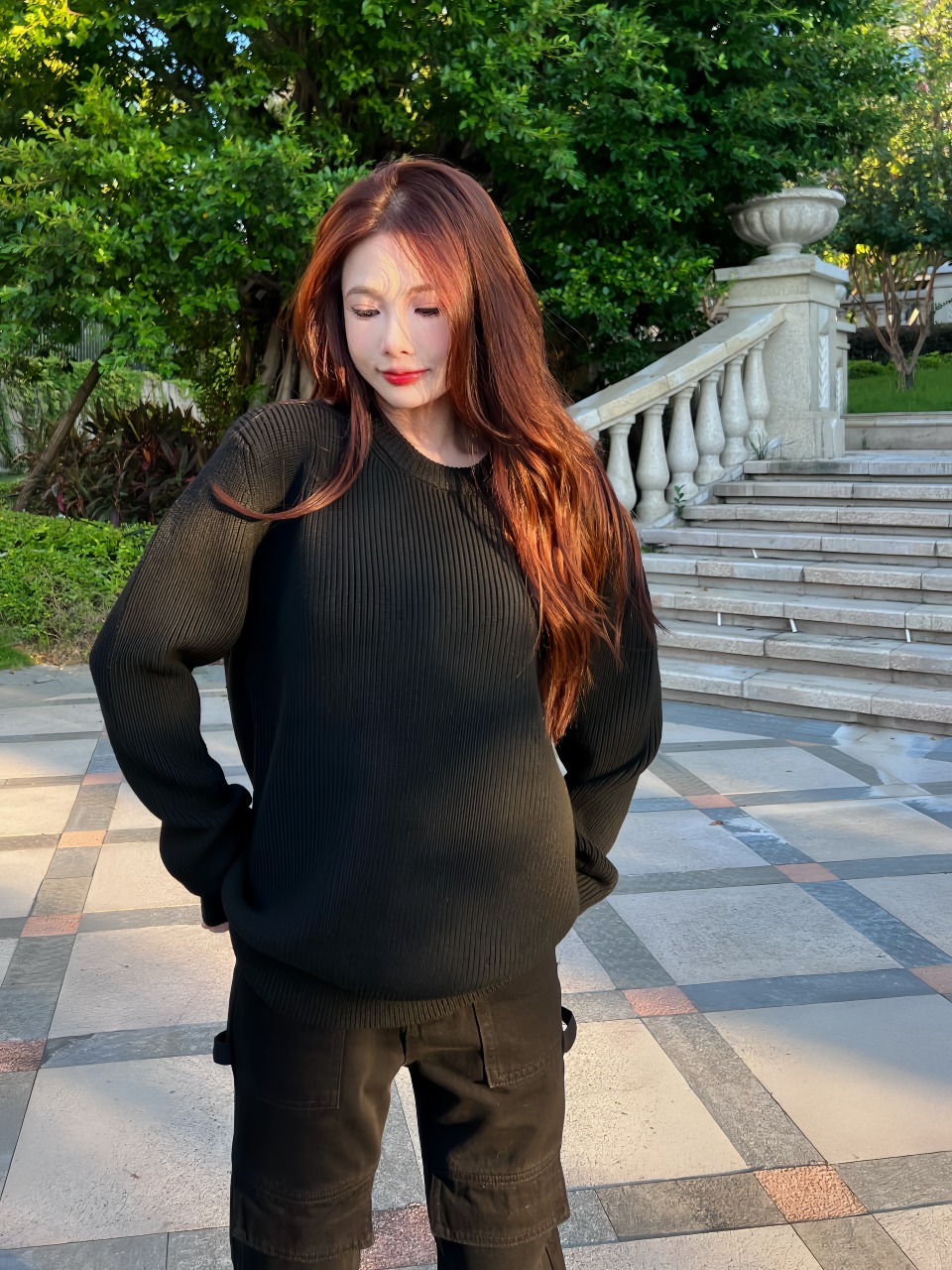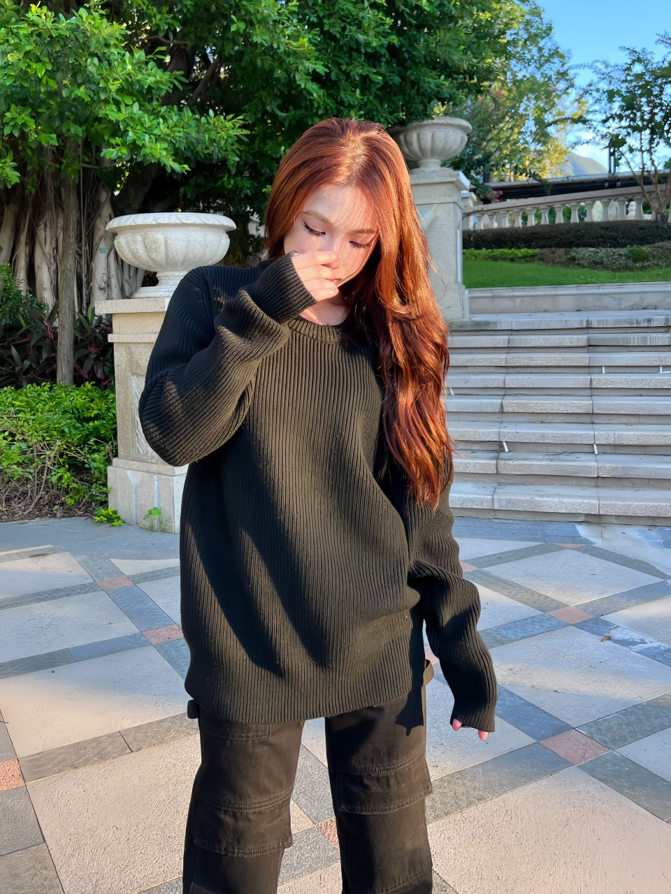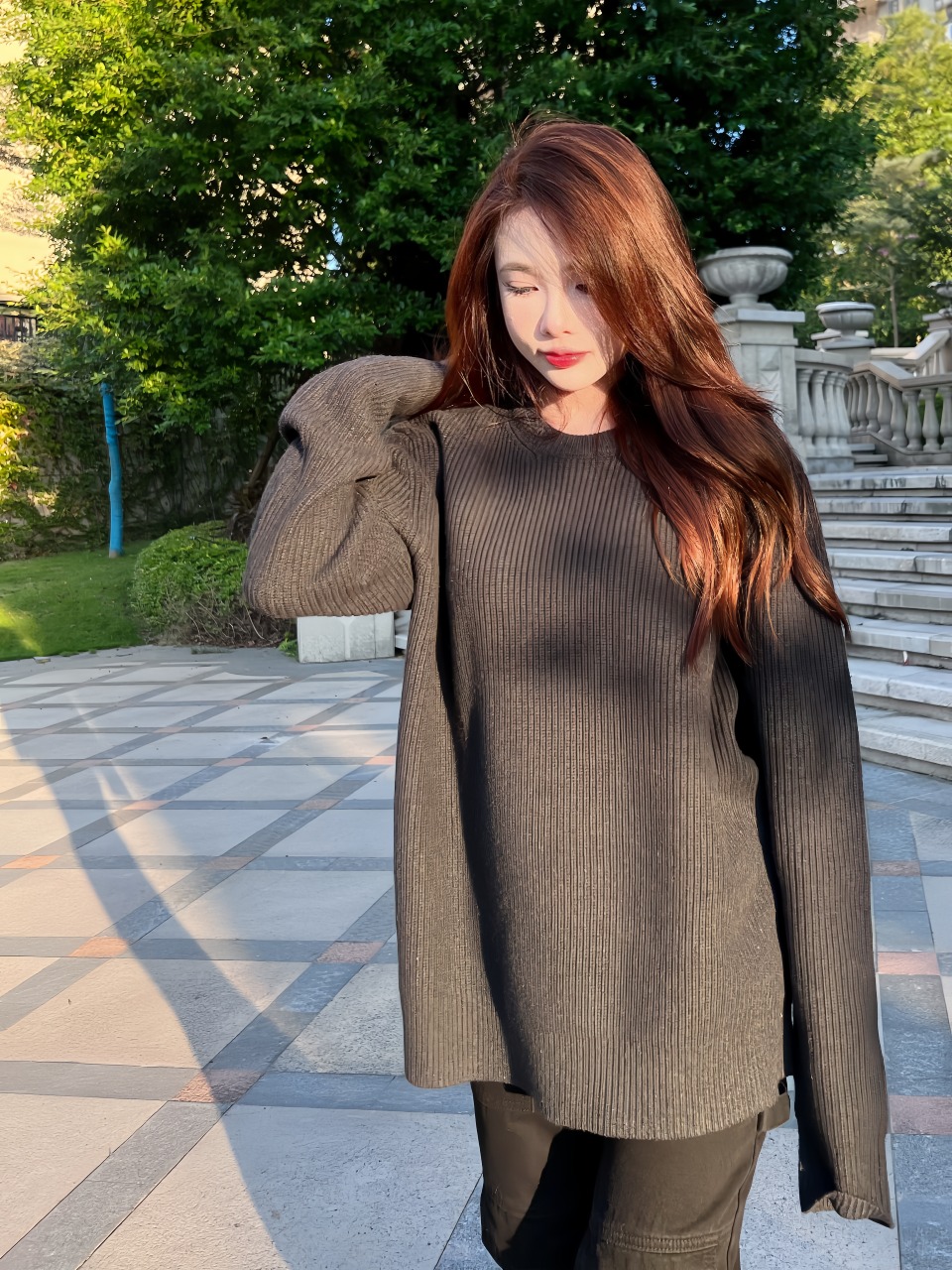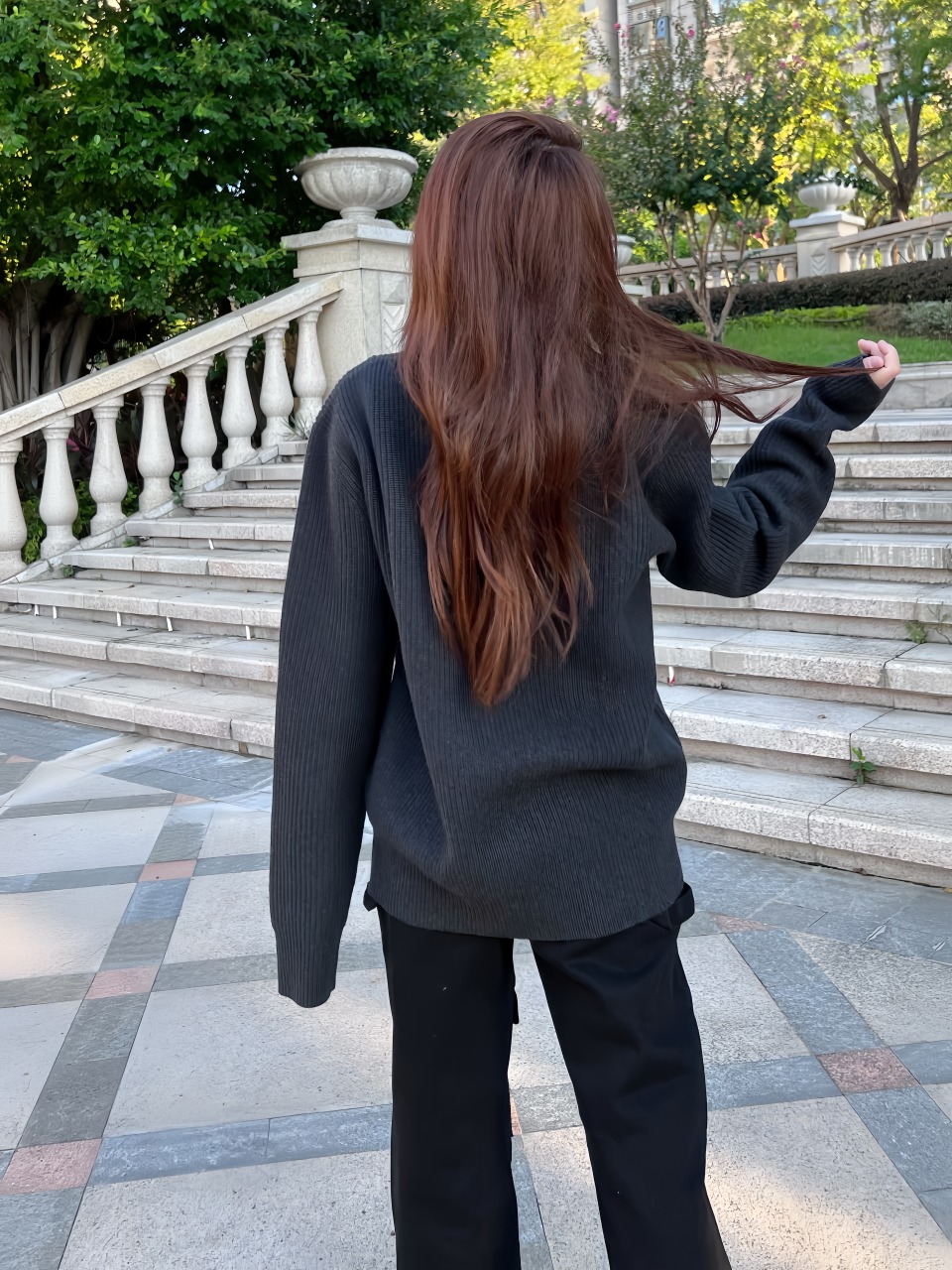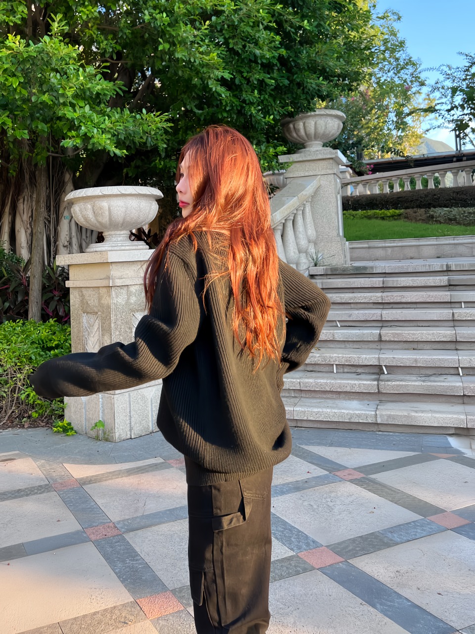 The piece features 1×1 double-layered ribbing along the collar, cuffs, and hem for enhanced structure and elasticity, preventing deformation over time. The single-piece fish-scale knitting construction, combined with a washed softening process, creates a relaxed drape and elevated cozy feel.
