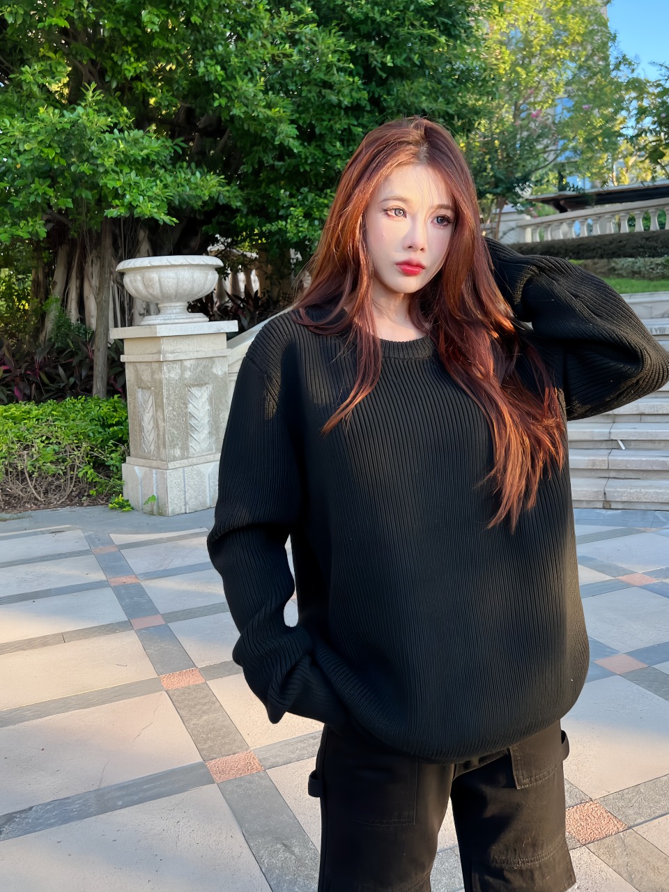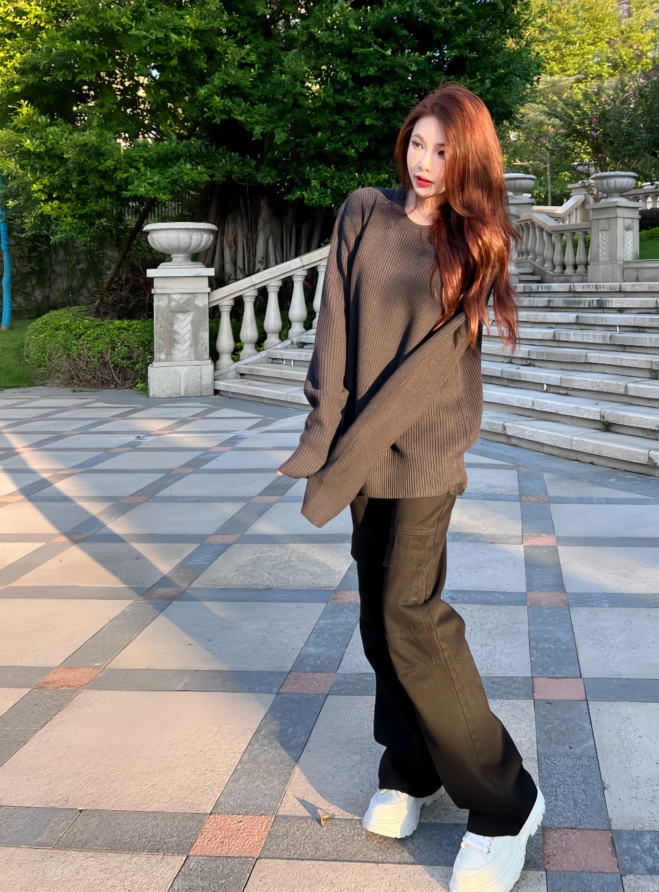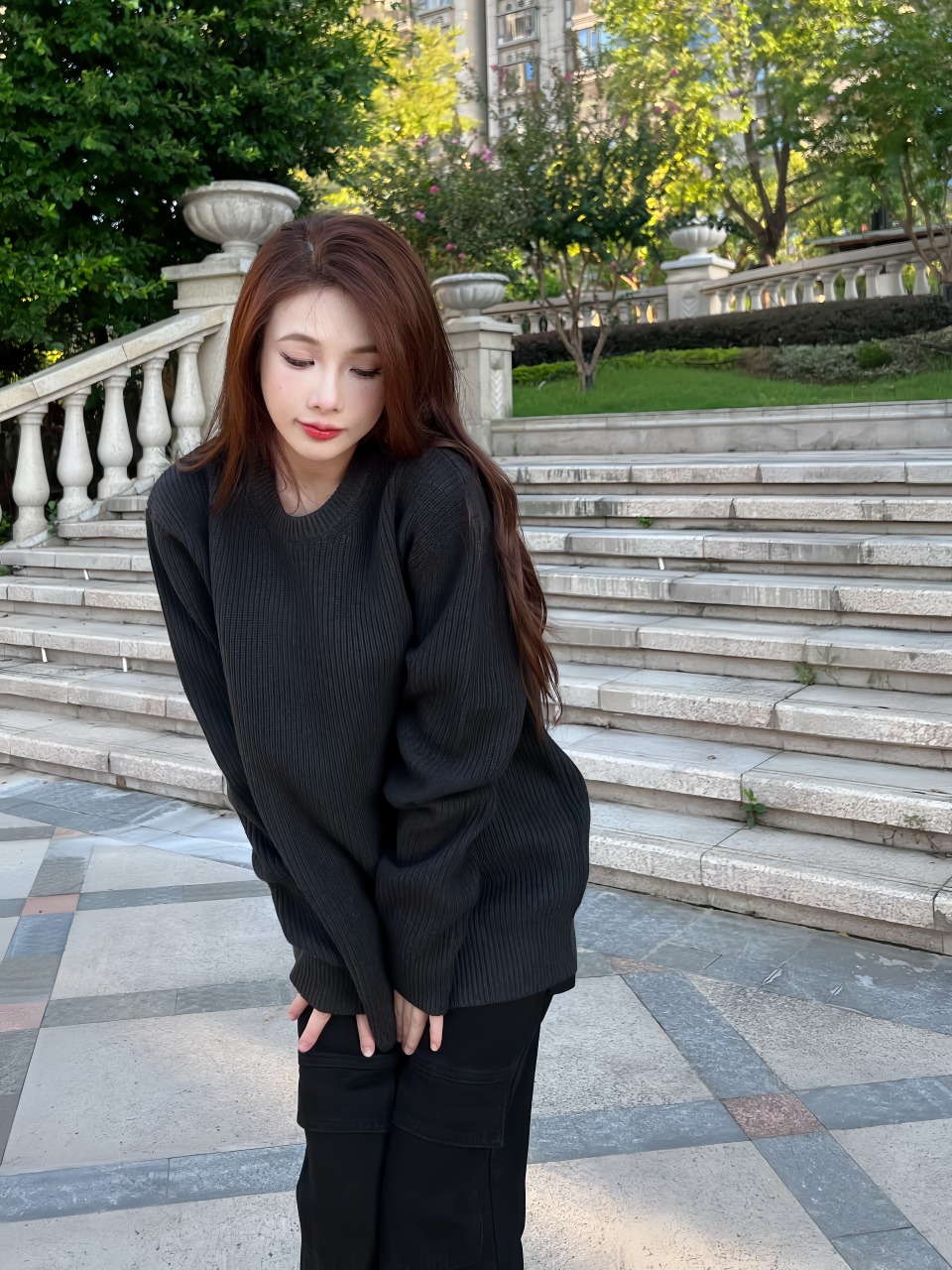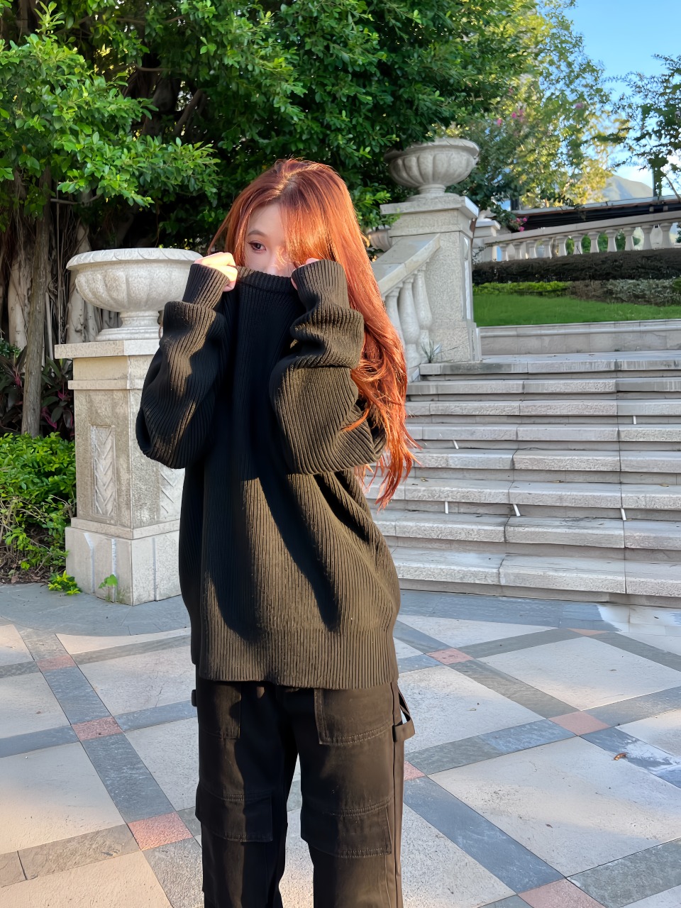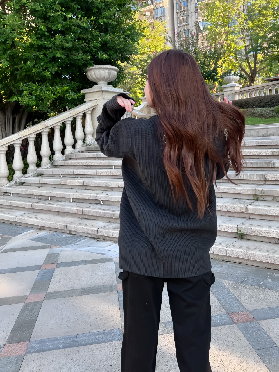 The piece features 1×1 double-layered ribbing along the collar, cuffs, and hem for enhanced structure and elasticity, preventing deformation over time. The single-piece fish-scale knitting construction, combined with a washed softening process, creates a relaxed drape and elevated cozy feel.